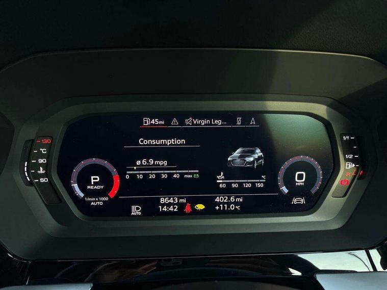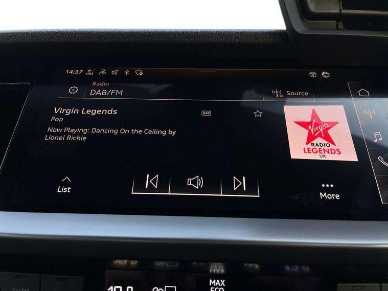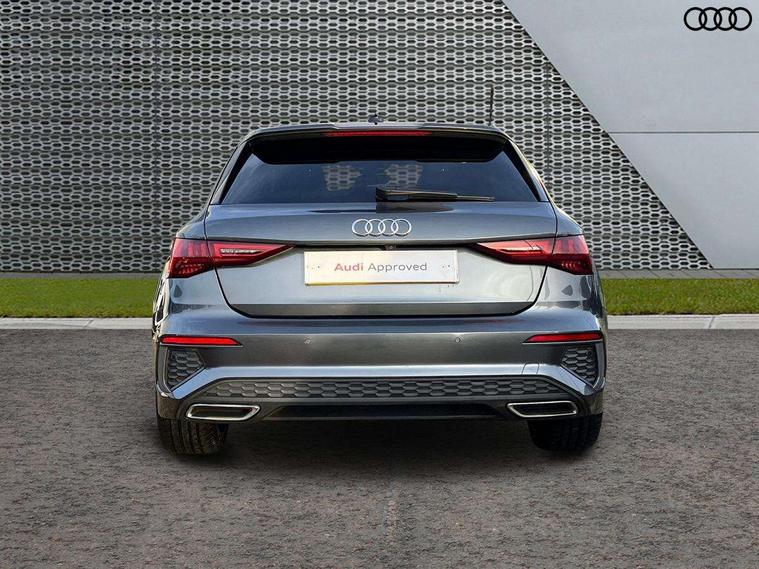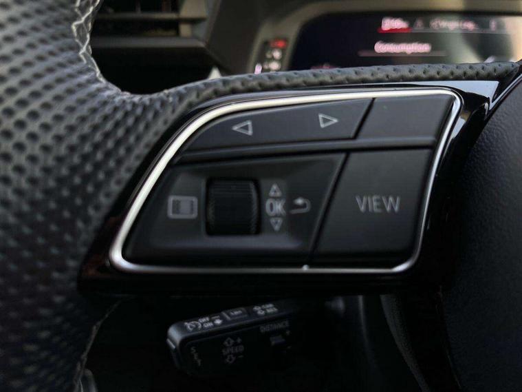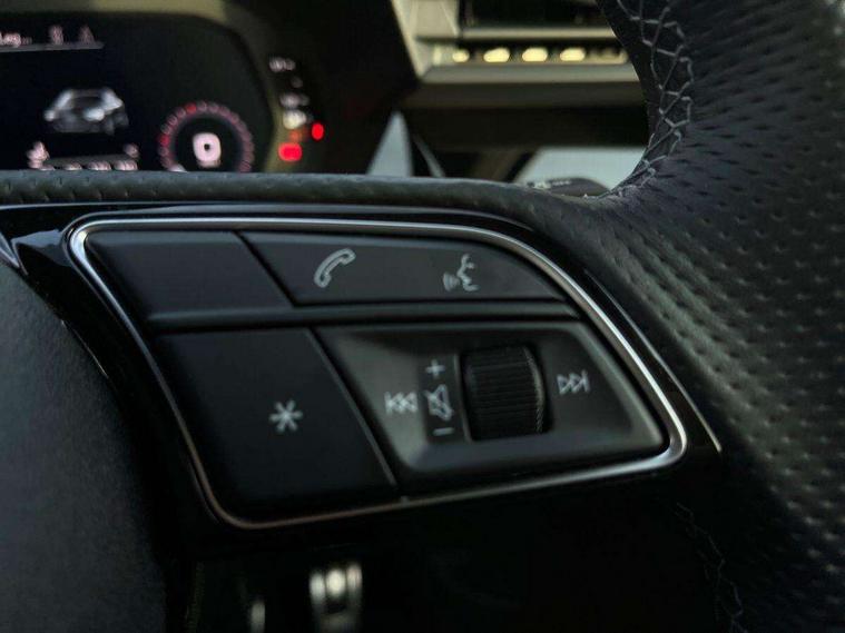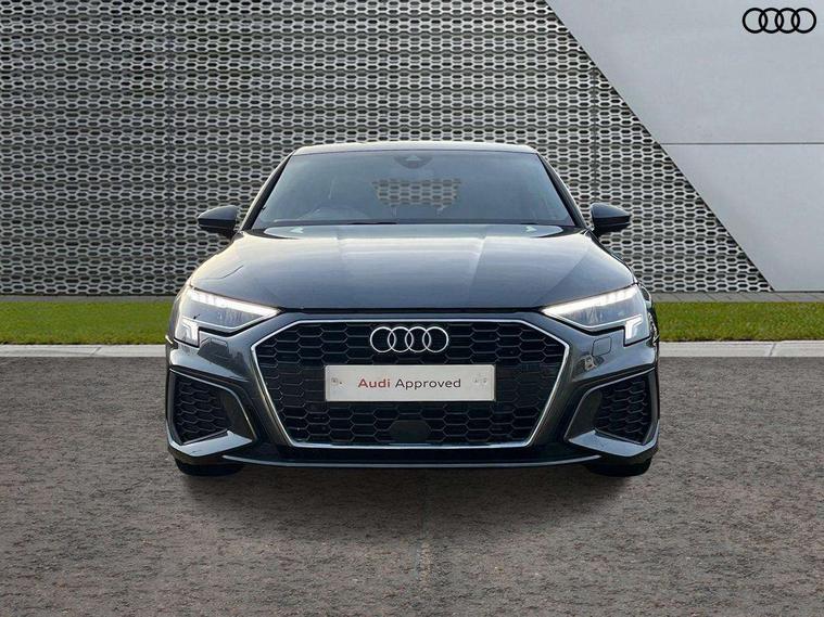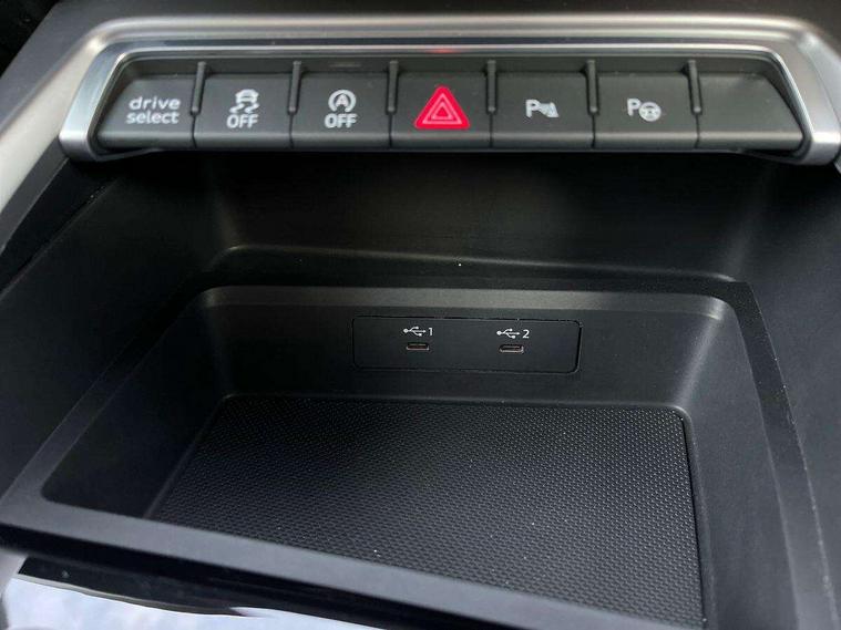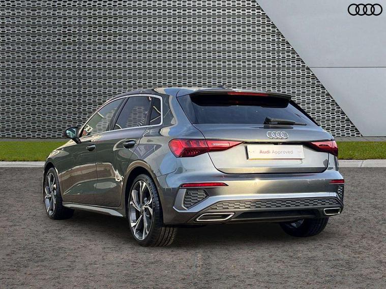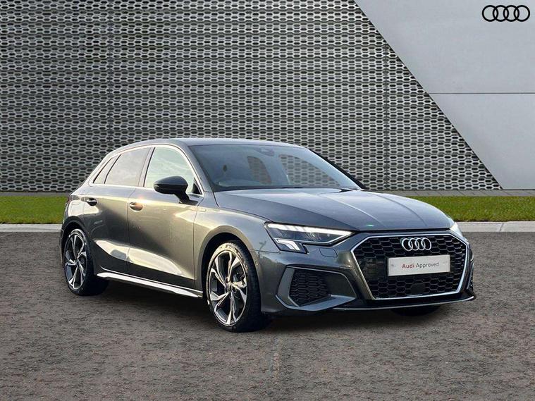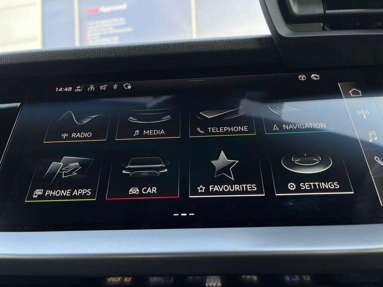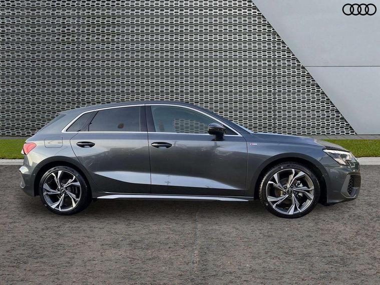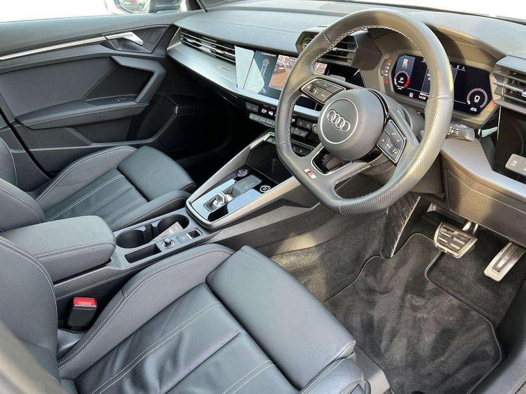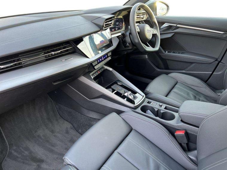Audi drive select (Auto, Comfort, Dynamic, Efficiency and Individual), Audi smartphone interface, Audi Virtual Cockpit - 10.25" digital and colour instrument cluster, Automatic start/stop system with recuperation, Bluetooth interface, Collision avoidance assistant, e-Call (emergency call), Electromechanical power speed sensitive steering, Lane departure warning system, MMI Navigation Plus with high resolution 10.1" colour touch screen display, Service indicator, Trip computer, Voice control system with natural language interaction, Sports suspension, 2xUSB-C connection with data and charging functions, 6 passive loudspeakers, DAB Digital radio, 3rd brake light, Acoustic glass windscreen, Aluminium window trim, Auto dimming frameless rear view mirror, Body colour exterior mirrors, Electrically adjustable/heated/folding/auto dimming door mirrors with integrated LED indications + kerb view function for passenger side, Front electric windows, Illuminated aluminium inserts front door sills with S logo, LED daytime running lights, LED headlights with LED rear lights and dynamic rear indicators, Light and rain sensors, Privacy glass - dark tinted rear window, rear door and side windows, Rear electric windows, Rear side air outlets in grained matt black, Rear side wing doors, Rear wiper, S line bumpers, S roof spoiler, 12V socket and storage compartment in front centre console, 3 seat bench in 2nd row, 3 spoke leather multifunction steering wheel with paddle shift, 4 way electrically adjustable lumbar support for driver and front passenger, 60/40 split folding rear seat bench, Black cloth headlining, Dual zone electronic climate control, Front and rear centre armrest in leather, Front and rear headrests, Front/rear floor mats, Height and reach adjustable steering wheel, Interior lighting - glove compartment light and right hand side, Luggage compartment floor covering, Manual boot compartment lid, Manually adjustable front seats, Seat side bolsters, Single front passenger seat, Stainless steel pedals and front footrest in black, Twin leather upholstery with front sports seats S embossed logo, Aluminium interior elements pack - A3 Sportback, LED interior lighting pack - A3 Sportback, S line styling pack - A3 Sportback, 3x3 point rear seat belts, Driver and front passenger airbag with passenger airbag deactivation, Electronic Stabilisation Control (ESC) including ABS, ASR and EDL, First aid kit with warning triangle and 2 safety vests, Front side airbags with head airbags and interaction airbag, Pre-sense front with pedestrian and cyclist detection, Seatbelt monitoring, Tyre pressure loss indicator, Anti theft alarm, Anti-theft wheel bolts, Electronically operated child lock, Immobiliser, Remote control central locking, Dark spectrum aluminium inlays, accent surfaces in the dashboard and centre console in platinum grey silk effect paint finish,