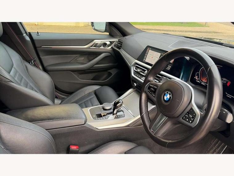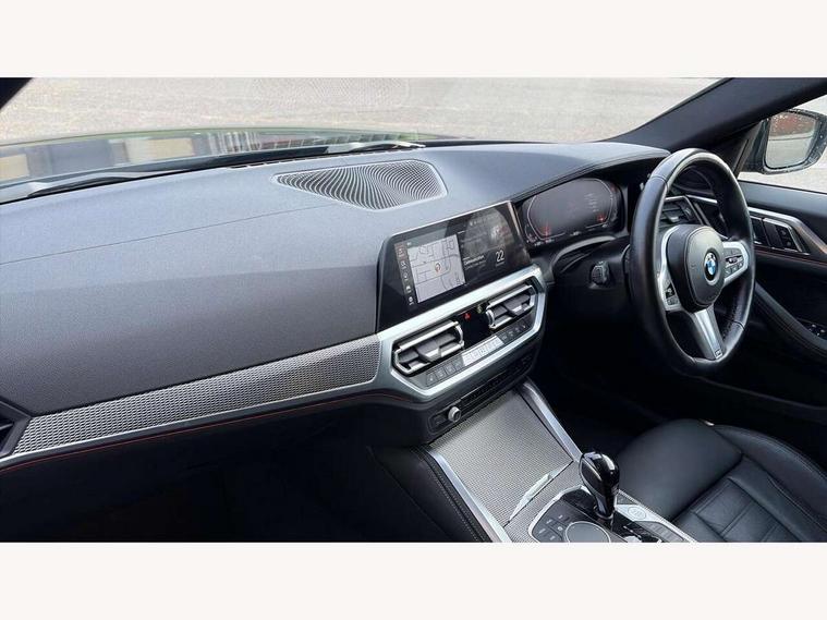Active guard plus, Attentiveness assist, Auto start-stop, BMW ConnectedDrive online services, BMW iDrive controller on centre console, BMW Live Cockpit Professional Nav with 12.3" instrument display + 10.25" display, Intelligent Voice Assist, BMW OS 7, HDD, 2USB, 4G LTE connect, BMW service history, BMW Teleservices, Brake pad wear indicator in front and rear, Check Control warning system for monitoring of lights and door/luggage compartment open warning, Condition based service, Cruise control with brake assist, Electric bootlid, Electric power steering with Servotronic steering optimised at all speed ranges, Gearshift time display in manual mode, Instrument cluster with speedometer with mph readout, tachometer, fuel gauge and oil temperature gauge, Integrated owners handbook, Oil sensor for level and grade, warning by check control system, On board computer - average speed, fuel consumption, outside temp display with acoustic warning, clock/date, service interval, odometer/trip meter, Optimum shift indicator, Variable sport steering, 8 speed automatic steptronic transmission with gearshift paddles, Double VANOS, Driving experience modes - Comfort, ECO PRO, Sport and Sport+ mode, High precision injection, Low centre of gravity, M sport suspension, Petrol Particulate Filter, Stroke dependent dampers, VALVETRONIC engine management, DAB tuner, Electronic service booklet, 3rd brake light, Acoustic glazing, Automatic headlight beam throw control with load dependent regulating reaction, dynamic compensation of braking dive and acceleration squat, Automatic windscreen wipers and automatic headlight, Automatically dimming electrochromatic rear view mirror, BMW emblem on engine compartment lid and tailgate, BMW kidney grille with mesh grille front side of the nuggets in matt aluminium and frame in chrome high gloss, Body colour fuel filler flap, Body colour M sport rear spoiler, Body colour roof fin, Brushed aluminium inserts in the front door sill finishers with BMW designation, Dynamic brake lights, Electric windows - front and rear, with open/close fingertip control, anti trap facility and comfort closing function all round, Exhaust tailpipe - split left and right, Exterior mirrors - electrically folding with anti-dazzle, Fading support, Follow me home headlights, Front and rear bumper system, Front apron plastic in body colour, Green tinted heat protection glazing, High gloss shadow line exterior trim, Illuminated bow type door handles in body colour drivers side with door lock, Interior rear view electrochromatic mirror with automatic anti dazzle function, LED daytime running lights, LED front fog lights, Licence plate panel integrated into front bumper and tailgate, Lightweight engineering, M designation on front side panels, left and right, Model designation on right side of tailgate, One piece front bumper cover including towing eye cover in body colour, Preparation for high beam assistant, Rear side wing doors, Rear wiper, Reversing light, Side frame decorative moulding black matt, Two part LED tailights in L-shape with components in smoked glass, brake light, LED turn indicator and rear fog light, Visible VIN plate, Welcome lights in interior and door handle area, Widened track and increased camber values for max transverse dynamics, agility and steering precision, Window recess cover black high gloss, Windscreen wipers with integrated heated washing jets, 12V power socket in front centre console, 2 front cupholder in centre console with clamping elements and matt black inlay, 3 rear headrests, 3 seat bench in 2nd row, 3 spoke M sport leather multifunction steering wheel, 3 zone automatic air conditioning, 4 pieces lashing eyelets in luggage compartment, 40:20:40 split folding rear seat and rear centre armrest with two cupholders, Ambient lighting with welcome carpet light, Anthracite headlining, Armrest integrated in front and rear door trim + front centre console armrest, Driver seat backrest width adjustment, Four grab handles integrated in roof lining, Front and rear door pockets, Front and rear footwell lights, Front and rear reading lights, Front headrests, Front sport seats, Heated driver and front passenger seats, Height adjustable mechanically and infinitely variable steering column, Illuminated armrest storage compartment, Illuminated glove compartment with separate small compartment, Luggage compartment light, Make-up mirror lights, Single front passenger seat, Storage compartment in rear centre console, Sunvisors with vanity mirrors and ticket pocket, Toolkit located in luggage compartment, Velour front floor mats, Vernasca leather upholstery, Connected professional package - 4 Series, M sport exterior styling pack - 4 Series, 3 point seatbelts on all seats, Battery safety cut-off, BMW emergency call, Brake energy regeneration, Braking pre-tensioning, Child proof locking system in rear door, Child seat ISOFIX attachment for the two outer rear seats, Coasting in idle in ECO PRO mode, Cornering brake control (CBC), Crash sensor activating of airbags, Unlocking doors, hazard warning lights, interior light, safety battery terminal, Driver and front passenger side airbags, integrated in the door side seat backrest bolsters for all seat variants, Driver/Front Passenger airbags, Dry braking, Dynamic brake control, Dynamic stability control + (DSC+) - Anti-lock Braking System (ABS) with brake assist and cornering brake control + Automatic Stability Control (ASC), Dynamic Traction Control - DTC, Electric parking brake including automatic hold function and automatic release of the parking brake when driving off, Electronic differential lock control (EDLC), Front and rear ventilated brake disc, Front passenger manual airbag deactivation, Head airbags for all 4 outer seats, Hill start assistant, Seat belt security check for driver and front passenger, Seat belt with belt stopper, pyrotechnic belt tensioners and belt force limiters, Side impact protection, Tyre pressure monitoring with 