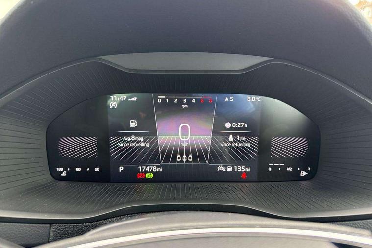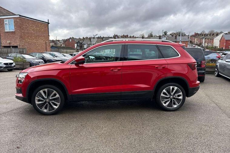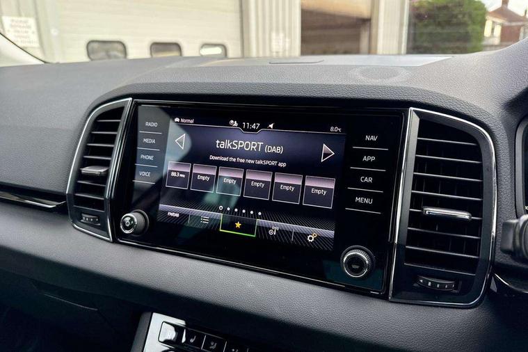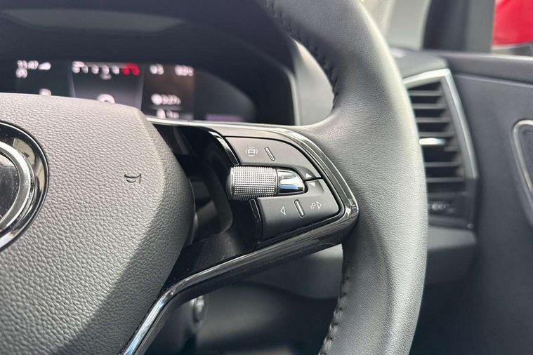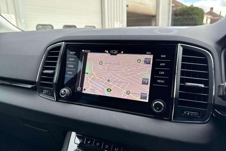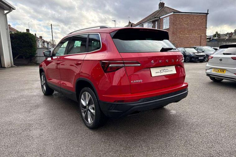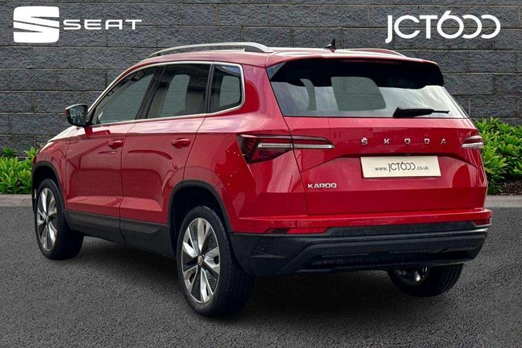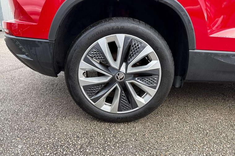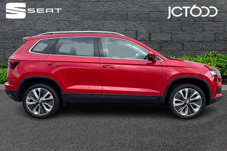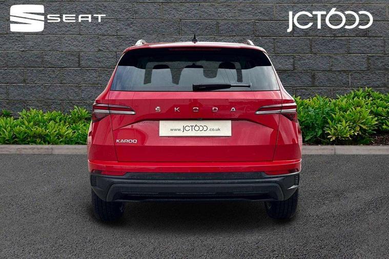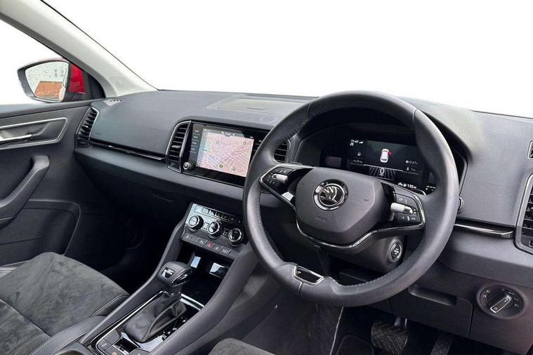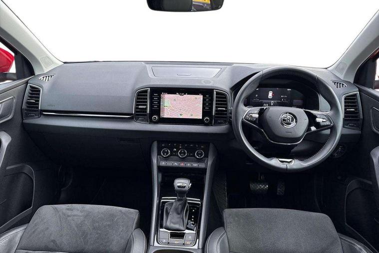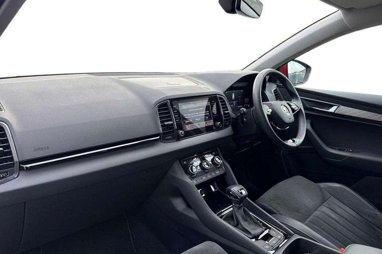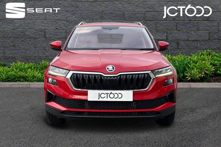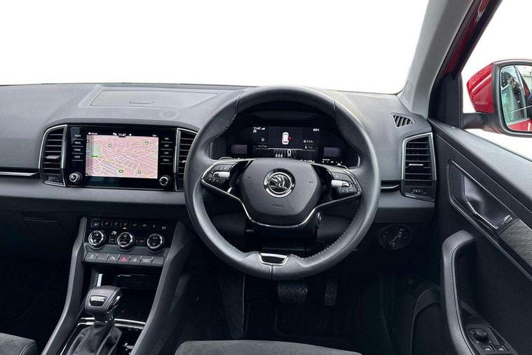 8" Digital display, Care connect, Driver fatigue sensor, Emergency services call system, Outside temperature gauge, Service interval indicator, SmartLink wireless for Apple and wired for Android, Start/stop system with regenerative braking, USB C Port x 2 in front centre console, 8 Speakers, DAB radio with Bluetooth, USB connection, Acoustic glass, Aero front windscreen wipers with intermittent function, Auto dimming rear view mirror with light and rain sensors, Black electric window control buttons, Body colour door mirrors and handles, Dynamic headlight range control with cornering light function, Electric front and rear windows with child proof lock, Heated rear windscreen, LED daytime running lights, LED rear lights with high functionality welcome effect and dynamic indicators, Light assistant (coming/leaving home/tunnel light), Plastic scuff plates, Privacy glass, Rear side wing doors, Rear spoiler, Rear window wiper with washer system and intermittent control, Safety reflectors on front doors, 1.5 litre bottle holders in driver and front passenger door panels, 12V socket in boot, 12v socket in front centre armrest with storage compartment and rear air vents, 2 spoke leather heated multifunction steering wheel with DSG paddles, 2 x Tablet holder, 3 rear height adjustable headrests, 3 seat bench in 2nd row, 4 foldable roof handles with rear coat hooks, Black floor carpet, Chrome inner door handles, Decorative door sills with KAROQ badging, Double sided boot floor, Foldable hooks in the boot, Front head restraints, Height adjustable front three point seats belts with tensioners, Height/reach adjust steering wheel, Ice scraper, Illuminated glovebox, Illuminated luggage compartment, Isofix child seat preparation for front passenger seat, Isofix child seat preparation outer rear, Manual lumbar support for front seats, Pen holder, Pollen filter, Rear boot cover, Rear reading lights, Rubbish bin door, Safety vest holder, Single front passenger seat, Storage box in upper central dashboard closed, Sunvisors with illuminated vanity mirrors, Textile floor mats, Ticket holder, VarioFlex seats with standard rear seat release, Boot pack - Karoq, Chrome roof rails + chrome pack - Karoq, Parking pack - Karoq, Automatic door unlocking in case of crash, Automatic fuel cut off in case of crash, Child locks on rear doors, Driver airbag, Electronic parking brake with auto hold function, Emergency rear braking signal, ESC including ABS, MSR, ASR, EDS, HBA, DSR, RBS, MKB and traction control, Front side airbags, Hill hold control, Knee airbags, Passenger airbag with switch-off function, Pedestrian monitor, Seatbelt reminder signalisation and pretensioner for all seats, Three point seatbelts rear, Two tone horn, Tyre pressure display, Tyre pressure monitor, Alarm with interior monitoring, back up horn and tilt sensor with safe function, Electronic engine immobiliser, Keyless entry and start/stop, Remote central locking with 2 remote folding keys, Chrome framed air vents, 18" Miran alloy wheels in black, Anti-theft wheel bolts protection, Storage on wheel cover, Tool kit,