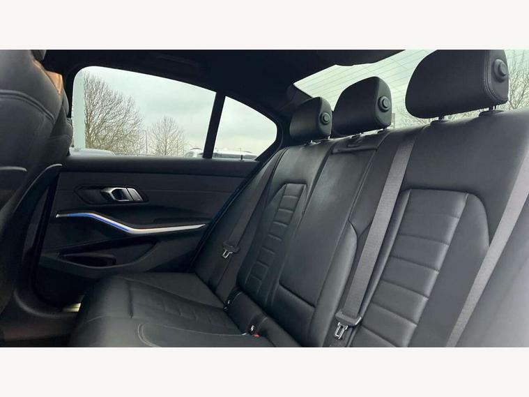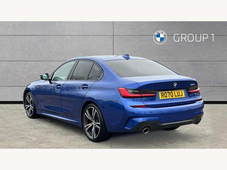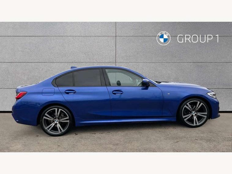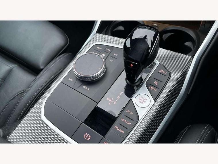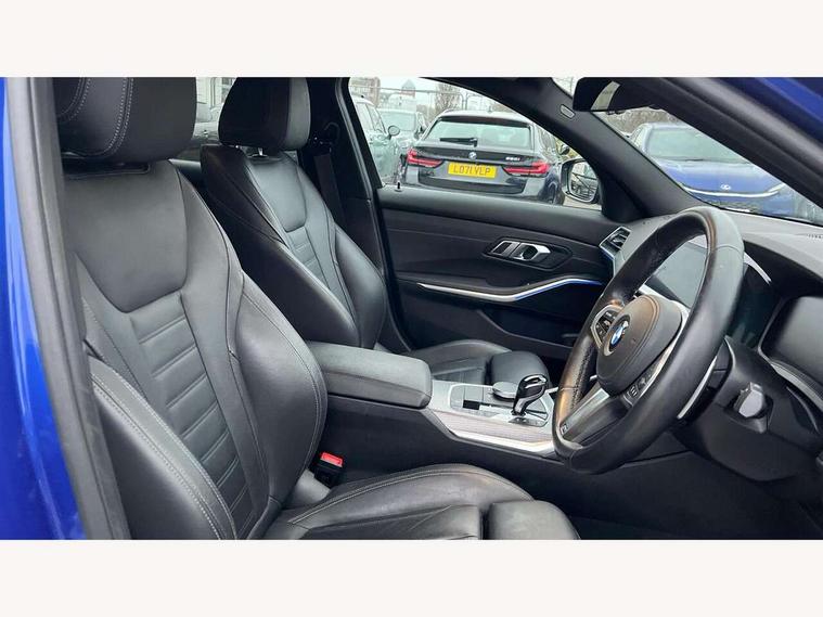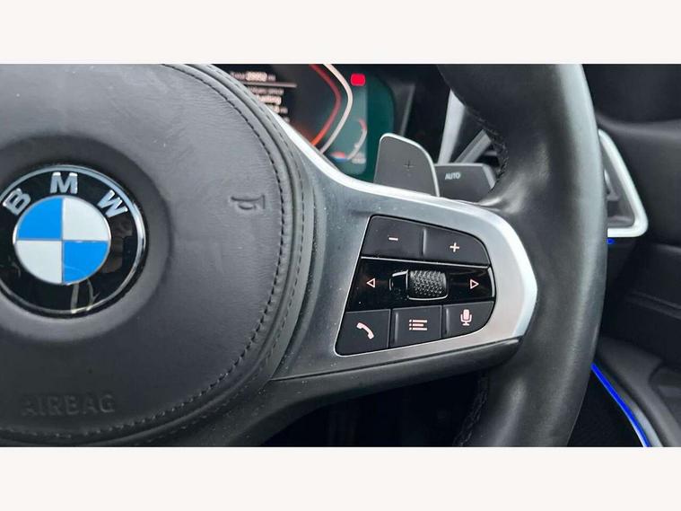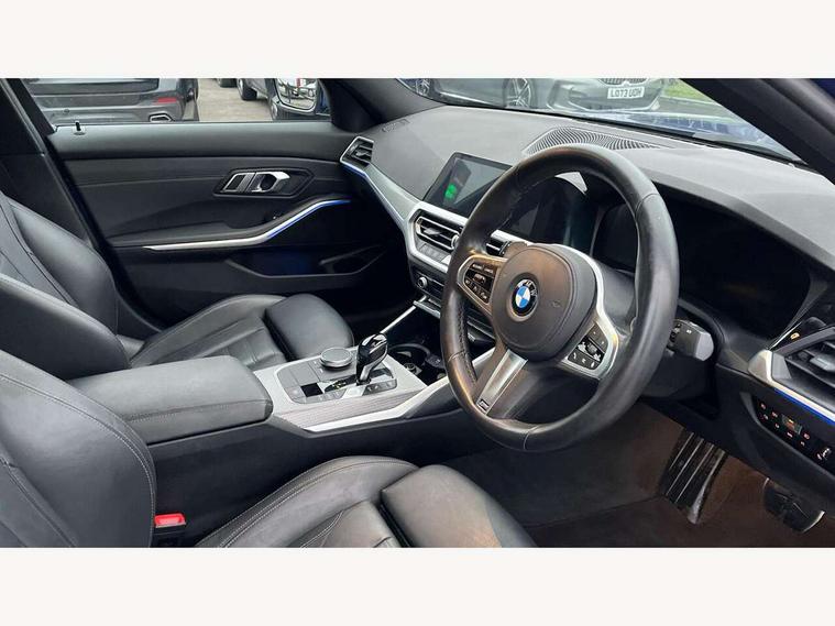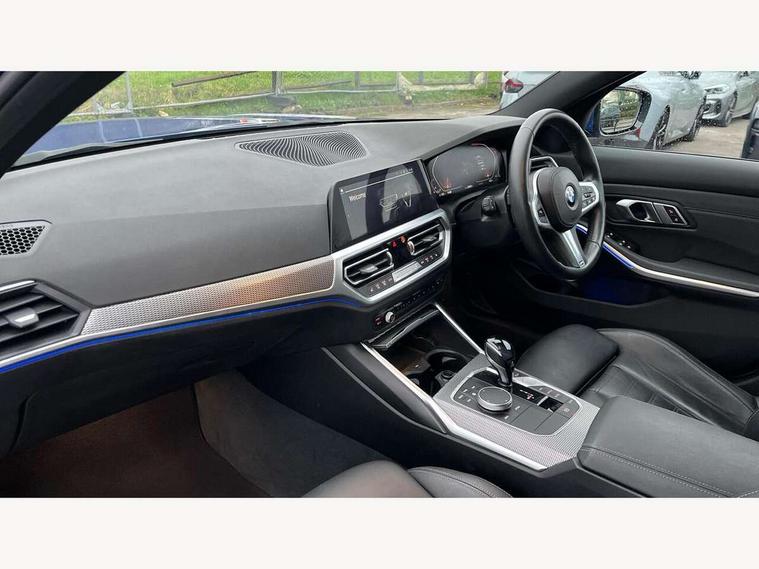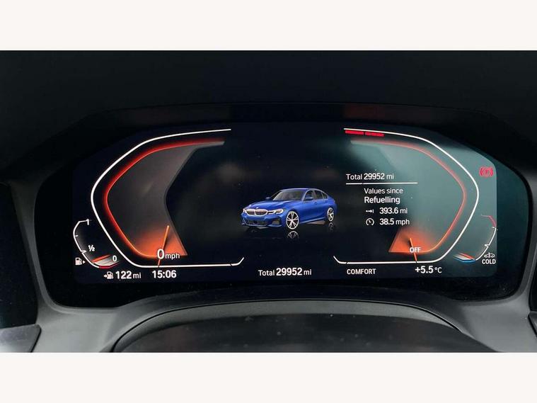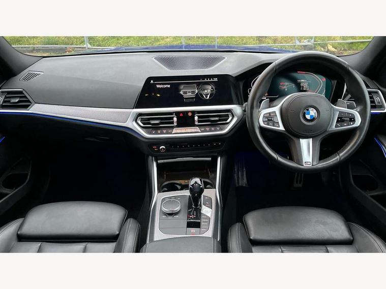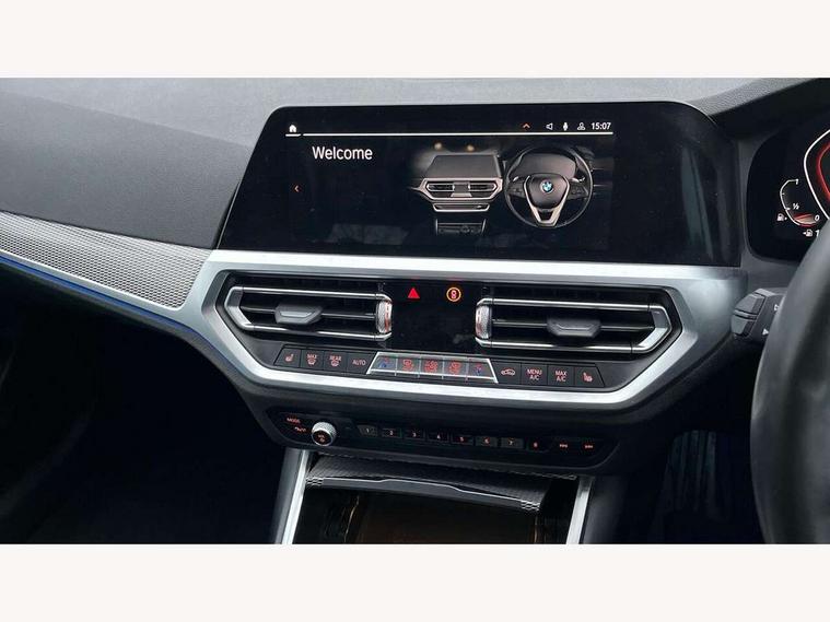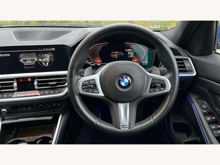 Active guard plus, Attentiveness assist, Auto start-stop, BMW Live Cockpit Professional Nav with 12.3" instrument display + 10.25" display, Intelligent Voice Assist, BMW OS 7, HDD, 2USB, 4G LTE connect, BMW service history, BMW Teleservices, Brake pad wear indicator in front and rear, Check Control warning system for monitoring of lights and door/luggage compartment open warning, Condition based service, Electric power steering with Servotronic steering optimised at all speed ranges, iDrive controller on centre console, Instrument cluster with speedometer with mph readout, tachometer, fuel gauge and oil temperature gauge, Integrated owners handbook, Oil sensor for level and grade, warning by check control system, On board computer - average speed+fuel consumption, service interval, clock/date, odometer/trip meter, outside temperature display and ice warning, Optimum shift indicator, Personal Profile - automatic lock when driving away selectable, Variable sport steering, Balanced 50/50 weight distribution, Battery cut-out switch, Drive performance control - ECO PRO, comfort and sport modes, Larger capacity fuel tank, M sport suspension, Petrol Particulate Filter, Sport automatic transmission with steering-wheel mounted gearshift paddles and launch control, Stroke dependent dampers, DAB tuner, Electronic service booklet, Acoustic glazing, Automatic headlight beam throw control with load dependent regulating reaction, dynamic compensation of braking dive and acceleration squat, Black roof mouldings, Body colour door handles, Body colour fuel filler flap, Body colour mirror caps, Dynamic brake lights, Electric windows - front and rear, with open/close fingertip control, anti-trap facility and comfort closing, Exhaust tailpipe - split left and right, Exterior mirrors - electrically folding with anti-dazzle, Fading support, Front and rear bumper system with replaceable deformation elements, Front black door sill finishers with BMW designation, Green tinted heat protection glazing, High gloss shadow line exterior trim, Interior rear view electrochromatic mirror with automatic anti dazzle function, LED daytime running lights, LED front fog lights, Lightweight engineering, M designation on front side panels, left and right, Matt black exterior B pillar, Model designation on right side of tailgate, Rain sensor with automatic headlight activation, Shark fin antenna, Two part LED tailights in L-shape with components in smoked glass, brake light, LED turn indicator and rear fog light, Visible VIN plate, Welcome lights in interior and door handle area, Windscreen wipers with integrated washing jets, 12V power socket in front storage compartment, 2 front cupholder in centre console with clamping elements and matt black inlay, 3 rear seats with non folding headrests with 3 point seat belts, 3 zone automatic air conditioning, 4 pieces lashing eyelets in luggage compartment, 40:20:40 split folding rear seat with loading system, Ambient lighting with welcome carpet light, Anthracite headlining, Armrest integrated in front and rear door trim + front centre console armrest, Centred top Luggage compartment lights, Four grab handles integrated in roof lining, Front and rear door exit lighting (left / right), Front and rear door pockets, Front and rear reading lights, Front and rear velour floor mats, Front head restraints, Front sport seats, Heated driver and front passenger seats, Height adjustable mechanically and infinitely variable steering column, Illuminated armrest storage compartment, Illuminated glove compartment with separate small compartment, Interior lighting - front centre over interior mirror with soft light, rear centre and front and rear footwell lighting, M Sport multifunction leather steering wheel, Make-up mirror lights, Rear centre armrest with 2 cupholders, Rear centre console with storage compartment and ventilation grille, Sunvisors with vanity mirrors and ticket pocket, Toolkit located in luggage compartment, Connected pack professional - 3 Series Saloon/Touring, M Aerodynamics pack - 3 Series Saloon/Touring, 2 tone horn, BMW emergency call, Brake energy regeneration, Braking pre-tensioning, Child proof locking system in rear door, Child seat ISOFIX attachment rear outer seats, Coasting in idle in ECO PRO mode, Crash sensor activating of airbags, Unlocking doors, hazard warning lights, fuel cut off, interior lighting+activation of safety battery terminal clamp, Driver and front passenger side airbags, integrated in the door side seat backrest bolsters for all seat variants, Driver/Front Passenger airbags, Dry braking, Dynamic brake control, Dynamic stability control + (DSC+) - Anti-lock Braking System (ABS) with brake assist and cornering brake control + Automatic Stability Control (ASC), Dynamic Traction Control - DTC, Electromechanical parking brake including automatic hold function and automatic release of the parking brake when pulling away, Electronic differential lock control (EDLC), Front passenger manual airbag deactivation, Head airbags for all 4 outer seats, Hill start assist, Seat belt security check for driver and front passenger, Side impact protection, Three 3 point seat belts on all seats including front belt stopper, pyrotechnic belt tensioners and belt force limiters, Tyre pressure monitoring with three level warning strategy, Ventilated front and rear disc brakes, Warning triangle and first aid kit, Alarm system (Thatcham 1) with remote control and electronic engine immobiliser, Central locking switch for all doors, fuel filler cap and luggage compartment, Remote control with integrated key one button open/close vehicle and windows, sole opening of the luggage compartment lid and panic mode, Start/stop button with Comfort Go keyless engine start and auto Start/stop deactivation button, Vehicle key with M specific designation, Reduced rolling resistance tyres,