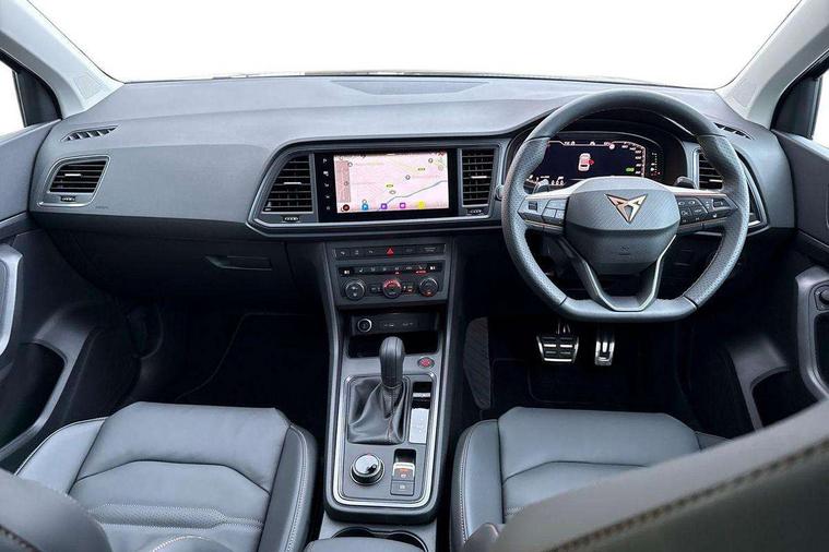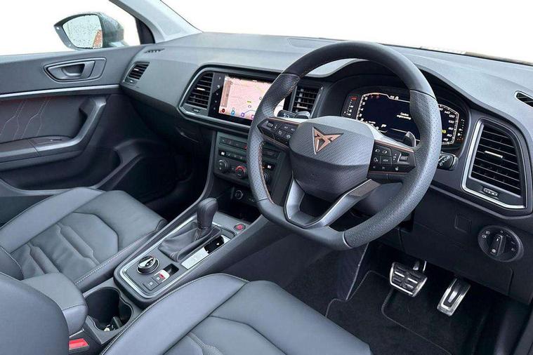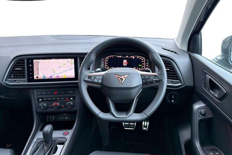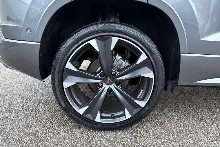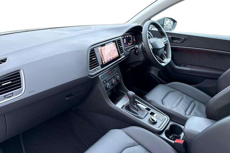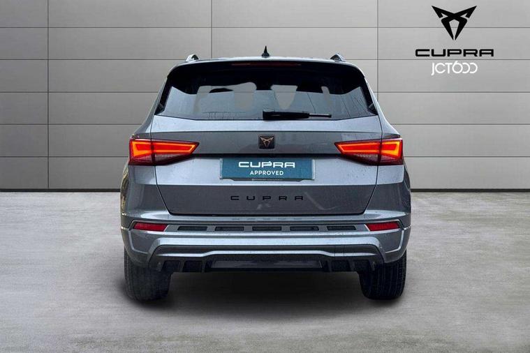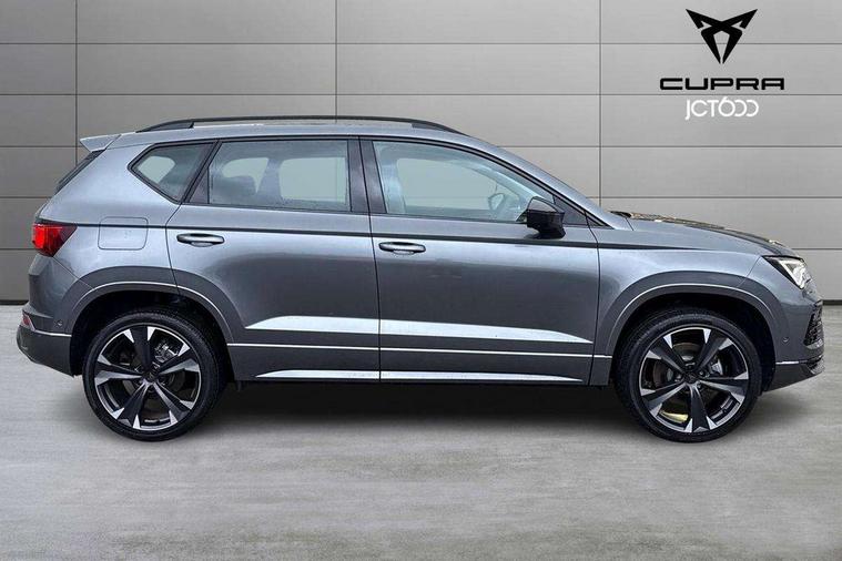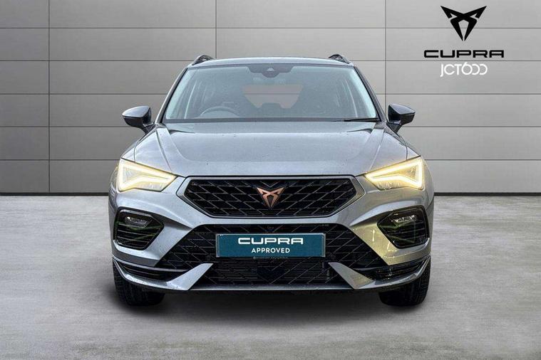 Cruise control system with speed limiter, Digital cockpit, Driving profile selection and conventional shock absorber, E-call, Electric tailgate with virtual pedal, Outside temperature gauge, Progressive power assisted steering, Rear view camera, Self parking functionality (includes front and rear parking sensors), Trip computer, wired and wireless full link smartphone integration, Wireless phone charger, Front and rear shock absorption, chassis with increased ride height, Steering wheel mounted audio/phone controls, Body colour bumpers with dark aluminium diffusor, Body coloured wheel arch surrounds, Dark tinted rear windows, Daytime running lights, Door mirrors with welcome CUPRA light silhouette, Dynamic headlight range control with self adjusting whilst driving, Electric adjustable/heated/folding door mirrors, Front and rear electric windows, Front grille frame in chrome, Full LED headlamps with lens and LED front fog lamps with cornering function, Gloss black door mirrors, Gloss black roof rails, Gloss black side mouldings, Gloss black side window trim, Illuminated aluminium front door sill, LED rear tail lights with dynamic indicators, Rear fog lights, Rear side wing doors, Rear spoiler, Rear wash/wipe, Specific CUPRA design front bumper, Standard rear exhaust tailpipes, Third brake light, 12V socket in front, 3 seat bench in 2nd row, 60/40 split folding rear seat, Aluminium pedals, Cupra steering wheel emblem, Dual zone climate control, Electric driver seat with memory function, Front and rear head restraints, Front centre armrest, Front seat back storage pockets, Grey roof lining, Heated front seats, Heated steering wheel, Height adjustable driver and passenger seat with lumbar adjustment, ISOFIX points in outer rear seats with top tether anchorage points, Leather sport bucket seats, Leather steering wheel and gear knob, Multicoloured ambient lighting with LED interior illumination, Pedal cluster, Rear armrest and easy back seat release mechanism from boot, Single front passenger seat, Sports steering wheel, Steering wheel mounted gearshift paddles, Storage compartment in roof console for sunglass, Storage compartment under driver's seat, Convenience pack - Ateca, Interior lighting pack - Ateca, Navigation system plus pack with DAB - Ateca, Safety and driving pack - Ateca, 3x3 point rear seatbelts, ABS, Traction control system (TCS), Electronic stability control (ESC) and Electronic differential lock system (XDS), Airbags - Driver and front passenger airbag with deactivation, front side, two curtain and driver's knee airbags, Black brake callipers with CUPRA logo, Electric parking brake with auto hold function, Front and rear seatbelt reminder, Front assist with autonomous emergency braking, Hill hold control, Manual rear child locks, Single tone horn, Tiredness recognition system, Tyre pressure monitoring system, Alarm, Keyless entry, Locking wheel bolts, 19" Sport machined alloy wheels 36/3 in black/silver,