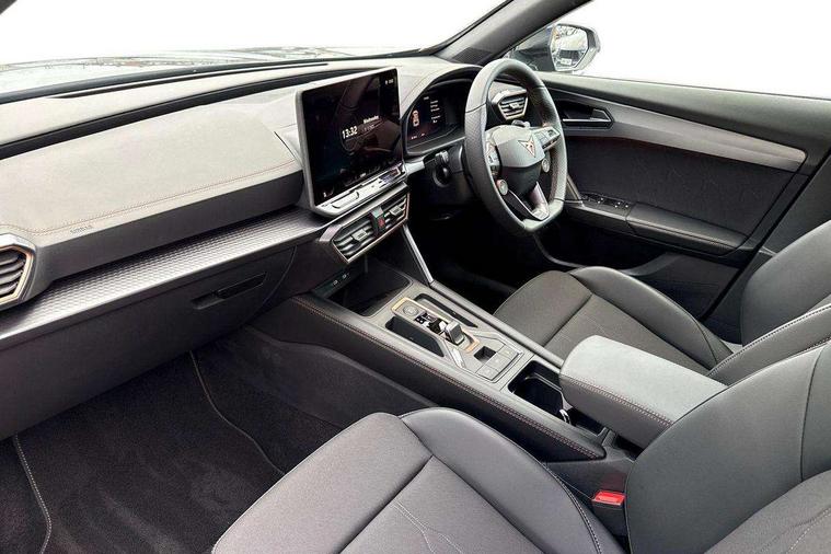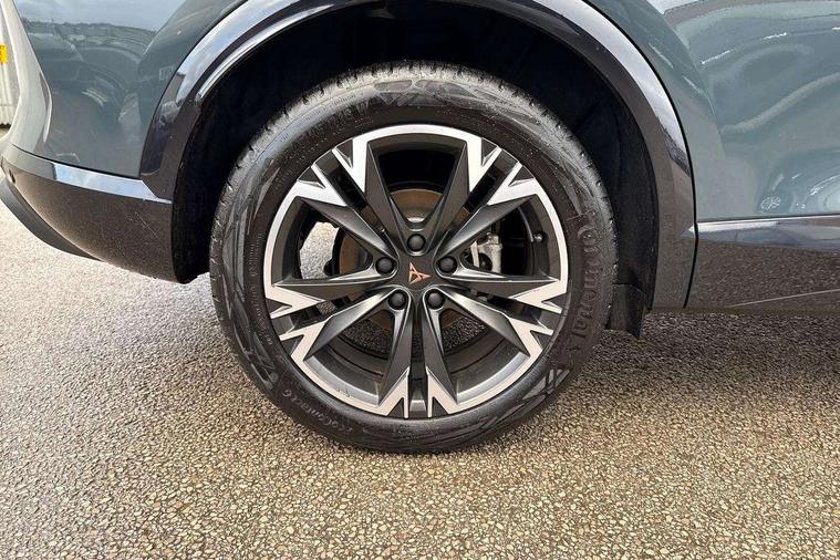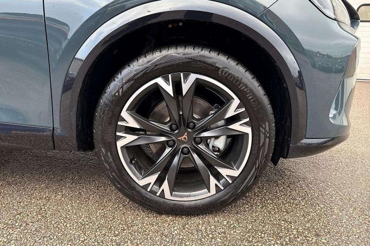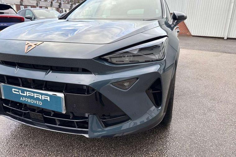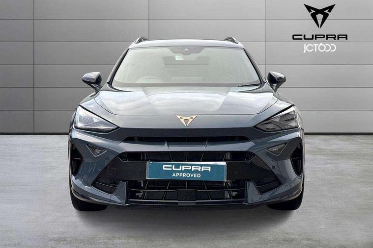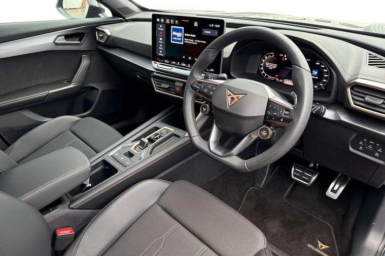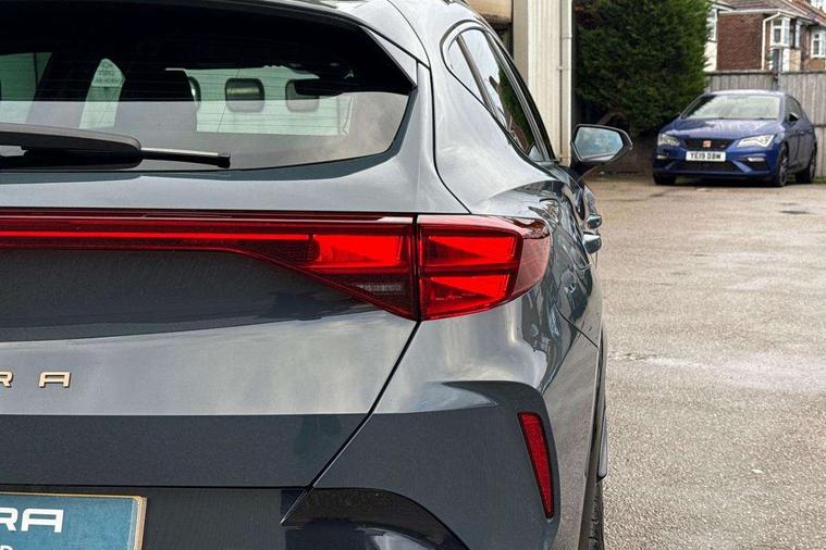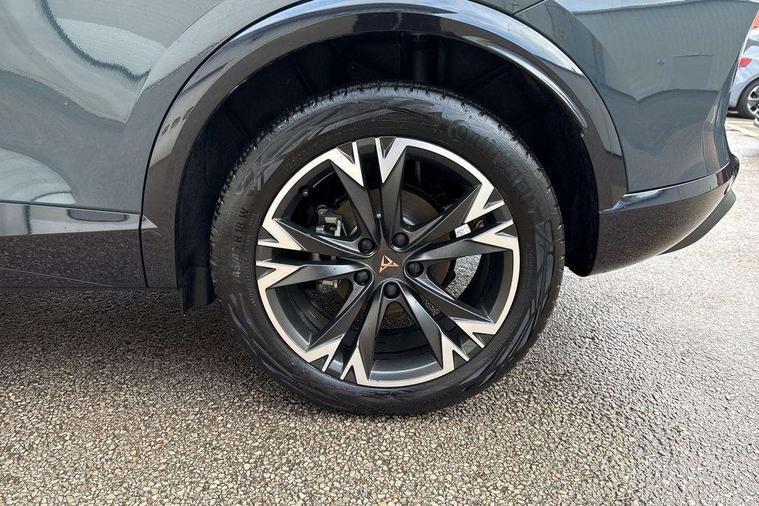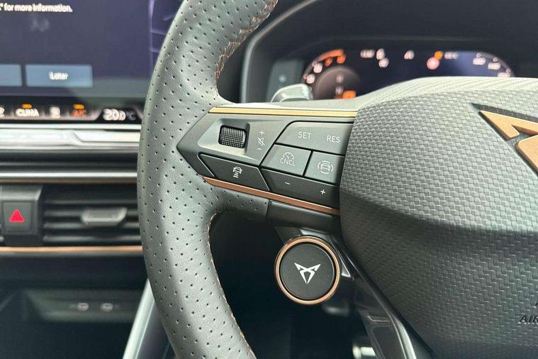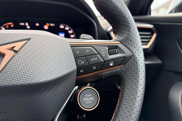 10.25" digital cockpit and configurable dashboard, Adaptive cruise control with follow-to-stop and speed limiter, Advanced driver alert system, Driving profile selection, Dynamic road sign display, Emergency steering support with turn assist, Forward collision warning with automatic braking, Front and rear parking sensors, Full link phone integration, Lane assist, Progressive steering, RPM, trip computer, outside temp gauge, instrument light brightness, low fuel warning light, lights on reminder, gearshift indicator, Service interval indicator, Start/stop system with regenerative braking, Voice control system, Wired Android Auto, Wireless apple carplay, Wireless phone charger, 10 amp mode 2 charging cable, 32 amp mode 3 charging cable, CUPRA sport suspension, Electronic locking differential and dynamic traction support, 2 front and 2 rear USB type C sockets, 7 speakers, Media system with navigation, 12.9" touchscreen display, voice control, DAB, steering wheel mounted controls, Auto dimming rear view mirror, Body colour door handles, Body coloured bumpers, Dark grey wing mirror, Daytime running light with automatic headlight control and coming home feature, Door panel ambient lighting, Dynamic headlight range control, Electric front/rear windows, Electrically adjustable, heated and folding door mirrors, Gloss black roof rails and window surrounds, High beam assist, LED 3rd brake light, LED front fog lamps with cornering function, LED Headlights, LED Taillights with dynamic indicator, Rain sensing wipers, Rear diffuser with copper simulated exhaust pipes, Rear fog lights, Rear side wing doors, Rear wash/wipe, Tinted rear windows, Welcome lights (within exterior mirror housing), 12V socket, 2 front and 2 rear reading lights, 3 seat bench in 2nd row, 60/40 split rear bench seat with armrest and mechanical seat release, Black headlining, Black interior roof lining, Cupra sports pedals, Dust/pollen filter, Front and rear head restraints, Front centre armrest, Heated supersports multifunction leather steering wheel with satellite buttons and gear shift paddles, Height/reach adjust steering wheel, Illuminated aluminium doorsteps, Illuminated interior front door sills, Illuminated sunvisor with mirror, Interior ambient lighting, Isofix, Manually adjustable height and lumbar support for front seats, PVC/Cloth upholstery with copper stitching + Sport seats, Satellite steering wheel, Single front passenger seat, Storage pockets on rear of front seats, Three zone climate control with control panel in rear, 3 point seatbelts on all rear seats, ABS, Brake control system - ESC and brake booster, Child proof door locks, Driver and front passenger airbags with front passenger airbag de-activation, Electronic parking brake, Front and rear disc brakes, Front side curtain airbags, Hill hold control, Public e-call, Seat belt reminder for front and rear seats, Tyre pressure monitoring system, Anti theft alarm system, Central locking system Keyless Go, Locking wheel bolts, Copper and aluminium interior detailing, 18" Sonora machined silver alloy wheels, Breakdown and tool kit,