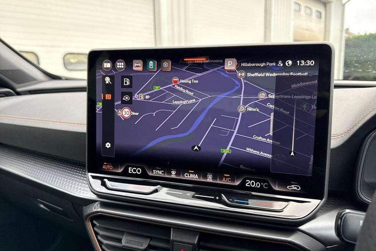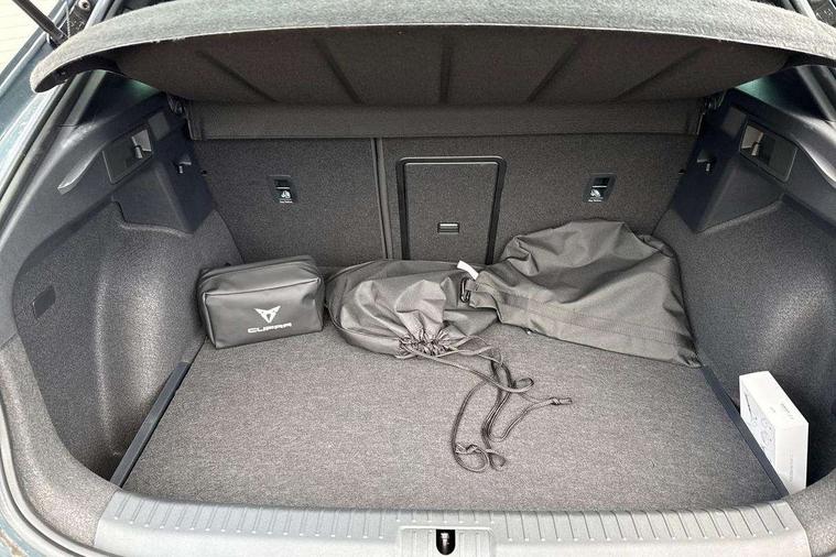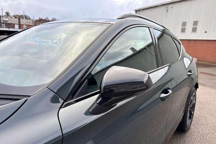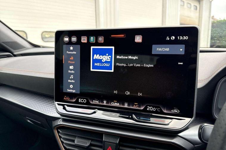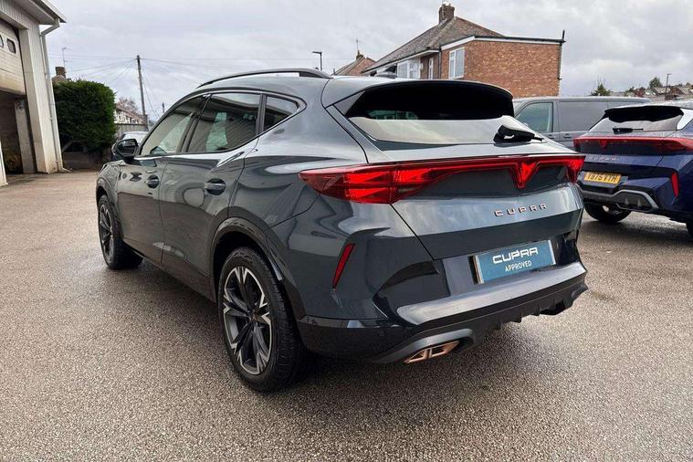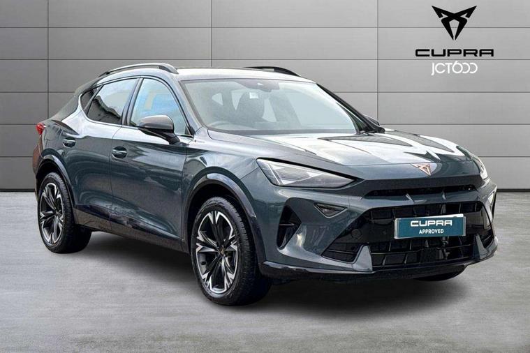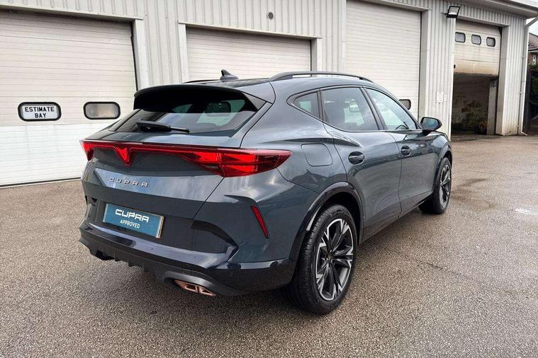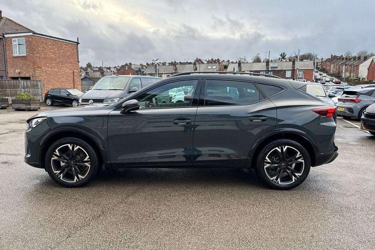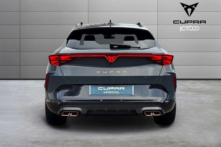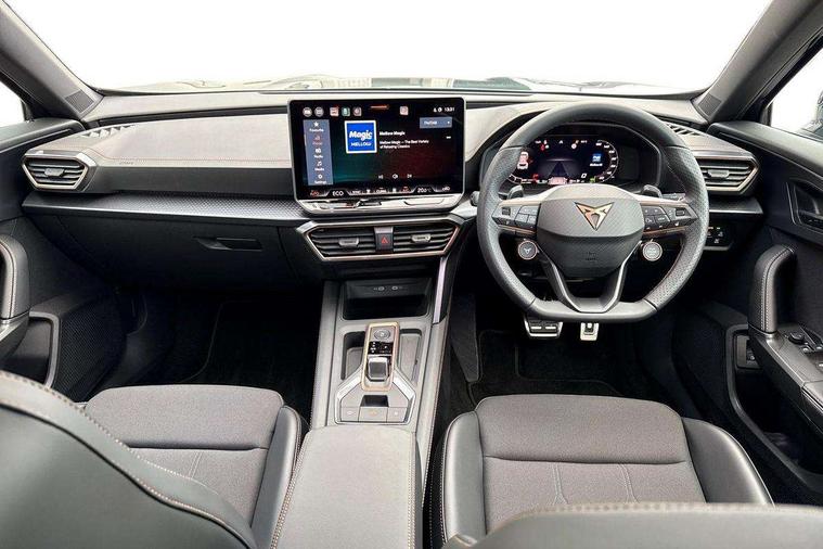 10.25" digital cockpit and configurable dashboard, Adaptive cruise control with follow-to-stop and speed limiter, Advanced driver alert system, Driving profile selection, Dynamic road sign display, Emergency steering support with turn assist, Forward collision warning with automatic braking, Front and rear parking sensors, Full link phone integration, Lane assist, Progressive steering, RPM, trip computer, outside temp gauge, instrument light brightness, low fuel warning light, lights on reminder, gearshift indicator, Service interval indicator, Start/stop system with regenerative braking, Voice control system, Wired Android Auto, Wireless apple carplay, Wireless phone charger, 10 amp mode 2 charging cable, 32 amp mode 3 charging cable, CUPRA sport suspension, Electronic locking differential and dynamic traction support, 2 front and 2 rear USB type C sockets, 7 speakers, Media system with navigation, 12.9" touchscreen display, voice control, DAB, steering wheel mounted controls, Auto dimming rear view mirror, Body colour door handles, Body coloured bumpers, Dark grey wing mirror, Daytime running light with automatic headlight control and coming home feature, Door panel ambient lighting, Dynamic headlight range control, Electric front/rear windows, Electrically adjustable, heated and folding door mirrors, Gloss black roof rails and window surrounds, High beam assist, LED 3rd brake light, LED front fog lamps with cornering function, LED Headlights, LED Taillights with dynamic indicator, Rain sensing wipers, Rear diffuser with copper simulated exhaust pipes, Rear fog lights, Rear side wing doors, Rear wash/wipe, Tinted rear windows, Welcome lights (within exterior mirror housing), 12V socket, 2 front and 2 rear reading lights, 3 seat bench in 2nd row, 60/40 split rear bench seat with armrest and mechanical seat release, Black headlining, Black interior roof lining, Cupra sports pedals, Dust/pollen filter, Front and rear head restraints, Front centre armrest, Heated supersports multifunction leather steering wheel with satellite buttons and gear shift paddles, Height/reach adjust steering wheel, Illuminated aluminium doorsteps, Illuminated interior front door sills, Illuminated sunvisor with mirror, Interior ambient lighting, Isofix, Manually adjustable height and lumbar support for front seats, PVC/Cloth upholstery with copper stitching + Sport seats, Satellite steering wheel, Single front passenger seat, Storage pockets on rear of front seats, Three zone climate control with control panel in rear, 3 point seatbelts on all rear seats, ABS, Brake control system - ESC and brake booster, Child proof door locks, Driver and front passenger airbags with front passenger airbag de-activation, Electronic parking brake, Front and rear disc brakes, Front side curtain airbags, Hill hold control, Public e-call, Seat belt reminder for front and rear seats, Tyre pressure monitoring system, Anti theft alarm system, Central locking system Keyless Go, Locking wheel bolts, Copper and aluminium interior detailing, 18" Sonora machined silver alloy wheels, Breakdown and tool kit,