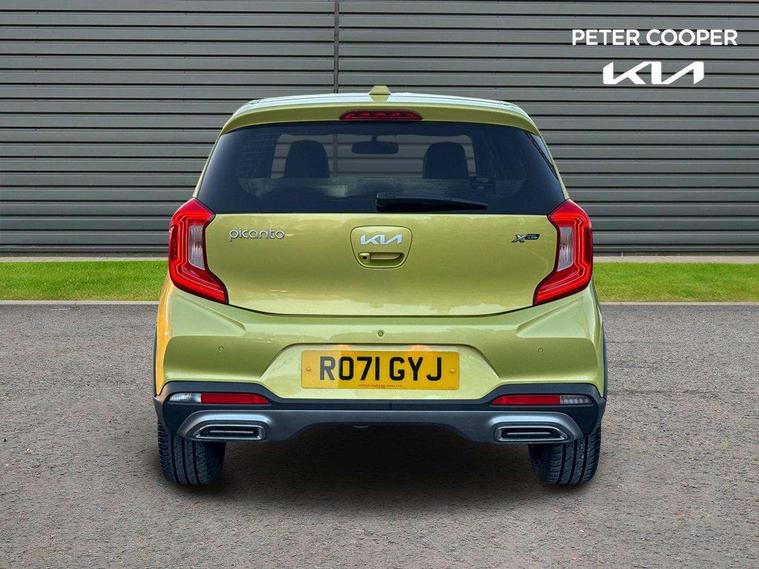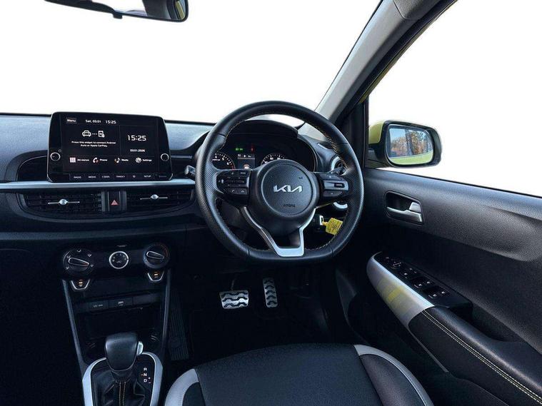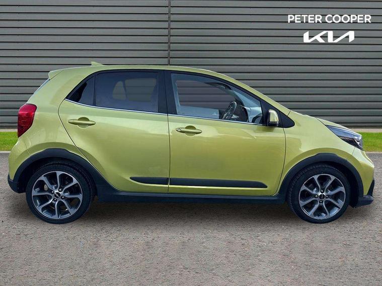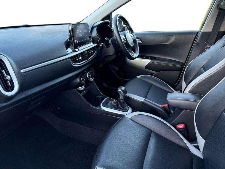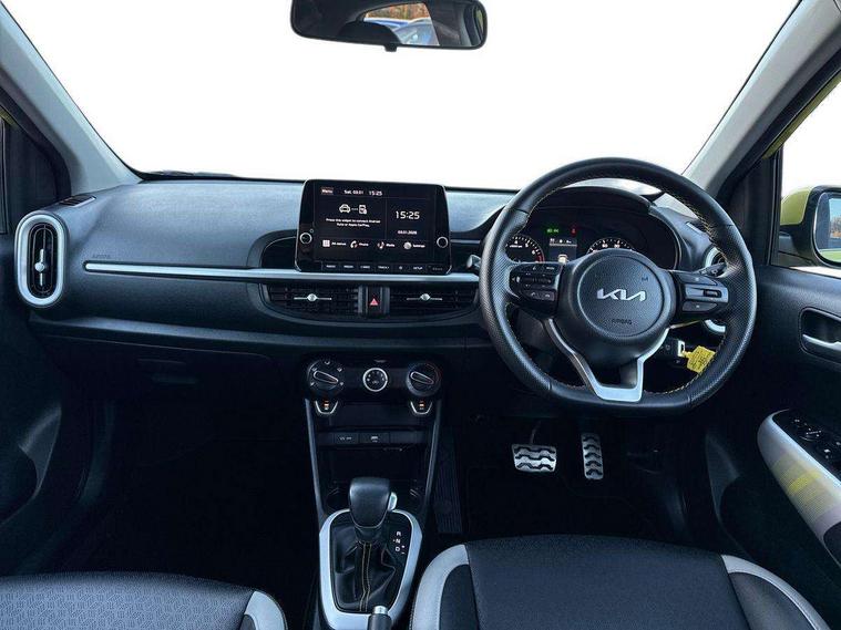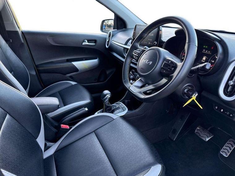 8" touchscreen display with RDS and DAB, Apple car play/Android Auto with voice control, Emergency stop signalling system, External temperature gauge, Motor driven power steering, Rear parking sensors, Reversing camera system with dynamic guidelines (Integrated into centre fascia screen), Tachometer, Trip computer, 6 speaker audio system, Bluetooth with music streaming, Steering wheel mounted controls, USB ports for connection of a media device, Automatic headlight control system, Bi-function projection headlights, Black grille with silver surround, Black side sill moulding, Black wheel arch cladding, Body colour bumpers, Body colour mirrors and door handles, Chrome side window trim, Day/night rear view mirror, Electric adjustable/heated/folding door mirrors with LED indicators lights, Front and rear bumpers with silver skid plates and twin exhaust, Front and rear electric windows with drivers's auto up/down function, Front fog lights, Headlamp levelling, Heated rear window, High mount brake light, LED daytime running lights, LED rear fog lights, LED rear lights, Privacy glass - Rear windows and tailgate, Rear wash/wipe, Speed variable front wipers, Tinted glass, Visible VIN plate, Welcome and follow-me home light functionality, 1 x rear coat hook, 12V power point front, 3 x passenger assist grips, 60/40 split/folding 2nd row of seats, All round height adjustable headrests, Centre Console with Storage Box and Sliding Armrest, Cupholders in centre console, D-cut steering wheel with green stitching, Driver and front passenger sunvisor with vanity mirror, Driver seat height adjust, Faux leather upholstery, Front cabin lights, Glovebox, ISOFIX Child seat top tethers and anchor fixings, Leather trimmed steering wheel and gearshift, Luggage area light, Luggage area parcel shelf, Manual air conditioning, Metal pedals, Passenger front seatback pockets, Satin chrome interior door handles, Silver and green accents on door armrests, lower centre console trim and air vents, Slide/reclining front seats, Tilt adjustable steering wheel, Advanced Driver Assistance Pack - Picanto, 3x3 point rear seatbelts, ABS/EBD, Automatic unlocking of doors in case of impact, Dual front airbags, ESC + BAS + VSM + HAC, Front passenger airbag cut-off switch, Front seatbelt height adjusters, Front seatbelt pretensioners + load limiters, Knee airbags, Rear child proof door locks, Seatbelt warning, Side impact protection, Torque vectoring brake based and straight line stability (SLS), Traction control, Twin curtain airbags, Twin front side airbags, Tyre pressure monitoring system, Anti theft alarm, Engine immobiliser, Folding key, Locking wheel nuts, Remote central door locking, 16" alloy X-Line wheels, Tyre mobility kit,