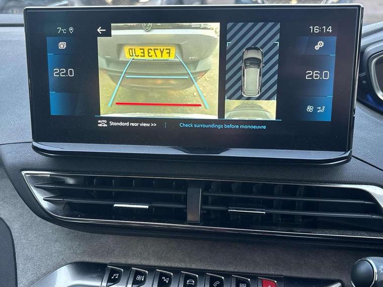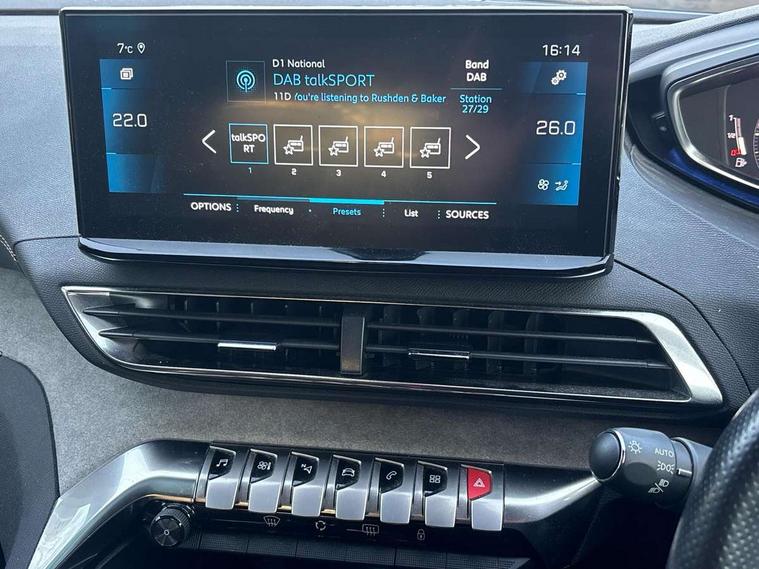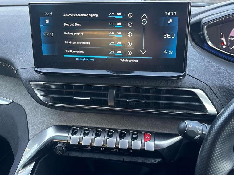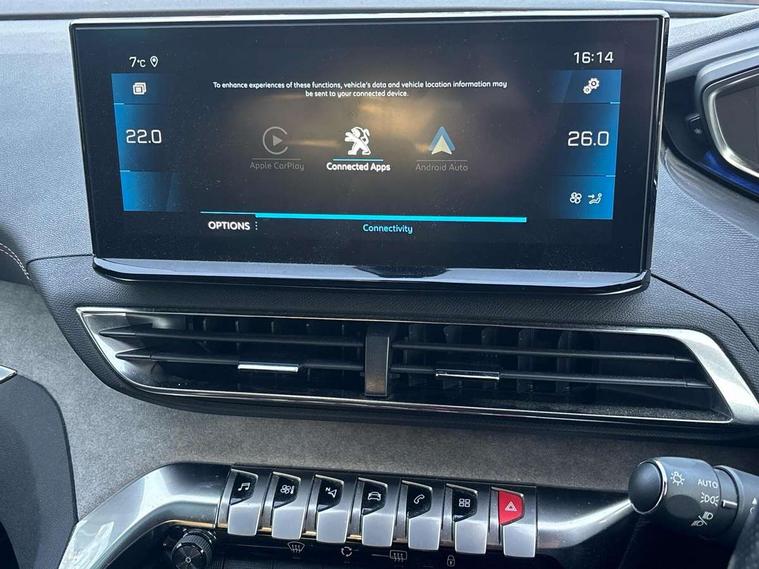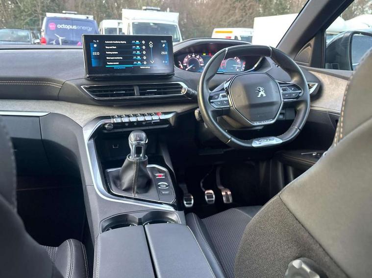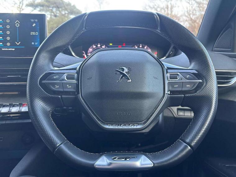 180 degree colour reversing camera, 3D connected navigation with 10" HD touchscreen, Bluetooth telephone facility, Drive modes select (Eco, normal and sport), Driving Time Warning (DAA1), Emergency services call system, Extended traffic sign recognition, Exterior temperature indicator with ice warning, Mirror screen with mirror link, apple carplay and android auto, Multi function trip computer, PEUGEOT i-Cockpit with 10" high definition capacitive touchscreen, Peugeot i-cockpit with compact multi-function sports steering wheel, PEUGEOT i-Cockpit with configurable 12.3" Head-up digital instrument panel, PEUGEOT SOS and assistance, Rear passenger USB charging sockets (x2) (type A), Speed limit recognition and recommendation, Voice recognition, Dynamic stability control and electronic anti-skid system, Stop/start function, DAB Digital radio, USB socket, Auto self levelling headlights, Automatic hazard light activation upon heavy brake application, Automatic triggered rear windscreen wiper in reverse gear, Black with chrome detailed front wing trim, Body colour door handles, Body colour rear roof spoiler with stainless steel edging trim, Body protectors (bottom of front and rear bumpers + wheel arches + protection at bottom of doors) in black, Dark tinted rear side windows + tailgate window, Diamond Black door mirror shells, Door mirror mounted LED courtesy floor lighting, Electric folding door mirrors with exterior courtesy LED lighting, Electric operated/heated door mirrors, Fog Mode, Front windscreen wiper with magic wash cleaning system, Full LED headlights with LED fog lights with static cornering function, Gloss black B and C pillar and aerodynamic deflector trim, Gloss black front bumper air scoops, Gloss black rear cluster connecting strip, Gloss black windscreen trim, GT emblem in satin copper (front wings and tailgate), Headlights left on audible warning, Heated rear windscreen with integrated antenna, LED daytime running lights, LED front indicator, LED rear number plate lighting, LED side indicator lights integrated into door mirrors, LED third brake light, One touch electric front/rear windows with pinch protection, Rear LED Peugeot signature 'Claw Effect' lights, Rear side wing doors, Stainless steel roof arches, Twin exhaust tailpipe, 1/3 to 2/3 split folding rear seats, 12V Sockets in dashboard, rear cabin and load area, 2 cupholders in front centre console, 2 cupholders in rear armrest, 2 x Rear reading spotlights, 2x Rear coat hooks, 3x Isofix child seat fittings in the front passenger and outer rear seats, 4 Grab handles retractable and damped, Aikinite stitching in armrest, gear lever and dashboard facia, Aluminium pedals, Blue ambient lighting for connecting zone, Blue ambient lighting to front door panels, central storage and cupholders, Blue ambient lighting to headup instrument panel, Centre front armrest with butterfly wing opening and illuminated storage compartment, Driver seat manual adjustment (longitudinal and back rest angle), Dual zone automatic climate control, Electric power steering with reach and rake adjustable steering column, Flocked front door pocket interior with blue ambient lighting, Flocked glovebox interior, Foldable front passenger seat with picnic table, Footwell illumination, Front interior light with 2 reading spotlights and rear interior light with timer, Front passenger seat manual adjustment (longitudinal and back rest angle), Front seat back map pockets, Gear shift indicator, Illuminated glovebox, Individual left and right controls in boot for seat folding, LED interior lighting in storage spaces and load area, LED roof interior lighting, Mistral floor mats with Aikinite contrast stitching, Mistral full grain perforated leather steering wheel with aikinite stitch detail and satin chrome 'GT' emblem, Rear bench seat with central armrest and ski hatch, Rear centre console ventilation system, Roof lining - Mistral black, Satin chrome dashboard trim, Satin chrome digital instrument panel and touchscreen trim, Satin chrome front door panel recess trim, Satin chrome interior door handles, Satin chrome scorpion's tail and toggle switch trim, Seatbelt not fastened audible and visual alert for front seats, Seatbelt unfastened on the move audible and visual alert for front and rear seats, Sunvisors with illuminated vanity mirrors, Two position boot floor, Drive assist pack - 3008, Driver sport pack - 3008, Safety plus pack with high beam assist - 3008, Visibility pack - 3008, 3x Rear three-point retractable seatbelts with force limiters in the outer rear seats, ABS (Anti-lock Braking System) with EBD (Electronic Brakeforce Distribution) and EBA (Emergency Braking Assistance), Adaptive driver and front passenger airbags with passenger airbag deactivation function, Driver and front passenger side airbags, Electric child locking functionality on rear windows and doors, Electric parking brake, Front and rear curtain airbags, Front optimised safety headrests and 3 x rear retractable headrests with height adjustable, Front three point retractable seatbelts with pre tensioners and force limiters, Front ventilated disc brakes and rear disc brakes, Hill start assist, Two tone horn, Automatic door locking when moving off, Electronic immobiliser, key operated exterior door lock from the left hand door, Perimetric and volumetric alarm with lift and tilt sensor, Peugeot Open and Go System, Remote control central locking with two plip keys, Puncture repair kit including compressor, sealant cartridge and towing eye,