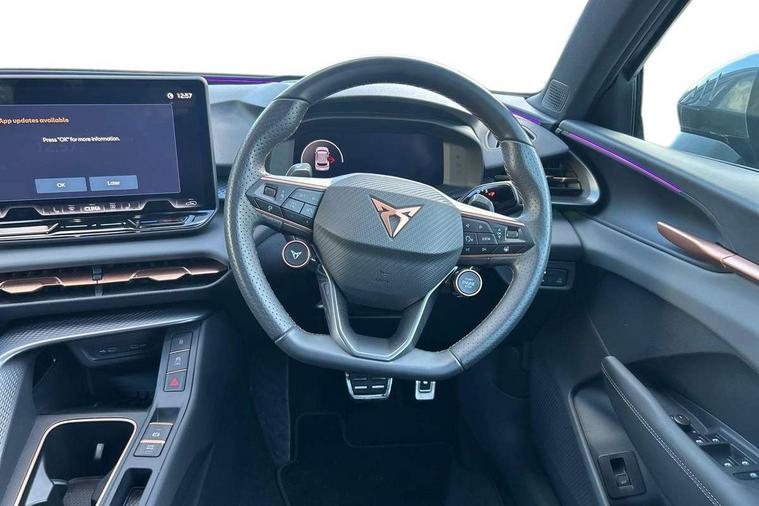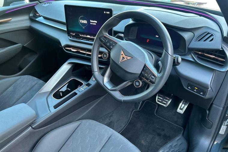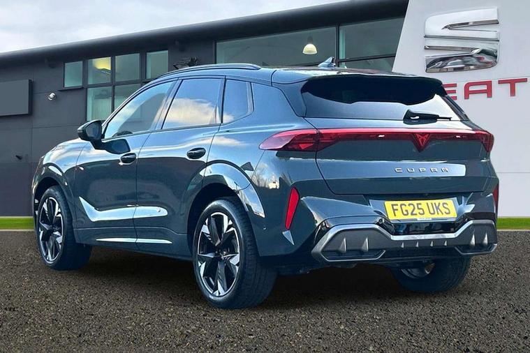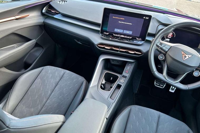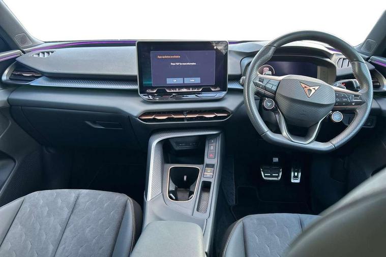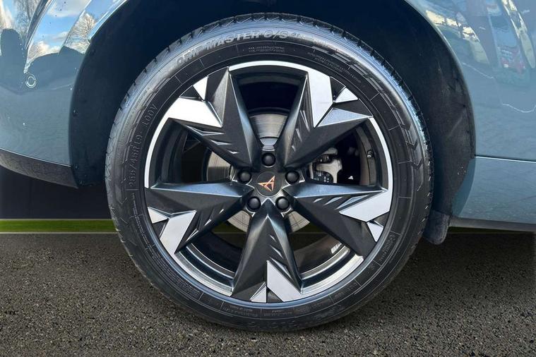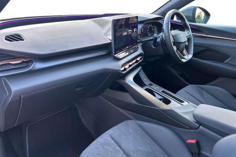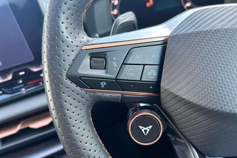 10.25" digital cockpit and configurable dashboard, Adaptive cruise control with follow-to-stop and speed limiter, Advanced driver alert system, Advanced lane assist with semi-automatic vehicle control in a medical emergency and traffic jam assist, Driving profile selection and conventional shock absorber, Dynamic road sign display, E-call, Electric tailgate with virtual pedal, Emergency steering support with turn assist, Four x USB Type C ports (2 in front and 2 in rear), Front and rear parking sensors, Front assist (Forward collision warning with automatic braking) with multifunction camera and front cross traffic assist, Head up Display, Intelligent park assist, Media system with Nav - 12.9" touch display, voice control, full link phone (wired/wireless), DAB and Steering wheel mounted controls, Rear traffic assist, Side and exit assist, Speed sensitive power steering, Start/stop system with regenerative braking, Top view camera (front camera, rear camera, 2 side cameras), Wireless phone charger, Auto dimming rear view mirror, Black roof rails, CUPRA 3D rear lights with ceremony & swiping indicator and illuminated logo, Dark tinted rear windows, Daytime running lights with automatic headlight control and Coming and Leaving home function, Door mirrors with memory function and lowing function on passenger mirror, Dynamic headlight range control, Electric front/rear windows, Electrically adjustable, heated and folding door mirrors, Front fog lamps with cornering function, Heat reflecting windscreen, High beam assist, LED headlamps with signature "CUPRA LED", Rain sensing wipers, Rear fog light on one side, back up light on both sides, Rear side wing doors, Rear wash/wipe, Third brake light, Welcome lights (within exterior mirror housing), 3 seat bench in 2nd row, Black roof lining, Cupra sports pedals, Dinamica cloth upholstery, Driver seat memory function, Electrically adjustable front seats including lumbar support, Front and rear head restraints, Front and rear reading lights X 4, Front centre armrest, Heated front seats, Heated leather wrapped multi function sports steering wheel with tiptronic, Illuminated interior front door sills, Isofix, Operating voltage 12V, Single front passenger seat, Smart wraparound interior lighting, Sunvisors with illuminated mirror, Three zone climate control with control panel in rear, Unsplit rear seat bench, split folding backrest, with centre armrest, Variable luggage/load compartment floor, 3 point seatbelts in front with pretensioner and electric height adjustment, 3 point seatbelts on all rear seats, Brake control system - ESC and brake booster, Child proof door locks, Driver and front passenger airbags, Electronic parking brake, Front and rear disc brakes, Front interaction airbag, Front passenger airbag deactivation switch, Front side airbags with curtain airbags, Pre-crash front and rear seat belt tensioner, window closure and hazard lights, Tyre pressure monitoring system, Visual and acoustic seat belt reminder, electric contact in front and rear, Anti theft alarm, Keyless locking and starting system with keyless access, Locking wheel bolts, Black decorative trims, Chrome interior detailing, 19" Spectrum exclusive machine alloy wheels, Tool kit,