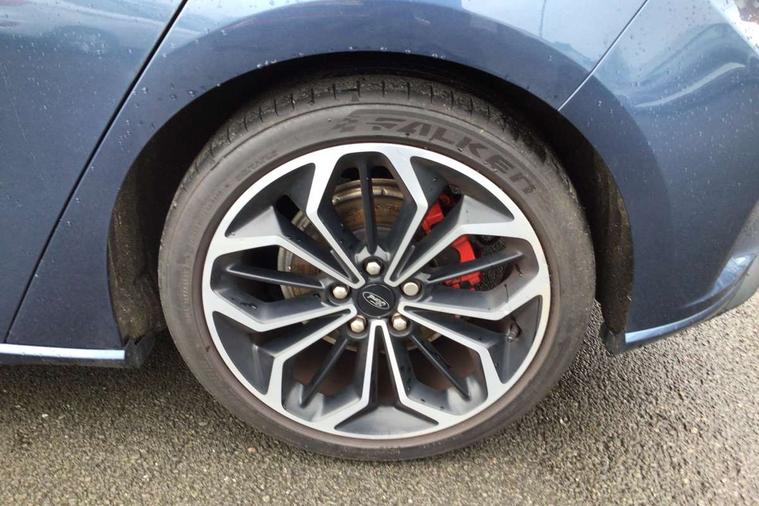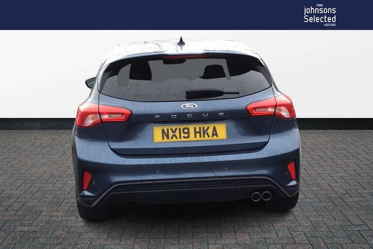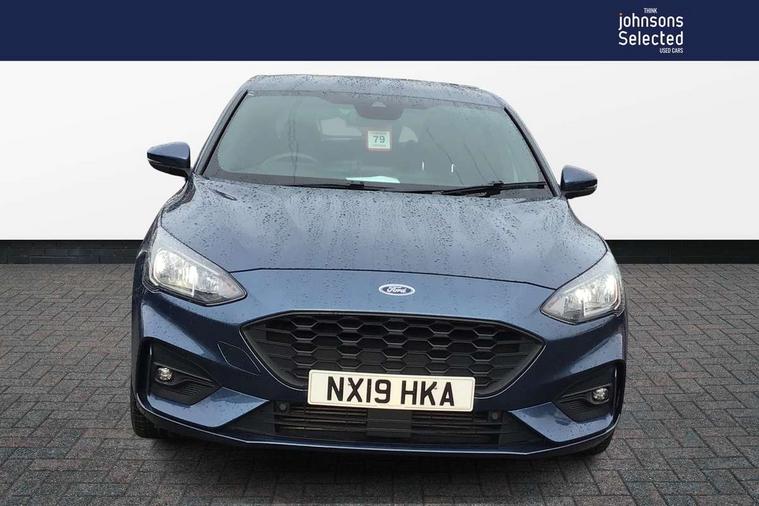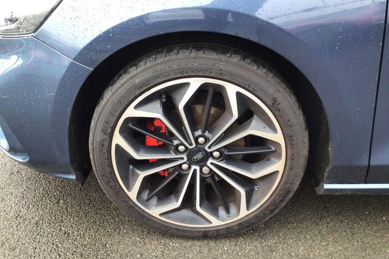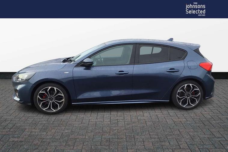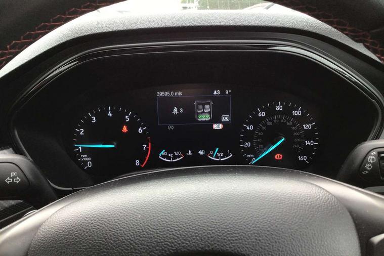 4" TFT coloured cluster screen, Bluetooth system, Digital clock, Easy fuel capless refuelling system, Eco mode, Ford pass connect, Ford SYNC 3 nav system with DAB radio, 8" colour touch screen, voice control, app link, Apple car play/Android auto and 4.2" TFT coloured cluster, Lane keeping aid with lane departure warning, PAS, Selectable drive mode, Trip computer, Sports tuned suspension, 2 USB ports, Aux input, 'Quickclear' heated windscreen/heated washer jets, Auto dimming rear view mirror, Auto headlamps (on/off), Automatic rain sensing wipers, Body colour large rear spoiler, Body colour side skirt, Body coloured bumpers, Body coloured door handles, Body coloured electrically operated and heated door mirrors with side indicators, Electrically operated front and rear windows with one touch opening and closing, Front variable intermittent wipers with electric wash, Heated rear window, LED daytime running lamp, LED front fog lamps with cornering function, Polished twin tailpipe, Power folding door mirrors with puddle lights, Rear privacy glass, ST-Line upper and lower grille with full body styling kit and wing badges, Tailgate wash/wipe, Unique door and instrument panel inserts, 3 spoke flat bottomed leather steering wheel with red stitching, 6 way power adjustable driver seat, 60/40 split back and cushion rear seats with 2 height adjustable headrests, Alloy finish pedals, Aluminium gear knob, Centre console with armrest, Dark headliner, Dual zone electronic air temperature control, Front and rear floor mats with red stitching, Front passenger seat manual height and lumbar adjust, Heated front seats, Height adjustable front headrests, Isofix child seat preparation, Part leather upholstery with red stitching, Reach + rake adjustable steering column, Rear centre headrest, Red stitching on steering wheel, Soft console knee pads with red stitching, ABS+Electronic Brake force Distribution, Auto hold function, Driver airbag, Electronic parking brake, Electronic stability control, Front and rear seatbelt reminder, Front inertia reel height adjustable seatbelts with pre-tensioners, Front passenger airbag, Front side airbags, Hill start assist, Passenger airbag deactivate switch, Post collision braking, Pre collision assist with autonomous emergency braking and pedestrian/cyclist detection, Red brake calipers, Side curtain airbags, Three rear inertia reel lap/diagonal seatbelts, Tyre pressure monitoring system, MyKey system, Remote central locking & engine immobiliser, Thatcham category 1 alarm, Contrast stitching - Red, 18" 5x2 spoke matt black machined finish alloy wheels, Mini steel spare wheel,