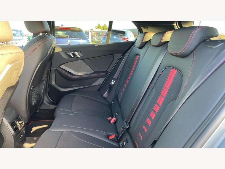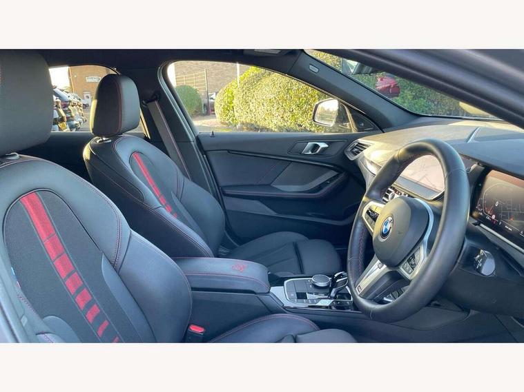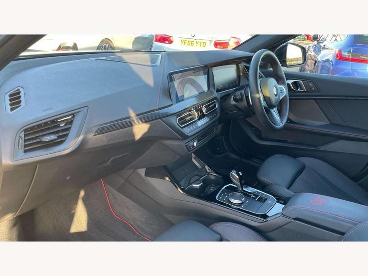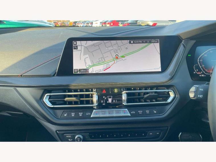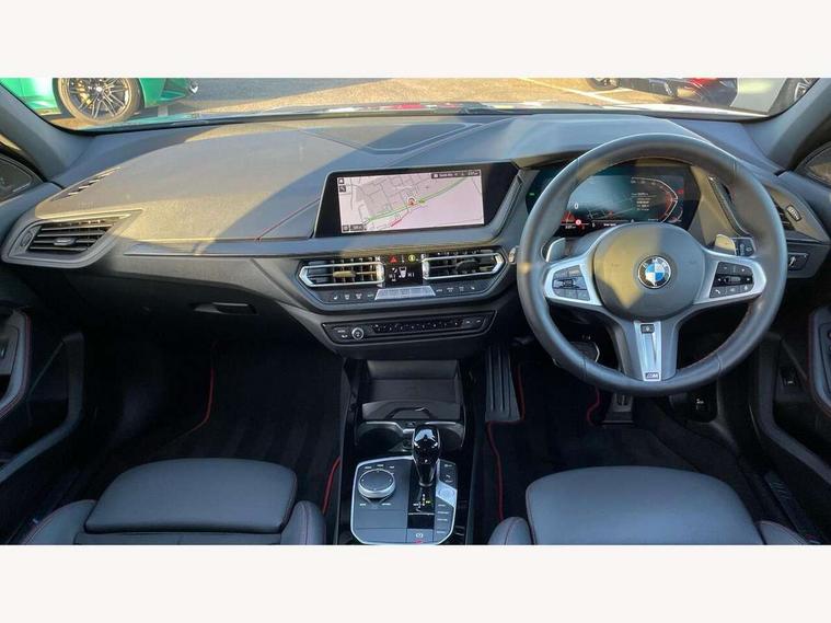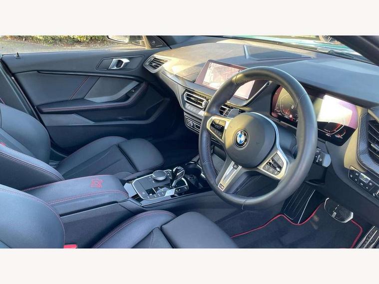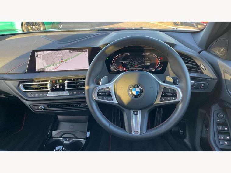 Active guard plus, Attentiveness assist, BMW ConnectedDrive online services, BMW Teleservices, Check Control warning system for monitoring of lights and door/luggage compartment open warning, Cruise control with speed limiter, Eco pro mode, Electric power steering with Servotronic steering optimised at all speed ranges, Front axle single joint with specific axle kinematics to minimise drive influences on steering + provide increased rigidity agile driving behaviour, Integrated owners handbook, Lane departure warning system, Oil sensor for level and grade, On board computer, Optimum shift indicator, Personal Profile, Pull away assistant, Rigidly mounted rear subframe - Multi link construction with separate spring / damper configuration and excellent driving characteristics, Speed limit Info including no-overtaking indicator, Aluminium lightweight construction, Anti roll bar front and rear, Balancer shaft, Double VANOS twin scroll turbocharging system, Drive Performance Control, Eight speed sport automatic transmission with gearshift paddle switches, Electronic differential lock, High precision injection, Larger fuel tank capacity (50 litres), M sport suspension with M128i xDrive specific settings, Petrol Particulate Filter, Twin tube gas filled shock absorbers with degressive characteristic curve, VALVETRONIC engine management, DAB Digital radio, Auto dimming rear view mirror, Automatic headlight beam throw control, Automatic windscreen wipers and automatic headlight, Black chrome tailpipe finishers, BMW individual high gloss shadow line with extended content, Body colour door handles, Body colour mirror caps, Body colour roof trims, Chrome 'M' logo side designation, Chrome kidney grille frame with Satin Aluminium struts, Direction indicator side lights in exterior mirrors, Electrically adjustable exterior mirror with mirror adjustment switch on drivers armrest and aspheric on driver side, convex on passenger side, Fading support, Folding side mirrors with auto dimming/folding wing mirrors with auto dimming, Follow me home headlights, Front and rear bumper system with replaceable deformation elements, Front and rear electric windows with open and close fingertip control, anti trap facility and comfort closing, Front door sill finishers in black plastic with M designation in metallic look, Green tinted heat protection glazing, High gloss shadowline window frame, Recess cover mirror frames and B/C pillar embelisher trim, High level third brake light, Integrated front windscreen with washer jets, Kidney frame and struts in high gloss black extended, LED daytime running lights, LED eyebrow turn indicators, Lightweight engineering, Matt black air guide grilles, Matt black wheel arch trim, Model designation on electric bootlid, Nearside reverse light in rear light cluster, Preparation for high beam assistant, Rear fog lights, Rear side wing doors, Rear window wiper, Shark fin antenna, Trailer stabilisation logic, Visible VIN plate, Welcome lighting, 12V power socket in front centre console with blanking plug, 3 rear seat head restraints, 3 seat bench in 2nd row, Anthracite headlining, Black boot net with lashing eyes, Cargo function on 2nd seat row, Child seat ISOFIX attachment for two outer rear seats and front passenger seat with anchorage points, Conditioned based service, Driver and front passenger backrest net on rear, Driver and front passenger seat heating, Driver side folding compartment in instrument panel, Folding rear clothes hook, Four grab handles integrated in roof lining, Front and rear door pockets with bottle holders, Front and rear side armrest integrated into door trim, Front armrest, Front sports seats, Glove compartment, Height adjustable front head restraints, Luggage compartment for bag hooks on left and right, foldable luggage compartment liner and four lashing eyelets, Manual adjust steering wheel, Multi-function controls for steering wheel, Single front passenger seat, Storage compartment in centre console, Storage compartment in luggage compartment, Stowage of the parcel shelf in luggage compartment trim, Sun visors with vanity mirrors and insert tab, Three spoke M sport design multi function leather steering wheel in unique red stitching, Two front centre console cupholders, Two zone automatic air conditioning, Type C two USB ports in rear centre console, Additional interior lighting pack - 1 Series, BMW live cockpit professional pack- 1 Series, Connected pack professional - 1 Series, Interior lights pack - 1 Series, M Sport exterior styling aerodynamics pack - 1 Series, 2 tone horn, 3 point seatbelts on all seats, front pyrotechnic belt tensioners, stopper and belt force limiters, rear coded belt buckles, Airbags - Front driver/passenger, front and rear curtain head protection, front side, manual deactivation of front passenger airbag, Anti lock braking system (ABS) with brake assist, BMW emergency call, Brake drying, Braking readiness, Child proof locking system in rear door, City braking function, Comfort modes, Cornering brake control, Crash sensor activating of airbags, Unlocking doors, hazard warning lights, interior light, safety battery terminal, Driver and front passenger seat belt security check, Dynamic stability control + (DSC+), Dynamic Traction Control - DTC, Electrically operated hand brake including automatic hold function, Front and rear disc brakes, M Sport brakes with red calipers, M Sport seatbelts, Seatbelt warning, Side impact protection, Tyre pressure monitoring system, Warning triangle and first aid kit, Central locking switch for all doors, fuel filler cap and luggage compartment, Deadlocking function system to all doors, Drive away locking system on all doors and luggage compartment with de-activated in iDrive settings, Locking wheel bolts, Remote control with integrated key with High-gloss Black inlay and M designation and 1 button for open/ close lock, window, open luggage compartment, Start/stop button illuminated in centre console with k