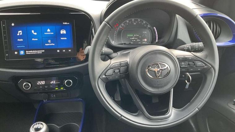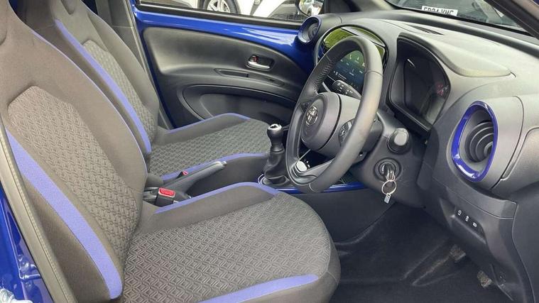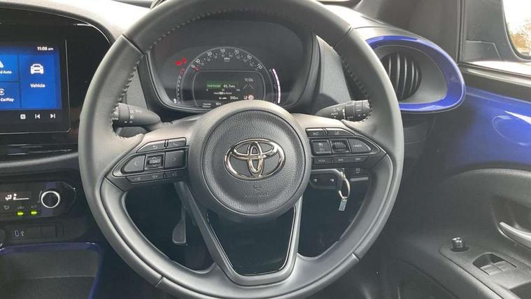 4.2" TFT colour screen, Adjustable speed limiter, Analogue speedometer, Bluetooth connectivity, Digital tachograph, Driver attention alert system, eCall emergency call system, Electric power steering, Intersection turn assist, Key reminder warning, Noise reduction kit, Pre collision system with emergency steering assist, Reversing camera with static guide lines, Smart phone integration with Apple car play/Android Auto, Speed limit display, Start and stop, Vehicle Stability Control (VSC), 4 speakers, 9" HD multimedia display touch screen with Toyota smart connect, DAB digital audio broadcast, USB connector, Auto headlights, Auto wipers, Automatic headlights cut-off, Bicycle towing hook, Black contrast roof, Black side protection mouldings, Black wheel arch mouldings, Body colour door handles, Body coloured front bumper, Boot door scuff plate, Eclipse black rear bumper, Electric heated door mirrors, Follow me home headlights, Front fog lights, Front power windows, Gloss black door mirrors, Gloss black upper front grille, Headlight cut-off reminder, LED daytime running lights, LED front light guide, LED High mounted stop lamp, Manual day/night rear view mirror, Manual headlight levelling, Pagoda roof, Power adjustable door mirrors, Power back door, Privacy glass, Projector halogen headlights, Rain sensor, Rear combination lights LED bulb type, Rear side wing doors, Rear windscreen defogger, Rear windscreen wiper, Short antenna, Variable intermittent windscreen wipers, 12v power outlet - front, 2 seat bench in 2nd row, 3 spoke leather steering wheel, 50/50 split folding rear seat, Adhesive roof headlining, Adjustable speed limiter switch on steering wheel, Audio and telephone switches on steering wheel, Auto air conditioning, Black insert on steering wheel, Black roof lining, Boot light, Centre room light, Chrome interior door handles, Chrome surround on air conditioning buttons, Clean air filter, Console box storage in body color, Fabric upholstery, Floor mats, Front and rear cup holders, Front head rest deco art, Front head restraints, Height adjustable driver seat, Intelligent adaptive cruise control switch on steering wheel, ISOFIX child restraint system on rear seats, Lane departure alert switch on steering wheel, Leather gearshift knob, Manual tilt steering wheel, Manually reclining and sliding driver seat, Manually reclining and sliding front passenger seat, Multimedia switches on steering wheel, Pollen filter, Rear door pockets, Rear head restraints, Satin silver insert on gear shift knob, Single compartment glovebox with lights, Single front passenger seat, Soft tonneau cover, Sun visors with mirror on driver and passenger side, Voice recognition switch on steering wheel, Toyota safety sense pack - Aygo X, Anti lock braking system + Electronic brake force distribution, Child safety door lock, Emergency brake light signal (EBS), Hill start assist control (HAC), Passenger airbag on/off switch, Seat belt reminder for front and rear seats, Supplement restraints system (SRS) - 6 airbags, Traction control, Tyre pressure warning system, Immobiliser, Remote power door locks, Black wheel centre caps, Tyre repair kit,