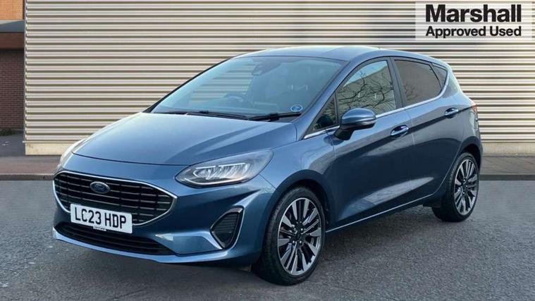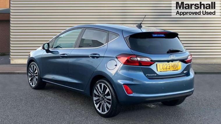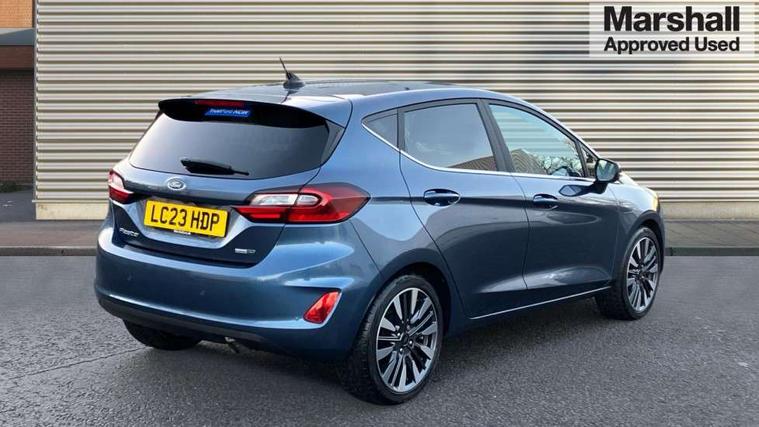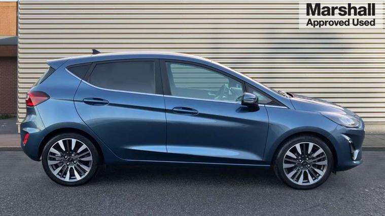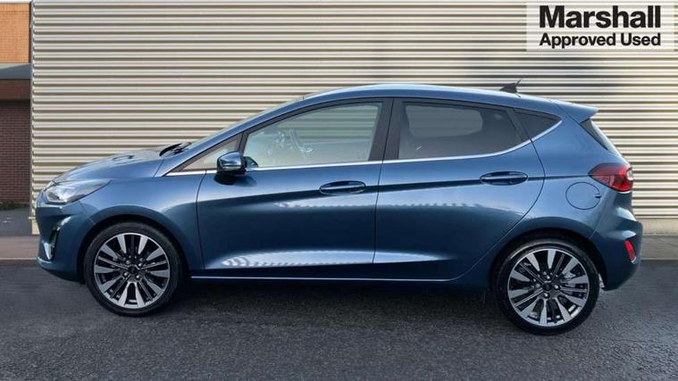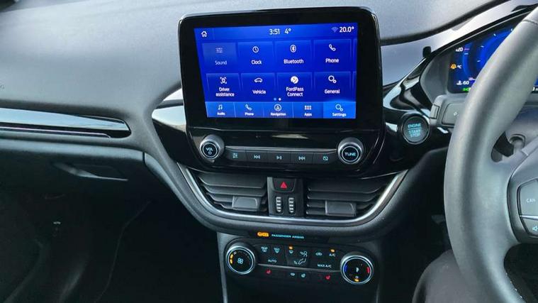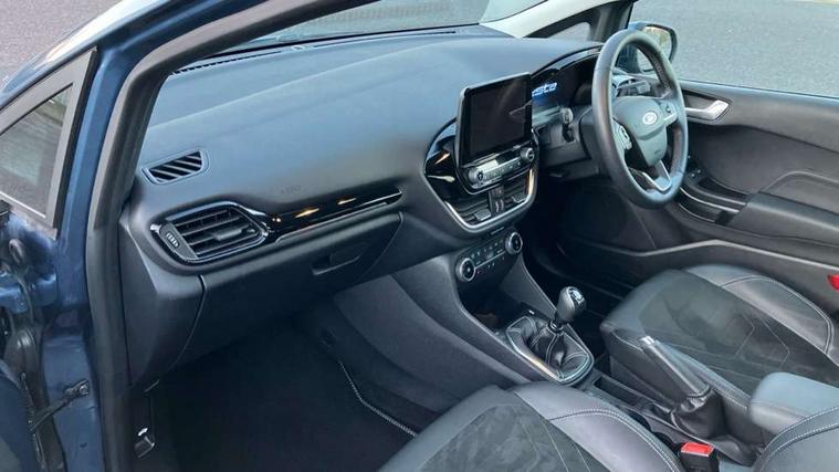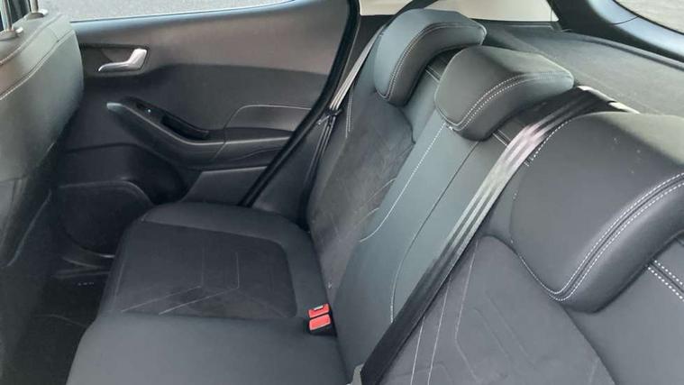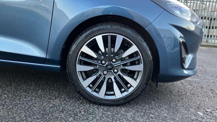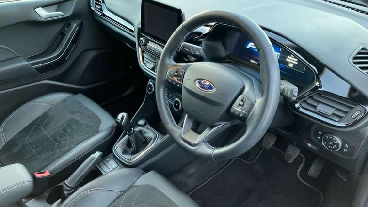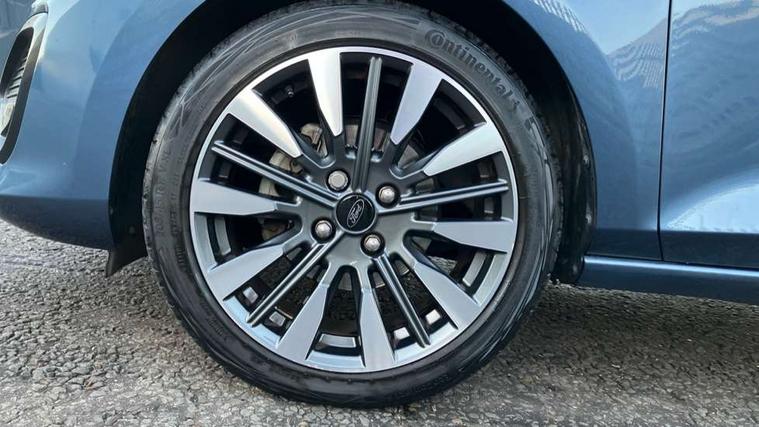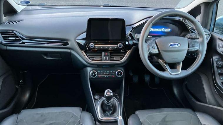 4.2" TFT instrument cluster screen, Bluetooth system, Electric power steering, Ford easy fuel, Rear parking distance sensors, Selectable drive modes (Normal, Sport, Track), Traffic sign recognition, Trip computer, 2 USB ports, Auxiliary input socket, B&O Premium audio system with 8" touchscreen, 10 speakers, 360 degree sound system, Ford SYNC 3 navigation system and Ford pass connect, DAB Digital radio, Steering wheel mounted controls, Auto high beam, Body colour bumpers, Body colour door handles, Body colour rear spoiler, Body coloured electrically operated and heated door mirrors with side indicators, Chrome beltline trim, Chrome front grille, Chrome lower window surround, Cornering front fog lights, Electric front windows/one touch facility, Electric rear windows, LED Night signature to rear lights, Power foldable door mirrors with puddle lights, Quickclear heated windscreen, Rain sensing wipers and auto dimming rear view mirror, Rear privacy glass, Rear wiper, 3 spoke leather trimmed steering wheel with audio control, 60/40 split folding rear seat, Adjustable head restraints, Boot carpet, Centre console with opening armrest, 2x cupholders, 12v and USB, Chrome inner door handles, Drivers and Passenger lumbar support, EATC - Electronic Auto Temperature control, Footwell illumination, Front floor mats in velour, Front map reading lights, Front seat and rear pockets, Height adjustable passenger seat, Illuminated glovebox, Leather gaiter, LED ambient lighting, Load area light, Luxury woven headliner, Manual 4-way driver seat adjust, Overhead console with sunglasses holder, Pollen filter, Rake/reach adjustable steering wheel, Sensico partial premium upholstery, Sensico wrapped steering wheel, NCAP Pack - Fiesta, 3 point seatbelts on all rear seats, ABS+EBA, Curtain airbags, Driver and passenger airbags, Drivers knee airbag, Electronic stability control with hill start assist, Front passenger airbag deactivation, Front side airbags, Seatbelt warning, Two tone horn, Tyre pressure monitoring system, Ford keyfree system with Keyless entry and keyless start, MyKey system, Remote central locking & engine immobiliser, Thatcham Cat.1 alarm, 17" 8 spoke alloy wheels,