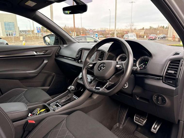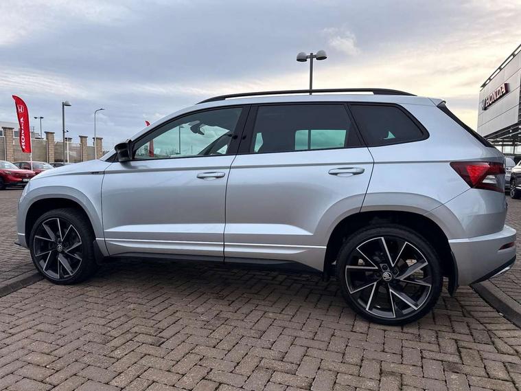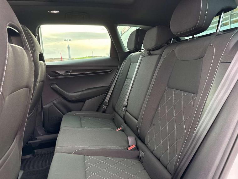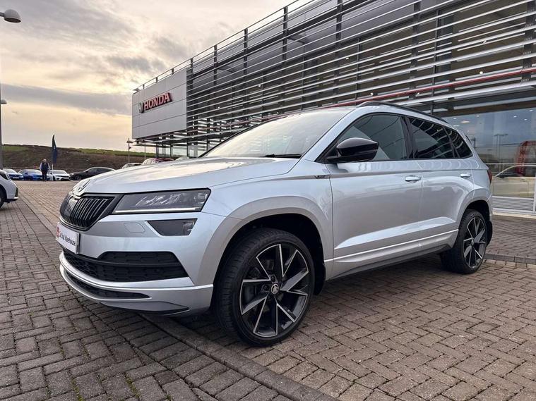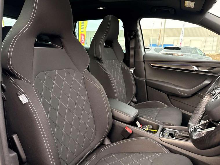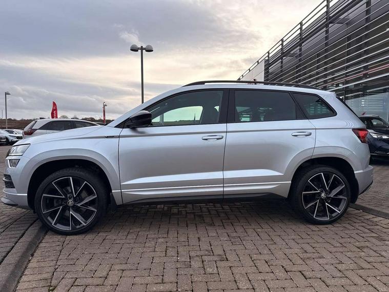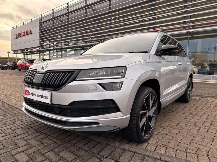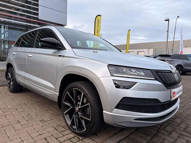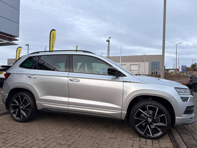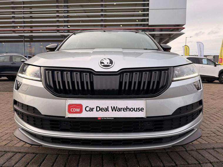 Care connect, Drive mode selector, Driver fatigue sensor, Multifunction colour trip computer, Outside temperature gauge, Service interval indicator, SmartLink wireless for Apple and wired for Android, Start/stop system with regenerative braking, USB C Port x 2 in front centre console, DAB radio with Bluetooth, USB connection, Wireless charging without wireless aerial connection, Acoustic glass, Aero front windscreen wipers with intermittent function, Automatic headlight control system, Black door mirrors, Black electric window control buttons, Black radiator grille, Black roof rails, Body colour door handles, Body coloured bumpers, Electric front and rear windows with child proof lock, Front door steps with SportLine logo, Full LED headlights + adaptive front light system + LED daytime running lights and front cornering fog lights, Headlight washers, Heated rear windscreen, LED rear lights with high functionality, Light assistant (coming/leaving home/tunnel light), Panoramic sliding sunroof, Privacy glass, Protective door side sills in body colour, Rear diffuser, Safety reflectors on front doors, Skoda lettering on tailgate in black, Sportline badge on front fender, Sportline decorative inserts with badging, Sports front and rear bumpers, Third brake light, 1.5 litre bottle holders in driver and front passenger door panels, 12V socket in boot, 12v socket in front centre armrest with storage compartment and rear air vents, 2 Folding hooks and nets in boot, 2 Front readings lights for driver and passenger, 3 rear height adjustable headrests, 4 foldable roof handles with rear coat hooks, Aluminium pedals, Black roof headlining, Cargo elements in boot, Chrome inner door handles, Door sill scuff plates, Driver and passenger seats height adjust, Front head restraints, Height adjustable front three point seats belts with tensioners, Height/reach adjust steering wheel, Ice scraper, Illuminated and cooled glovebox, Illuminated luggage compartment, Isofix child seat preparation outer rear, Manual lumbar support for front seats, Net programme in boot, Pen holder, Pollen filter, Rear reading lights, Rear seats fixed folding and divided 60:40, Retractable parcel shelf attachable to tailgate, Safety vest holder, Solid rear boot cover, Storage box in upper central dashboard closed, Storage compartment below the passenger seat, Sunvisors with illuminated vanity mirrors, Textile floor mats, Umbrella under passenger seat, Welcome animation with sportline logo, LED Interior lighting pack with Skoda welcome logo - Karoq, Airbags - Front side, head, knee and curtain, Automatic door unlocking in case of crash, Automatic fuel cut off in case of crash, Driver airbag, Electronic parking brake with auto hold function, Emergency rear braking signal, ESC including ABS, MSR, ASR, EDS, HBA, DSR, RBS, MKB and traction control, Front assist radar scanning of the space in front of the car with automatic braking, Hill hold control, Passenger airbag with switch-off function, Pedestrian monitor, Seatbelt reminder signalisation and pretensioner for all seats, Three point seatbelts rear, Two tone horn, Tyre pressure display, Tyre pressure monitor, Alarm with interior monitoring, back up horn and tilt sensor with safe function, Electronic engine immobiliser, Keyless entry and keyless start with safe system, Remote central locking with 2 remote folding keys, Black air vent surround, 19" Vega anthracite alloy wheels, Anti-theft wheel bolts protection, Storage on wheel cover,