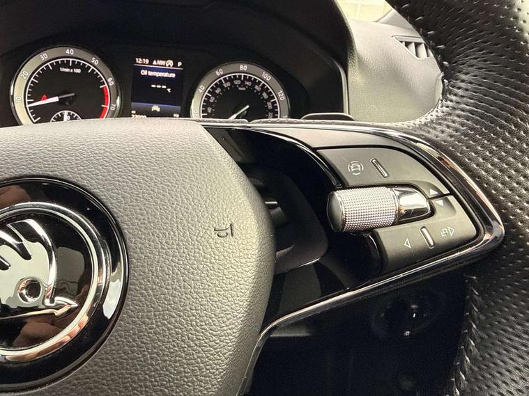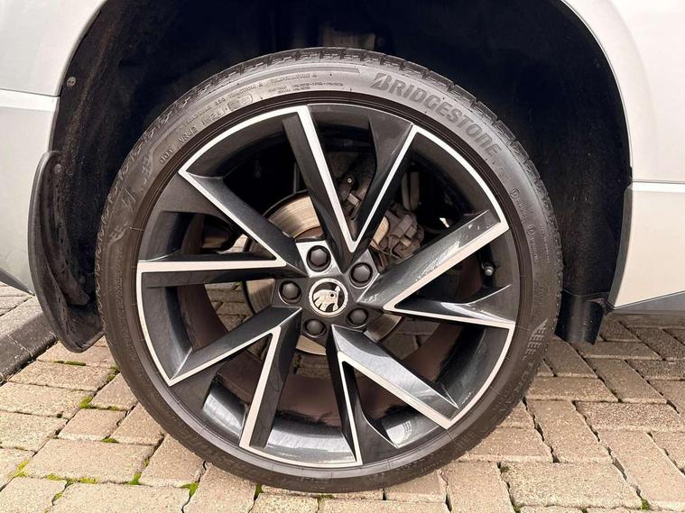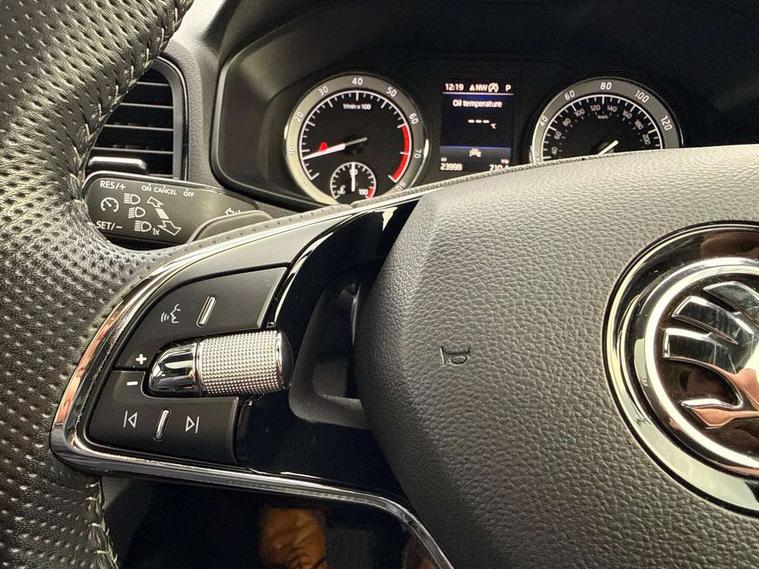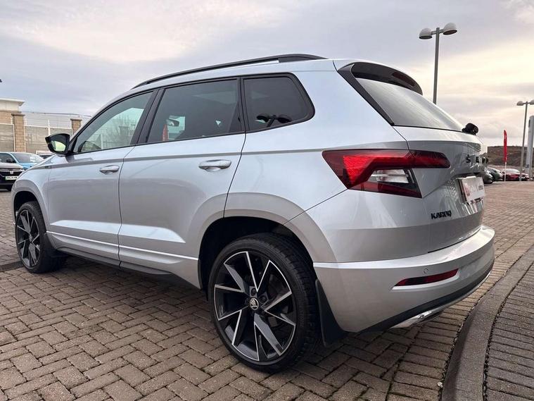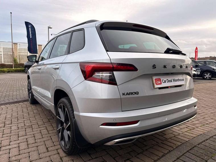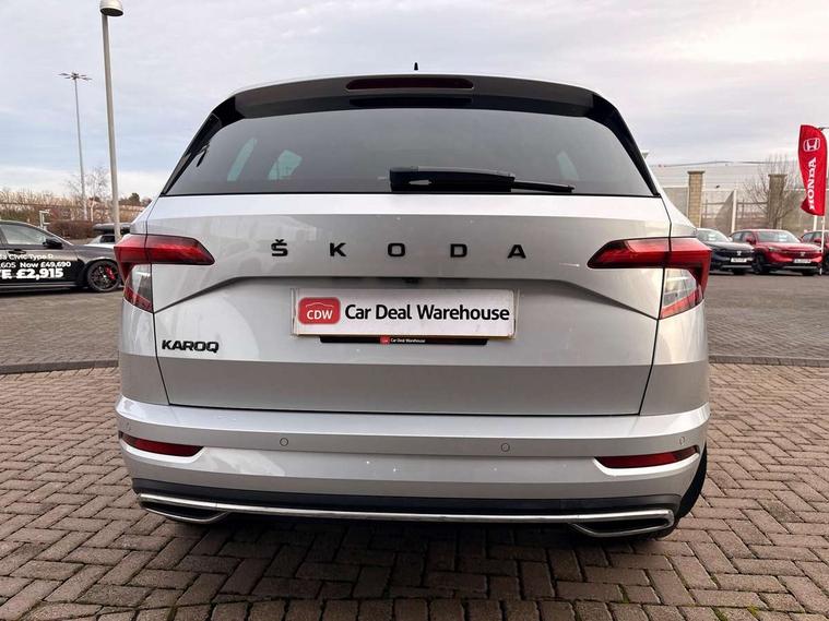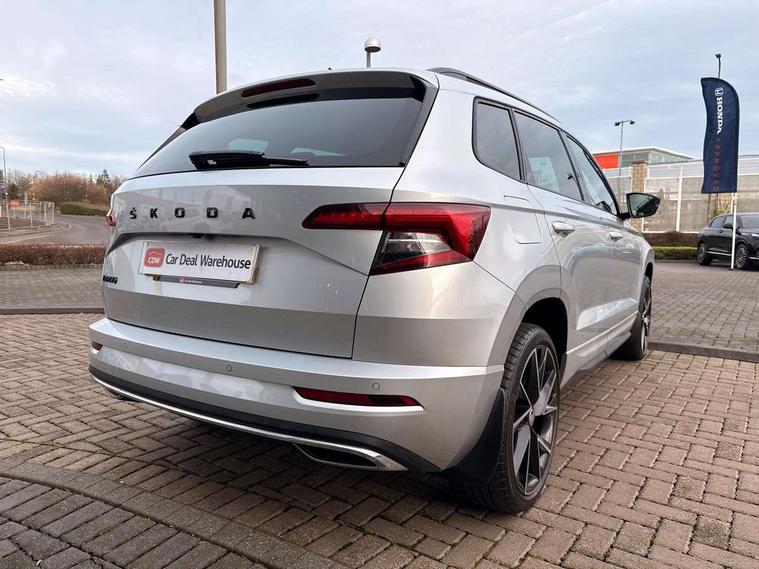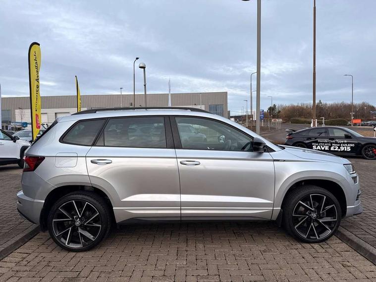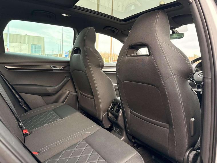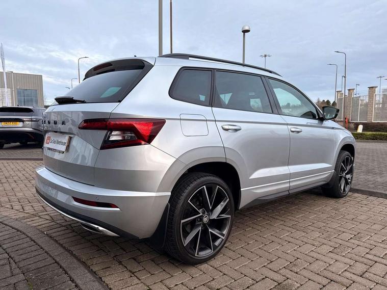 Care connect, Drive mode selector, Driver fatigue sensor, Multifunction colour trip computer, Outside temperature gauge, Service interval indicator, SmartLink wireless for Apple and wired for Android, Start/stop system with regenerative braking, USB C Port x 2 in front centre console, DAB radio with Bluetooth, USB connection, Wireless charging without wireless aerial connection, Acoustic glass, Aero front windscreen wipers with intermittent function, Automatic headlight control system, Black door mirrors, Black electric window control buttons, Black radiator grille, Black roof rails, Body colour door handles, Body coloured bumpers, Electric front and rear windows with child proof lock, Front door steps with SportLine logo, Full LED headlights + adaptive front light system + LED daytime running lights and front cornering fog lights, Headlight washers, Heated rear windscreen, LED rear lights with high functionality, Light assistant (coming/leaving home/tunnel light), Panoramic sliding sunroof, Privacy glass, Protective door side sills in body colour, Rear diffuser, Safety reflectors on front doors, Skoda lettering on tailgate in black, Sportline badge on front fender, Sportline decorative inserts with badging, Sports front and rear bumpers, Third brake light, 1.5 litre bottle holders in driver and front passenger door panels, 12V socket in boot, 12v socket in front centre armrest with storage compartment and rear air vents, 2 Folding hooks and nets in boot, 2 Front readings lights for driver and passenger, 3 rear height adjustable headrests, 4 foldable roof handles with rear coat hooks, Aluminium pedals, Black roof headlining, Cargo elements in boot, Chrome inner door handles, Door sill scuff plates, Driver and passenger seats height adjust, Front head restraints, Height adjustable front three point seats belts with tensioners, Height/reach adjust steering wheel, Ice scraper, Illuminated and cooled glovebox, Illuminated luggage compartment, Isofix child seat preparation outer rear, Manual lumbar support for front seats, Net programme in boot, Pen holder, Pollen filter, Rear reading lights, Rear seats fixed folding and divided 60:40, Retractable parcel shelf attachable to tailgate, Safety vest holder, Solid rear boot cover, Storage box in upper central dashboard closed, Storage compartment below the passenger seat, Sunvisors with illuminated vanity mirrors, Textile floor mats, Umbrella under passenger seat, Welcome animation with sportline logo, LED Interior lighting pack with Skoda welcome logo - Karoq, Airbags - Front side, head, knee and curtain, Automatic door unlocking in case of crash, Automatic fuel cut off in case of crash, Driver airbag, Electronic parking brake with auto hold function, Emergency rear braking signal, ESC including ABS, MSR, ASR, EDS, HBA, DSR, RBS, MKB and traction control, Front assist radar scanning of the space in front of the car with automatic braking, Hill hold control, Passenger airbag with switch-off function, Pedestrian monitor, Seatbelt reminder signalisation and pretensioner for all seats, Three point seatbelts rear, Two tone horn, Tyre pressure display, Tyre pressure monitor, Alarm with interior monitoring, back up horn and tilt sensor with safe function, Electronic engine immobiliser, Keyless entry and keyless start with safe system, Remote central locking with 2 remote folding keys, Black air vent surround, 19" Vega anthracite alloy wheels, Anti-theft wheel bolts protection, Storage on wheel cover,