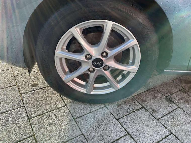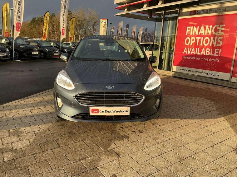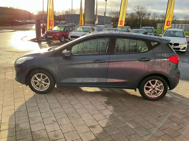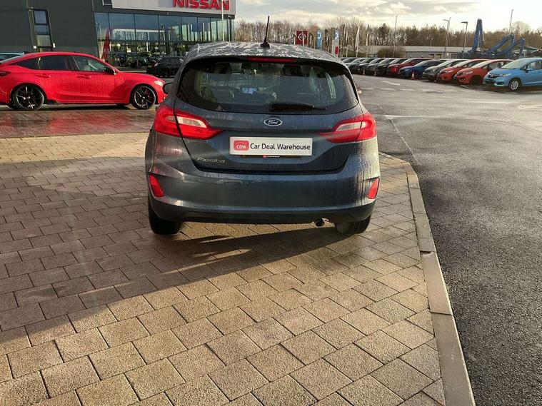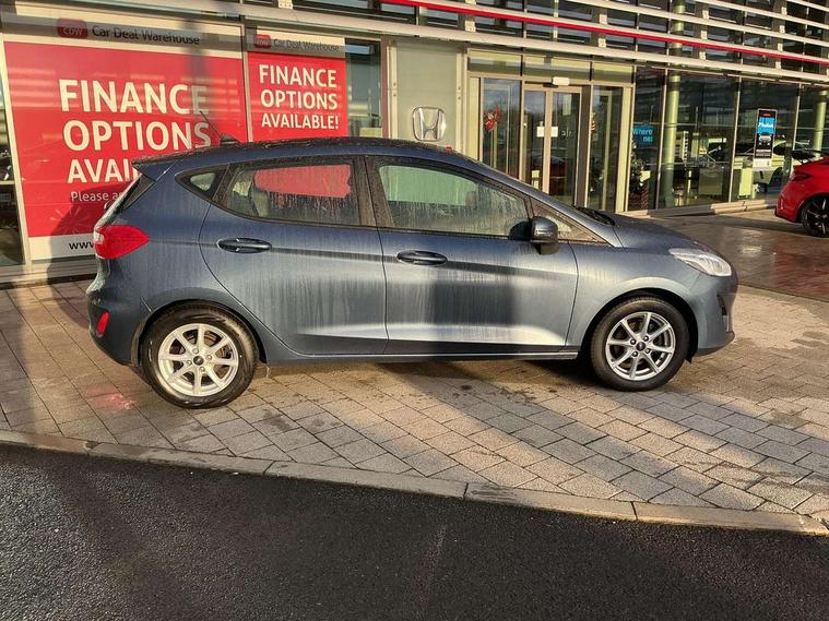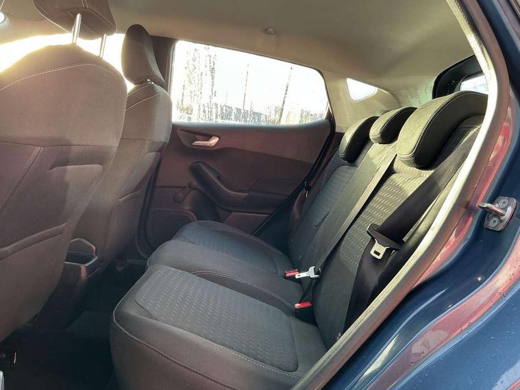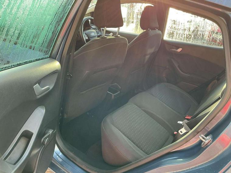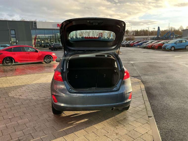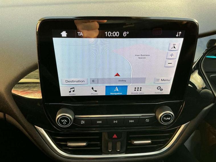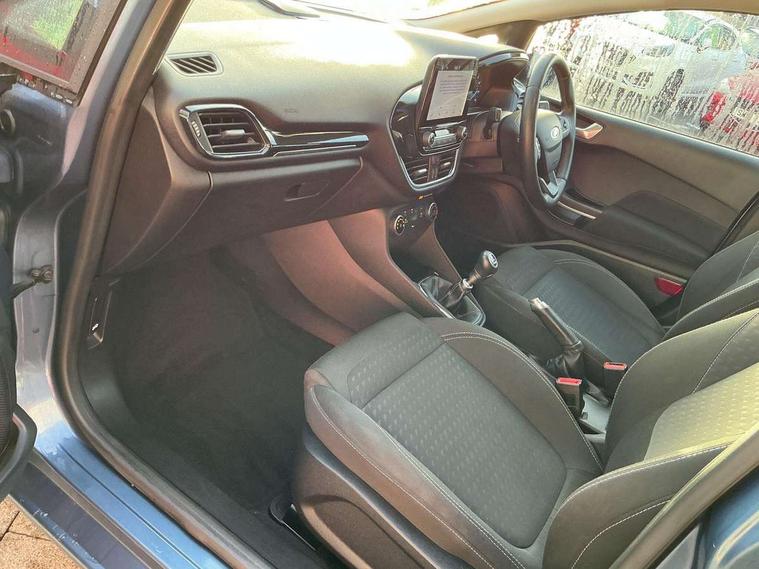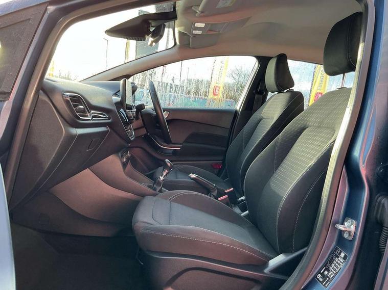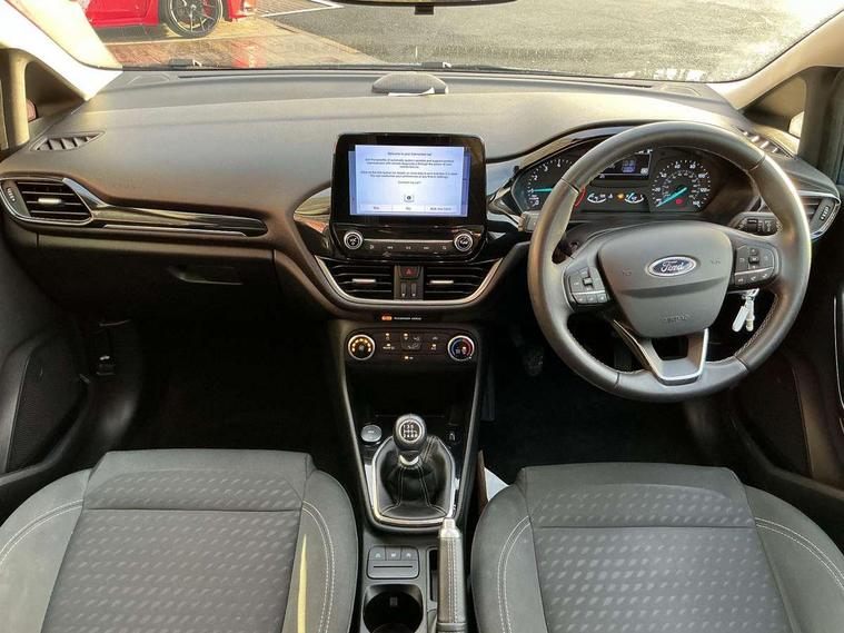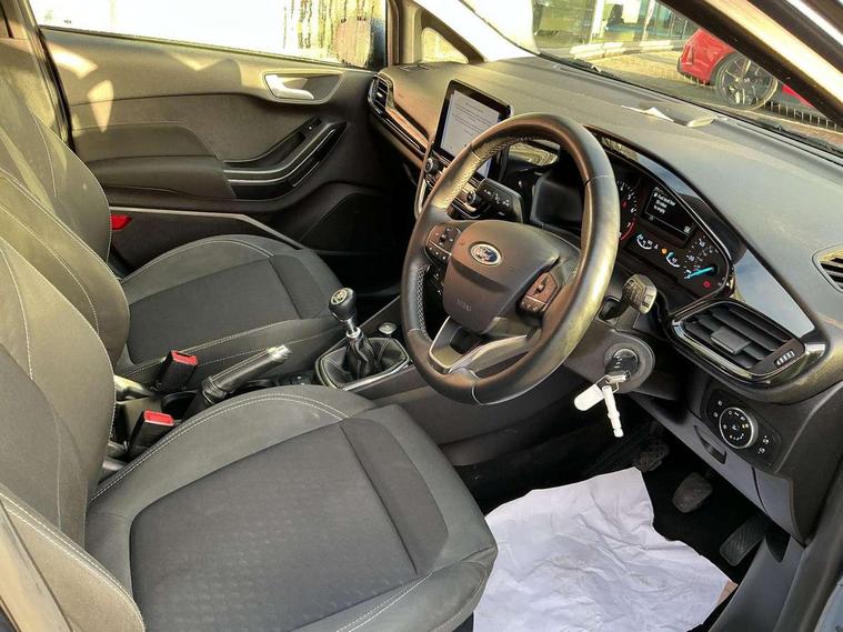 Bluetooth system, Electric power steering, Ford easy fuel, Trip computer, 2 USB ports, Auxiliary input socket, DAB Digital radio, Steering wheel mounted controls, Automatic headlights, Body colour bumpers, Body colour door handles, Body colour electric adjustable heated door mirrors with integral indicators, Body colour rear spoiler, Chrome beltline trim, Cornering front fog lights, Electric front windows/one touch facility, Halogen projector style headlights with static cornering lights + LED daytime running lights, Quickclear heated windscreen, Rear wiper, Tinted glass, Upper front grille chrome surround, 12V Accessory socket in centre console, 3 spoke leather trimmed steering wheel with audio control, 60/40 split folding rear seat, Adjustable head restraints, Boot carpet, Chrome inner door handles, Cloth upholstery, Footwell illumination, Front map reading lights, Front seat and rear pockets, Height adjustable driver's seat, Illuminated glovebox, Leather gear knob, Leather trimmed handbrake handle, Load area light, Luxury woven headliner, Manual air conditioning, Overhead console with sunglasses holder, Pollen filter, Rake/reach adjustable steering wheel, Rear centre head restraint, NCAP Pack - Fiesta, 3 point seatbelts on all rear seats, ABS+EBA, Curtain airbags, Driver and passenger airbags, Drivers knee airbag, Electronic stability control with hill start assist, Front passenger airbag deactivation, Front side airbags, Seatbelt warning, Tyre pressure monitoring system, MyKey system, Remote central locking & engine immobiliser, Thatcham Cat.1 alarm,