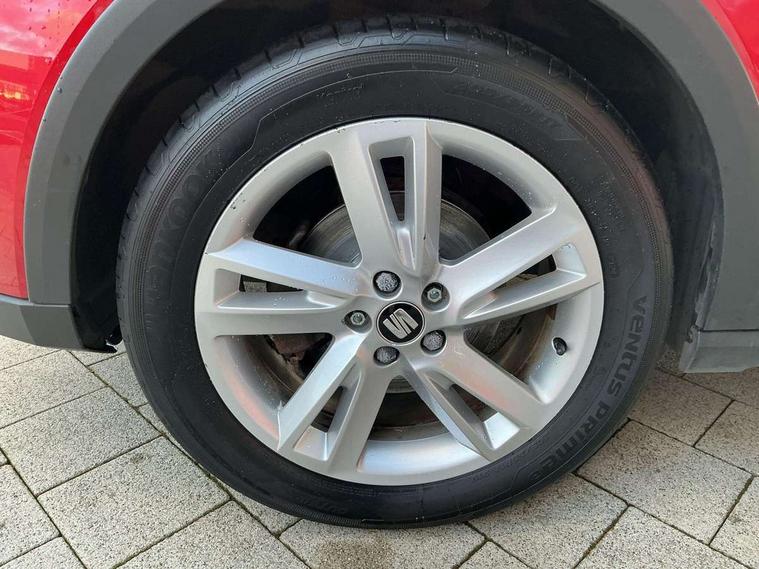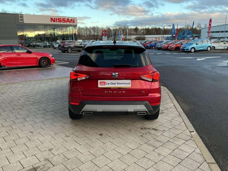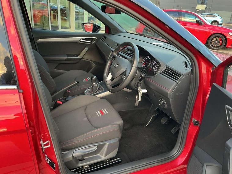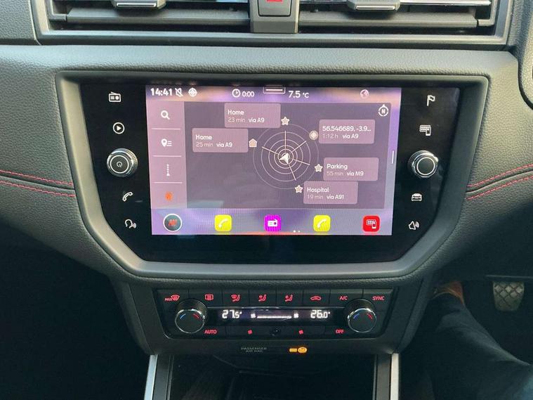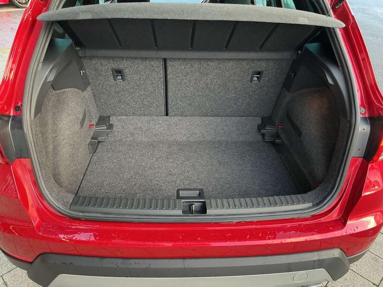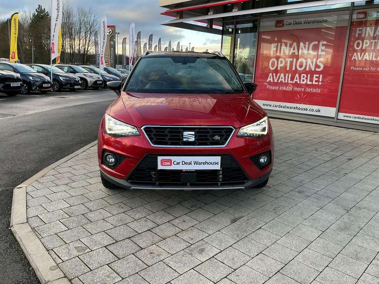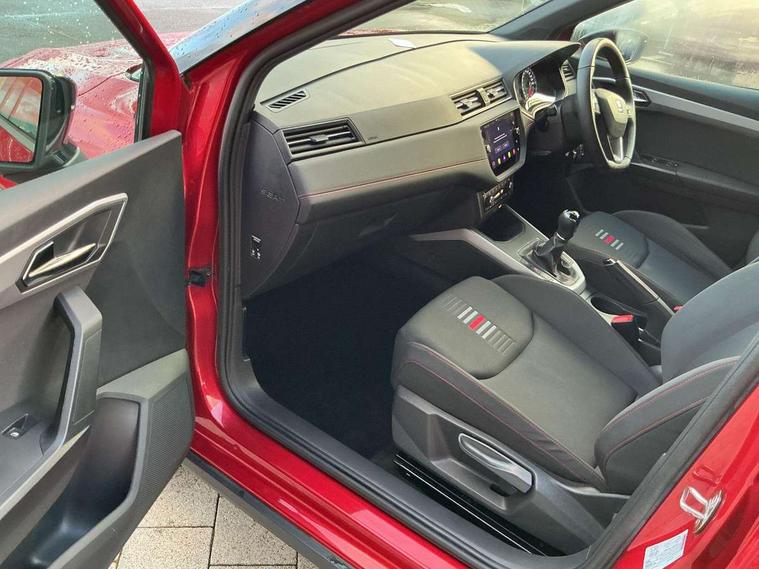 'Lights On' Reminder warning buzzer, Cruise control and speed limiter, Digital clock, Electric speed sensitive power steering, Full Link Smartphone Integration with Mirror Link, Apple Car Play, Google Android Auto with USB Type C cable for Apple and Android compatibility, Low fuel warning light, Outside temperature display, Rear parking sensor, RPM counter, Seat connect with safety, service, remote and online, SEAT Drive profile - Four different models normal-sport-eco-individual, steering response, throttle response, Trip computer, Sports suspension, Bluetooth interface for hands free and audio streaming, DAB digital radio and AM/FM radio, Steering wheel mounted audio controls, Anti theft roof antenna, Auto dimming interior rear view mirror, Automatic activation of hazard warning lights, Automatic headlights, Body coloured bumpers, Body coloured door handle inserts, Chrome front grille frame, Chrome roof rails, Chrome window trim, Coming/leaving home lighting function, Dark tinted rear windows, Electric front/rear windows with one touch/auto up/down, Electrically adjustable, heated and folding door mirrors, Full LED headlights dipped and mainbeam + front and rear fog lights, LED daytime running lights, LED rear tail lights and licence plate lights, Protective side mouldings, Rain sensing wipers, Rear window wash/wipe, Roof colour door mirrors, Twin exhaust pipe styling hidden exhaust pipe, Visible VIN plate, Windshield wiper with intermittent control and potentiometer, 2 cupholders, 60/40 split folding rear seat, Aircare filter, Black interior roof, Double boot floor, Driver sunvisor with covered mirror + card holder, Dual zone climate control, Front courtesy light with front reading lights, Front sport seats, Gear shift indicator, Height adjustable front seats, Height/reach adjustable steering column, Illuminated boot, Instrument lighting with brightness control, Interior light in footwell, central console and door panel, ISOFIX points in outer rear seats with top tether anchorage points, Multi-colour ambient interior lighting, Nora cloth upholstery, Passenger sunvisor with vanity mirror, Perforated flat bottomed leather steering wheel/gear knob/handbrake with red stitching and FR logo, Two front and three rear height adjustable headrests, Connectivity pack plus - Arona, Interior chrome pack - Arona, 3 point seatbelts on all rear seats, ABS, Active front headrests, Child locks on rear doors, Driver and front passenger airbags with front passenger airbag de activation, front side and curtain airbags, Electronic stability control, Emergency Brake Assist (EBA) and front assist, Front and rear seatbelt reminder, Hill hold control, Multi-Collision braking, Tiredness recognition system, Traction control, Tyre pressure monitoring system, 2 folding remote keys with window open/close function, Alarm with back-up horn, Electronic engine immobiliser, Locking wheel bolts, Remote central locking + deadlocks, Tow away protection, Interior chrome line trim, Leatherette dashboard, 17" Dynamic alloy wheels,