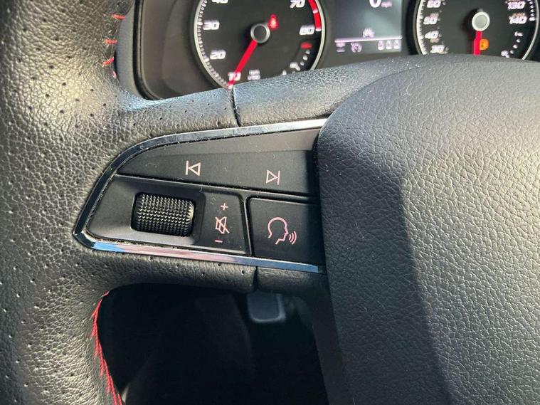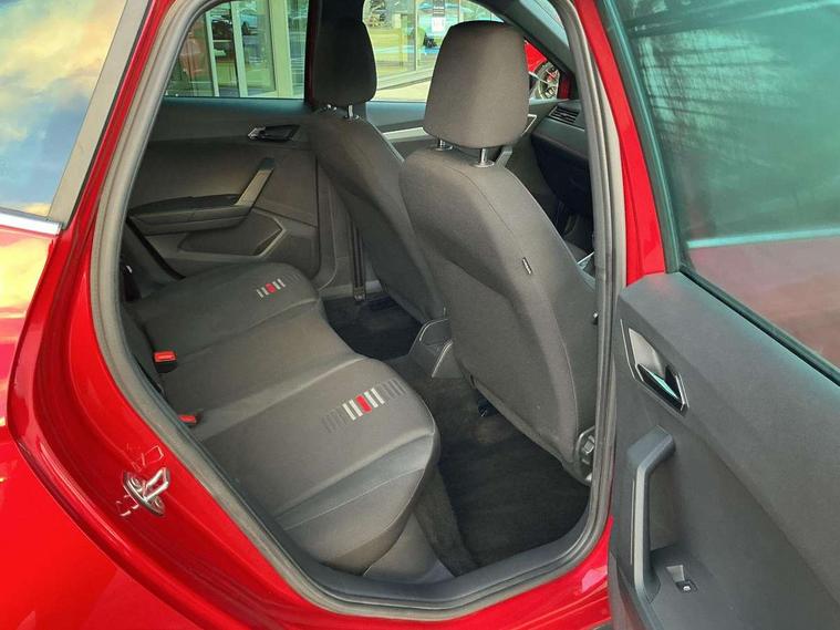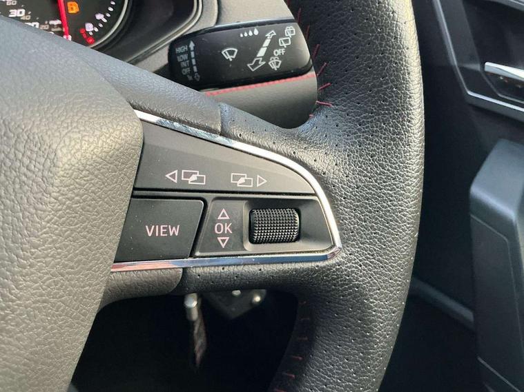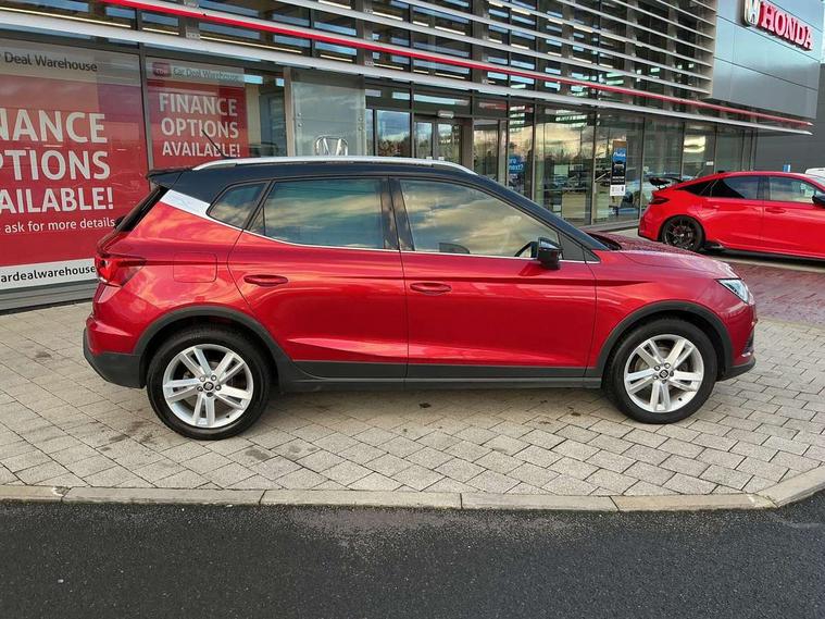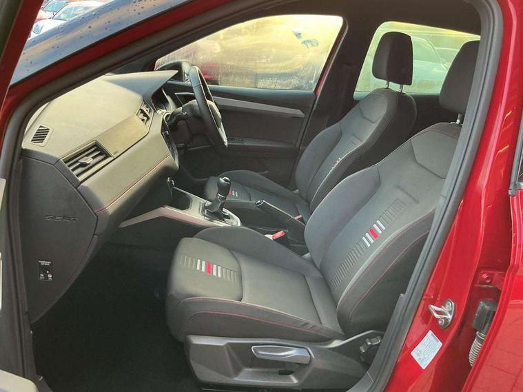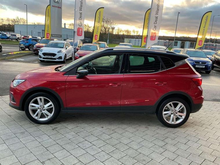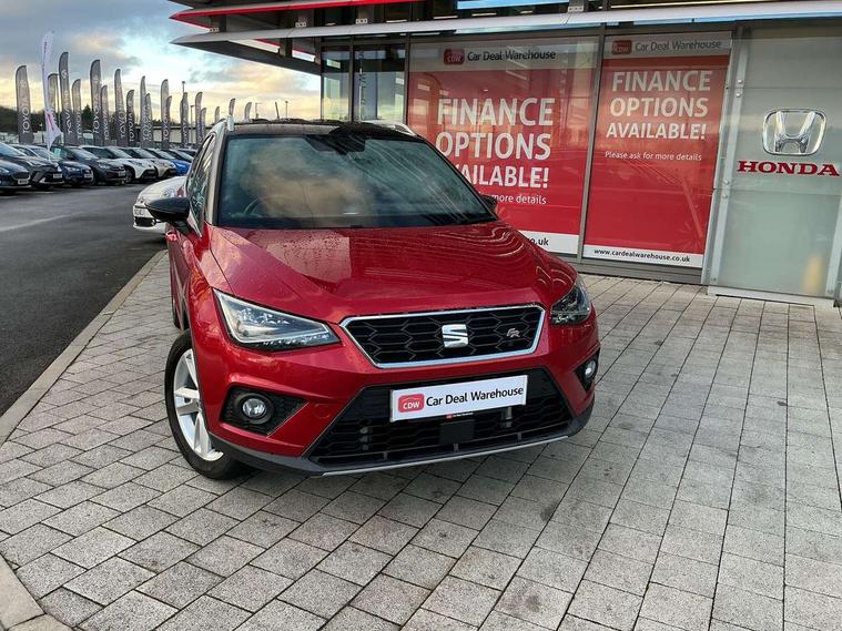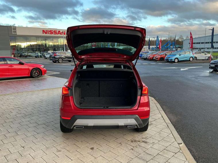'Lights On' Reminder warning buzzer, Cruise control and speed limiter, Digital clock, Electric speed sensitive power steering, Full Link Smartphone Integration with Mirror Link, Apple Car Play, Google Android Auto with USB Type C cable for Apple and Android compatibility, Low fuel warning light, Outside temperature display, Rear parking sensor, RPM counter, Seat connect with safety, service, remote and online, SEAT Drive profile - Four different models normal-sport-eco-individual, steering response, throttle response, Trip computer, Sports suspension, Bluetooth interface for hands free and audio streaming, DAB digital radio and AM/FM radio, Steering wheel mounted audio controls, Anti theft roof antenna, Auto dimming interior rear view mirror, Automatic activation of hazard warning lights, Automatic headlights, Body coloured bumpers, Body coloured door handle inserts, Chrome front grille frame, Chrome roof rails, Chrome window trim, Coming/leaving home lighting function, Dark tinted rear windows, Electric front/rear windows with one touch/auto up/down, Electrically adjustable, heated and folding door mirrors, Full LED headlights dipped and mainbeam + front and rear fog lights, LED daytime running lights, LED rear tail lights and licence plate lights, Protective side mouldings, Rain sensing wipers, Rear window wash/wipe, Roof colour door mirrors, Twin exhaust pipe styling hidden exhaust pipe, Visible VIN plate, Windshield wiper with intermittent control and potentiometer, 2 cupholders, 60/40 split folding rear seat, Aircare filter, Black interior roof, Double boot floor, Driver sunvisor with covered mirror + card holder, Dual zone climate control, Front courtesy light with front reading lights, Front sport seats, Gear shift indicator, Height adjustable front seats, Height/reach adjustable steering column, Illuminated boot, Instrument lighting with brightness control, Interior light in footwell, central console and door panel, ISOFIX points in outer rear seats with top tether anchorage points, Multi-colour ambient interior lighting, Nora cloth upholstery, Passenger sunvisor with vanity mirror, Perforated flat bottomed leather steering wheel/gear knob/handbrake with red stitching and FR logo, Two front and three rear height adjustable headrests, Connectivity pack plus - Arona, Interior chrome pack - Arona, 3 point seatbelts on all rear seats, ABS, Active front headrests, Child locks on rear doors, Driver and front passenger airbags with front passenger airbag de activation, front side and curtain airbags, Electronic stability control, Emergency Brake Assist (EBA) and front assist, Front and rear seatbelt reminder, Hill hold control, Multi-Collision braking, Tiredness recognition system, Traction control, Tyre pressure monitoring system, 2 folding remote keys with window open/close function, Alarm with back-up horn, Electronic engine immobiliser, Locking wheel bolts, Remote central locking + deadlocks, Tow away protection, Interior chrome line trim, Leatherette dashboard, 17" Dynamic alloy wheels,