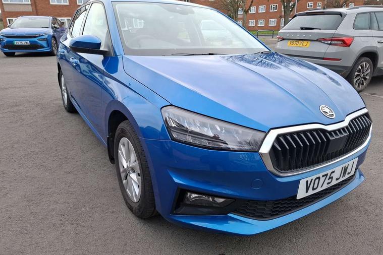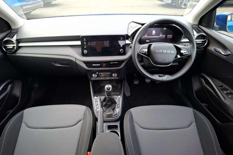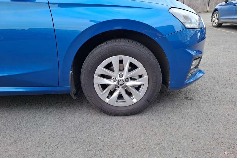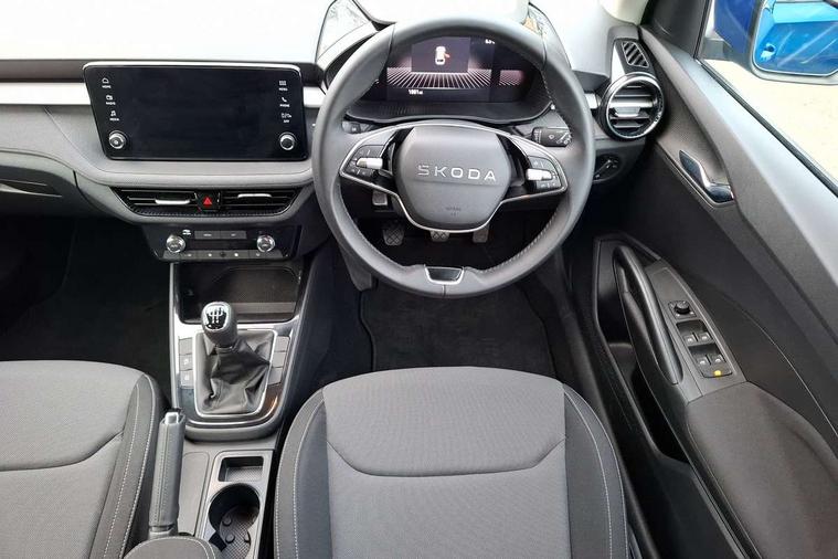 8" Digital instrument display, Advanced driver attention and drowsiness monitor, Bluetooth connection, Driver alert system, Electromechanical power steering, Exterior temperature gauge, Service interval indicator, Traffic sign recognition, Wireless SmartLink for Apple CarPlay and Android Auto, 6 Speakers (4 in front and 2 in rear), 8.25" Skoda infotainment touchscreen display, Auxiliary socket for external MP3 player, DAB digital radio reception, Auto dimming rear view mirror, Body colour door mirrors, Body coloured bumpers, Door mirror integrated indicators, Front and rear electric windows, Front window wiper intermittent control, Headlight range control - Automatic, Ice scraper in fuel cap, LED 3rd brake light, LED daytime running lights with coming and leaving home feature, LED rear lights, Rear LED fog light, Rear side wing doors, Rear window wiper with washing nozzles, Roof mounted spoiler, SKODA tailgate lettering in chrome, Unique dark chrome design logo on alloy wheels, 2 reading lights in front and 2 reading lights in rear, 3 rear headrests, Backrest split and folding, Central console with removable cup holder and storage box, Chrome handbrake release button, Dual zone air conditioning with climatronic electronic control, Fabric upholstery, Front centre armrest, Gearshift knob/handle in leather, Grain satin black interior door handles, Hand brake lever handle in leather, Height adjustable front headrests, Height adjustable front seats, Height adjustable steering wheel, ISOFIX and TopTether anchorage points to the outer rear seats, ISOFIX and TopTether on the front passenger seat, Luggage compartment lighting, Manually adjustable lumbar support in front seats, Pollen filter, Rear seat bench unsplit, Single front passenger seat, Skoda lettering on steering wheel, Storm grey headlining, Sun visors with mirror and airbag label on passenger side, Textile floor mats, Ticket holder, Umbrella in drivers door, Ambient lighting pack - Fabia Hatchback, 3-point height adjustable front seats belts with pretensioner and force limiter, Automatic warning lights in case of crash, Driver and passengers airbag with switch off function, e-Call+, ESC including ABS, MSR, ASR, EDS, HBA and XDS, Front and rear seat belt warning, FRONT ASSIST (AEB City and AEB Inter Urban), Front side airbags, Head airbags, One tone horn, Pedestrian protection, Three rear 3-points safety seat belts with pretensioner and force limiter including stop function for outer rear seat belts, Tyre pressure monitoring system, Anti-theft alarm system including immobiliser, interior monitoring, backup horn, and towing protection, Central locking with radio remote control, interior controls, SAFE function and 2 foldable keys, Black painted air vents, Grain satin black central console cover, Metallic grey upper decorative trim, Satin black door and side trim panel in front, Textile Kota grey lower decorative inserts, Anti-theft wheel bolts protection, Super-low rolling resistance tyres,