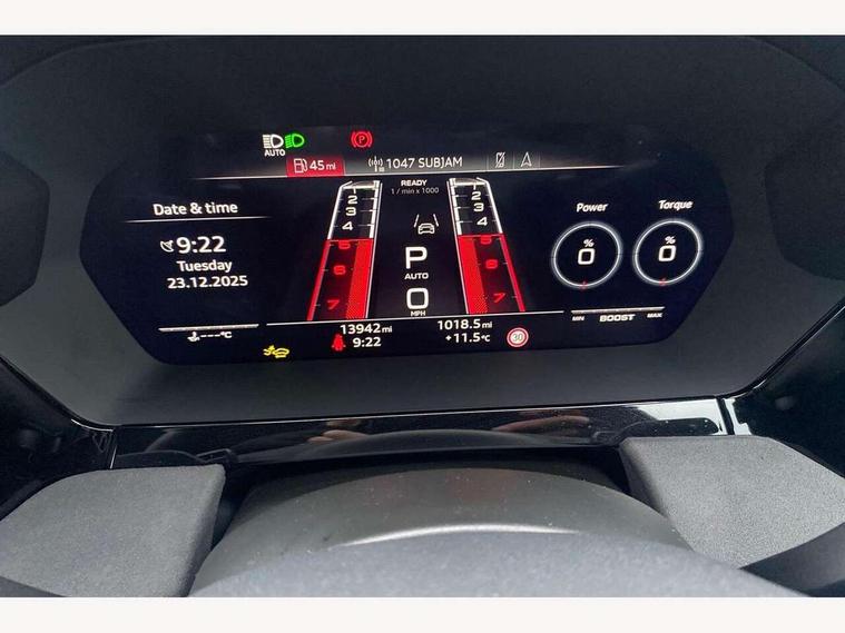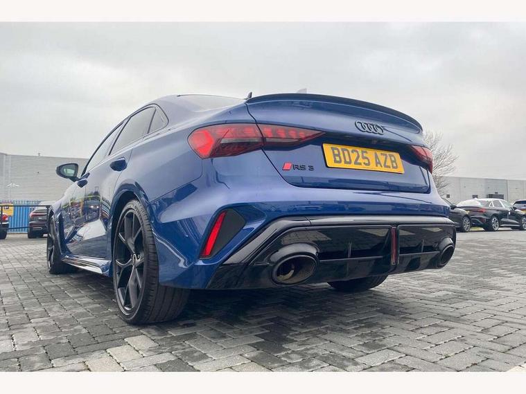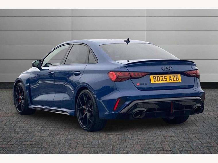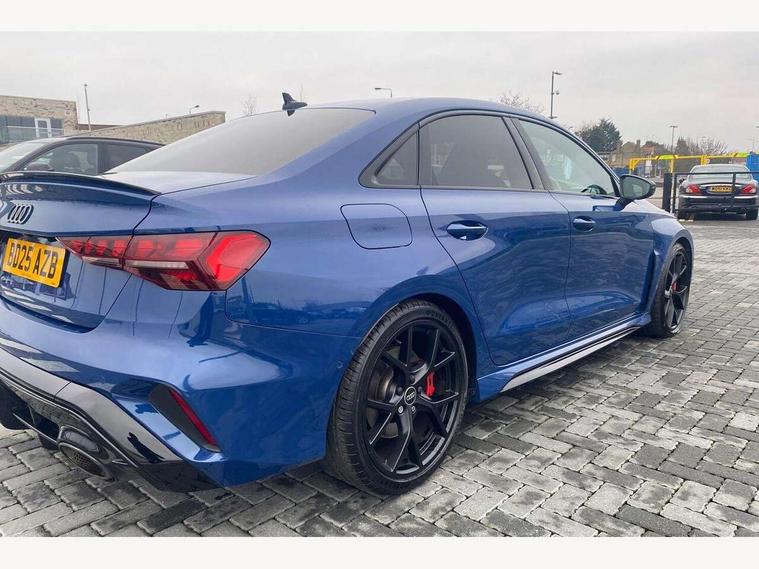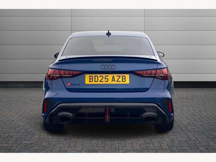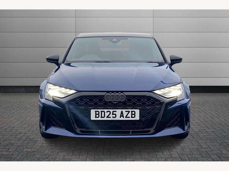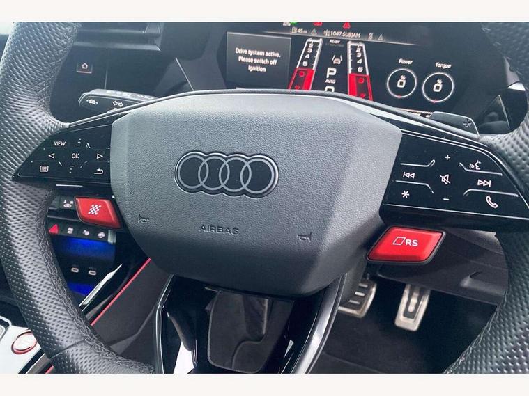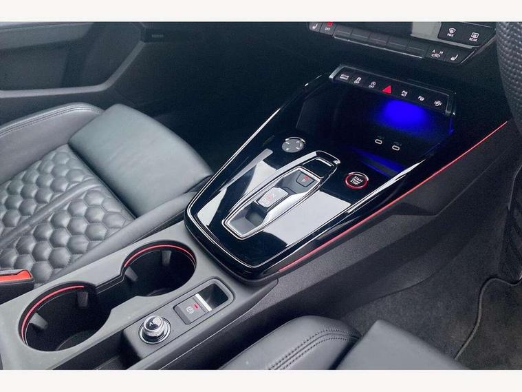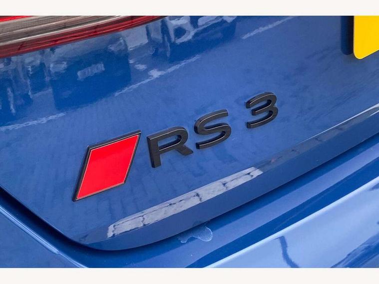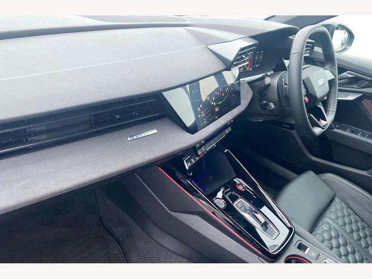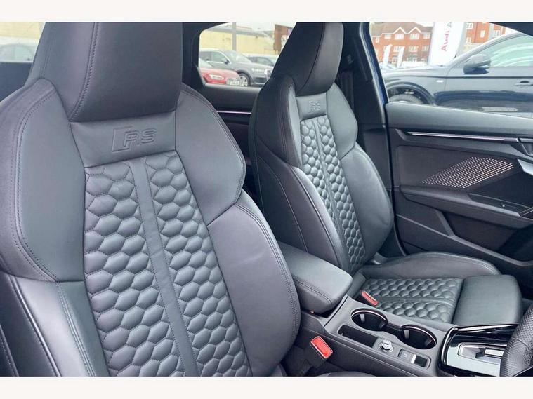 Adjustable speed limiter, Audi drive select comfort, auto, dynamic and efficiency, Audi smartphone interface with app store includes wireless Apple carplay, Android auto and Amazon alexa integration, Audi virtual cockpit plus with RS specific design and 12.3" display with additional graphic display options, Automatic start/stop system with recuperation, Bluetooth interface, Camera based traffic sign recognition, Collision avoidance assistant, Distraction and Fatigue warning, e-Call (emergency call), Lane departure warning system, MMI Navigation Plus with high resolution 10.1" colour touch screen display, Park Assist with parking system Plus, Progressive steering, RS specific driving modes - RS Individual, RS Performance and RS Torque rear, Voice control system with natural language interaction, Quattro permanent four wheel drive, Audi Phonebox light with wireless charging, DAB Digital radio, USB ports with charging function in the rear, All weather light, Audi beam LED projection of RS logo on ground as you exit, Auto dimming frameless rear view mirror, Automatic dynamic range control, Dipped beam, main beam, position light and turning light, Electrically adjustable/heated/folding/auto dimming door mirrors with integrated LED indications + kerb view function for passenger side, Exterior model badging, Front electric windows, Heat insulating glass windscreen, Intersection light, LED 3rd brake light, LED brake lights, LED daytime running x3, LED headlights with LED rear lights and dynamic rear indicators, LED rear number plate lights, LED reverse light, LED tail lights, Light and rain sensors, Manoeuvring light, Motorway light, Privacy glass - dark tinted rear window, rear door and side windows, Rear boot, Rear electric windows, Rear side wing doors, RS dual branch exhaust system with two chrome plated oval tailpipe trims, Static cornering light, Tailgate spoiler in gloss black, 12V socket and storage compartment in front centre console, 3 seat bench in 2nd row, 3 Spoke flat top and bottomed black leather multi function steering and gear shift paddles, 3-zone deluxe automatic air conditioning, 40/20/40 split folding rear seat bench, Black cloth headlining, Black front and rear floor mats, Front and rear headrests, Front centre armrest, Front door sill trims with RS 3 logo, Front sports seats RS embossed logo, Heated front seats, Height and reach adjustable steering wheel, Manual boot compartment lid, Manually adjustable front seats, Rear centre armrest with cupholder, Seat side bolsters, Single front passenger seat, Stainless steel pedals and front footrest in black, Vanadium look - Interior door handles, Door trim, power latching, Air vents, window controls, mirror adjust, rear door lock, Selector lever in centre console, Black Styling plus package - RS3, RS exterior pack - RS3, RS sport suspension pack - RS3, Storage package - RS3 Saloon, Technology package without speed limiter - RS3, 3x3 point rear seat belts, Driver and front passenger airbag with passenger airbag deactivation, Electronic Stabilisation Control (ESC) including ABS, ASR and EDL, First aid kit with warning triangle and 2 safety vests, Hill hold assist, Pre-sense front with pedestrian and cyclist detection, RS steel brakes, Seatbelt monitoring, Tyre pressure loss indicator, Anti theft alarm, Anti-theft wheel bolts, Electronically operated child locks, Immobiliser, Remote central locking with safelock, Black dashboard, Tyre repair kit,