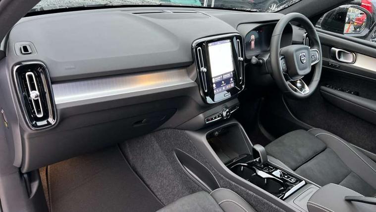 12.3" Progressive Driver Display, 9" centre console portrait touch screen, Adjustable steering wheel force, Android auto (Wired), Apple carplay (wired), Bluetooth handsfree system, Driver alert control, Driver assistance (pilot assist and adaptive cruise control), Driver awareness - Blind spot information system with steer assist, cross traffic alert with autobrake and rear collision warning and mitigation, E-call, Front and rear parking sensors, Front park assist, Google automotive services - Enabled entertainment apps, navigation with google maps, voice recognition with google assistant, Hands free power tailgate, Intelligent speed assistance, Lane keeping aid, Oncoming Lane Mitigation, Speed sensitive steering, Volvo cars services with app - Driving journal, emergency and breakdown call, engine remote start, remote door locking/unlocking and vehicle dashboard, Wireless/Inductive Mobile Phone Charging, Automatic transmission with start/stop and manual change functions, Dynamic chassis, DAB Digital radio, Steering wheel mounted remote controls, Adaptive brake lights with high level LED brake lights, Auto dimming feature for exterior door mirrors, Auto dimming interior mirror, Auto folding and heated power door mirrors, Automatic headlamp levelling, Automatic LED Headlights + Active high beam incorporating daytime running lights, Dark tinted windows - rear side windows and rear screen, Front aluminium tread plates, Front and rear electric windows, High gloss black front and rear skid plate, High gloss black front bumper deco, High gloss black front grille strikethrough and ironmark, High gloss black rear model, engine and volvo logo badges, High gloss black window trim, Home safe and approach lighting, Integrated roof rails in high gloss black, LED front fog lights, Puddle lights, Rain sensor with automatic windscreen wiper activation, Rear side wing doors, Rear wiper, Roof antenna, Roof spoiler, Visible VIN plate, 12V socket in front tunnel console and luggage compartment, 2-Zone electronic climate control with CleanZone air quality system and pollen filter, 3 seat bench in 2nd row, 3 Spoke tailored steering wheel with chrome trim, 60/40 versatile split folding rear seat, Centre console cupholders and storage, Charcoal carpet and floor mats, Charcoal headlining, Connect suede textile/microtech upholstery, Flexible load floor and grocery bag holder, Front headrests, Front seat cushion extensions, Glovebox bag hook, Heated front seats, Height adjustable passenger seat, Height/reach adjustable steering column, High gloss centre tunnel deco, High level illumination - Front door pocket, front side step (under door), tailgate, instrument panel, front door inlay, rear courtesy&reading lights, Integrated waste bin, Isofix attachments on outer rear seats, Load cover, Load protection net, Mid level illumination - Front footwell, luggage & glovebox compartment, front cabin courtesy & reading lights, illuminated vanity mirrors+ticket holder, Multi directional lumbar support for driver and passenger seat, Power driver seat with memory + exterior mirrors memory, Rear armrest with cupholders, Rear headrests, Single front passenger seat, Underfloor luggage compartment storage, Climate pack without heated front seats - XC40, 3x3 point rear seatbelts, City safety with steering support with Pedestrian + cyclist + front collision warning with full auto brake and rear auto brake, Driver and passenger airbags, Drivers knee airbag, Electronic parking brake with auto hold, First aid kit, Front and outer rear seatbelt reminder and pretensioners, Front seats SIPS airbags, Hill descent control - Off-road drive mode, Hill start assist, IC (Inflatable Curtains) - Full Length, Passenger airbag cut-off device, Power child locks on rear doors, Road sign information display, Run off Road Protection, SIPS (Side Impact Protection System), Slippery road and hazard light alert, Stability and Traction Control with Spin control, Engine Drag Control and Corner Traction Control, Tyre pressure monitoring system, Vehicle deceleration control with Anti-lock Brake System, Electronic Brake Distribution and Emergency Brake Assist, Warning triangle, WHIPS whiplash protection system - front, 2 x Key integrated remote control central locking including with deadlocking system and auto open/close windows, Anti-theft alarm including immobiliser/volume sensor + level sensor, Keyless drive includes keyless entry and keyless start, Locking wheel nuts, 20" 5 spoke high gloss black alloy wheels,