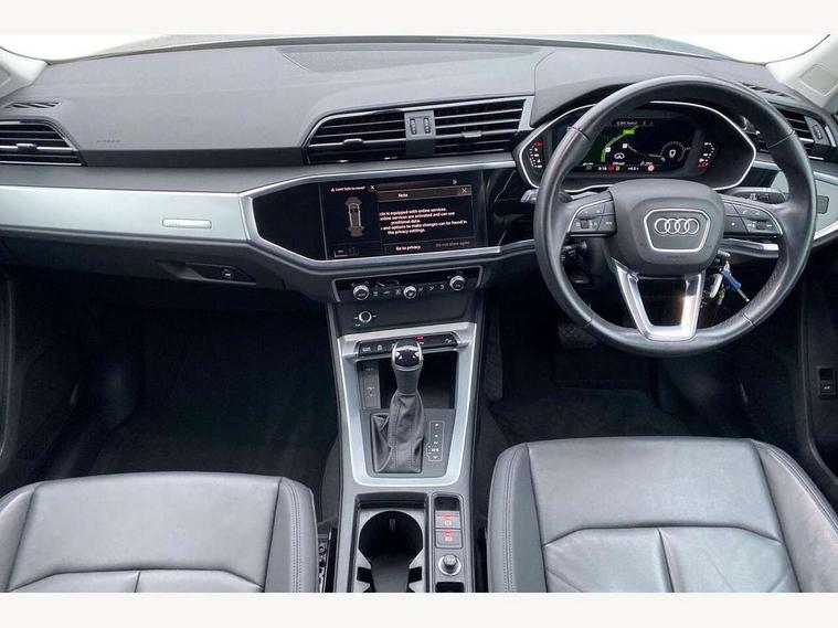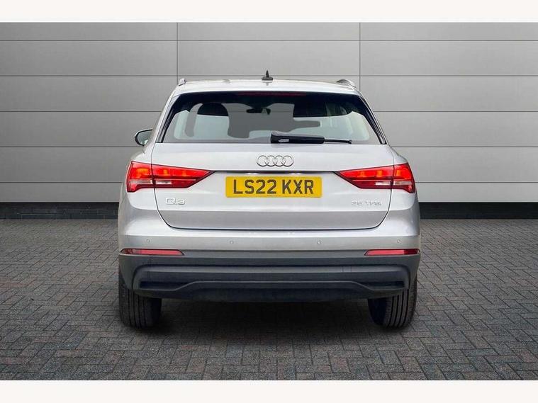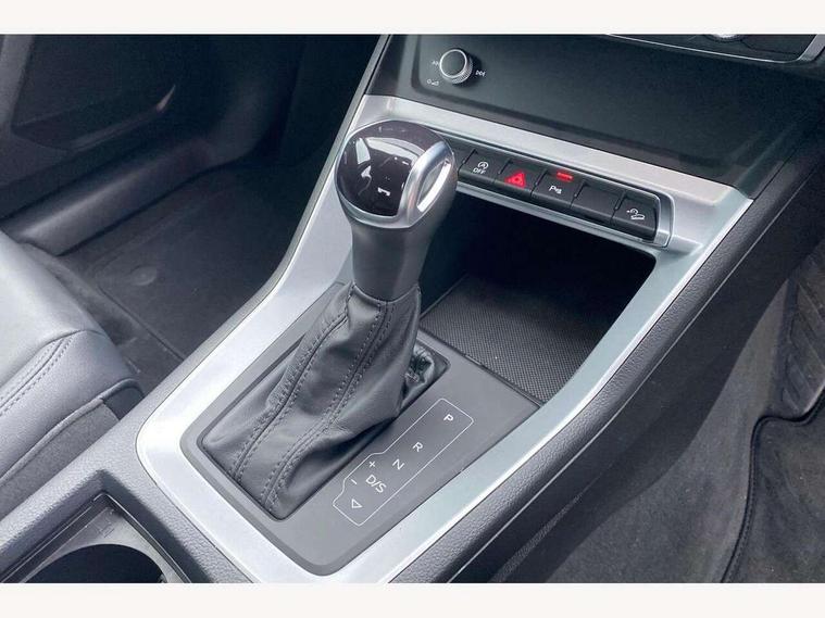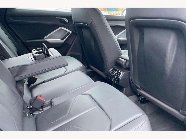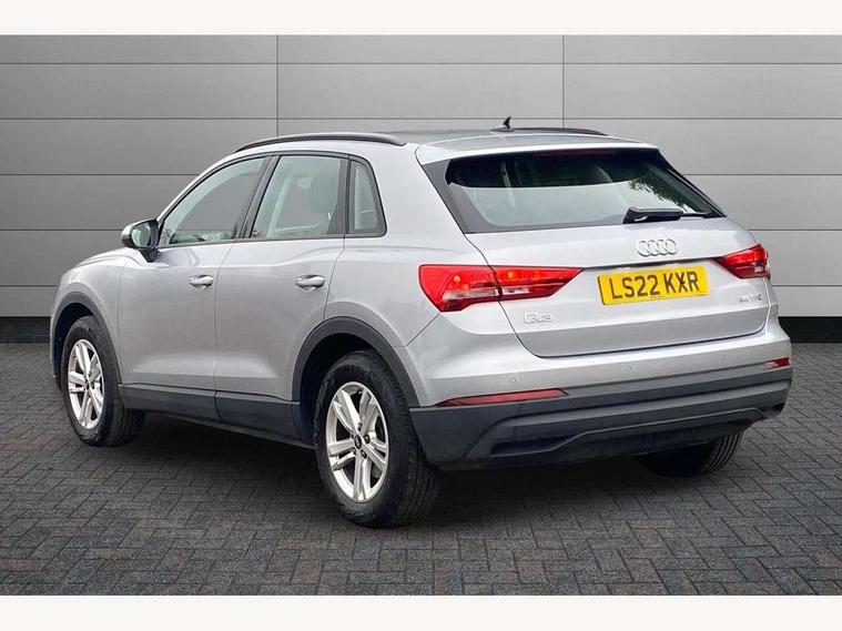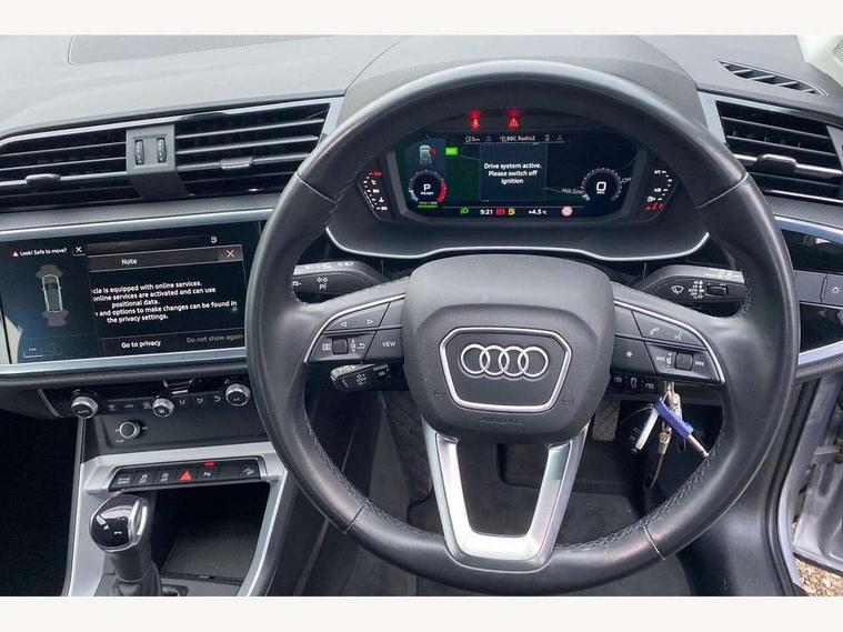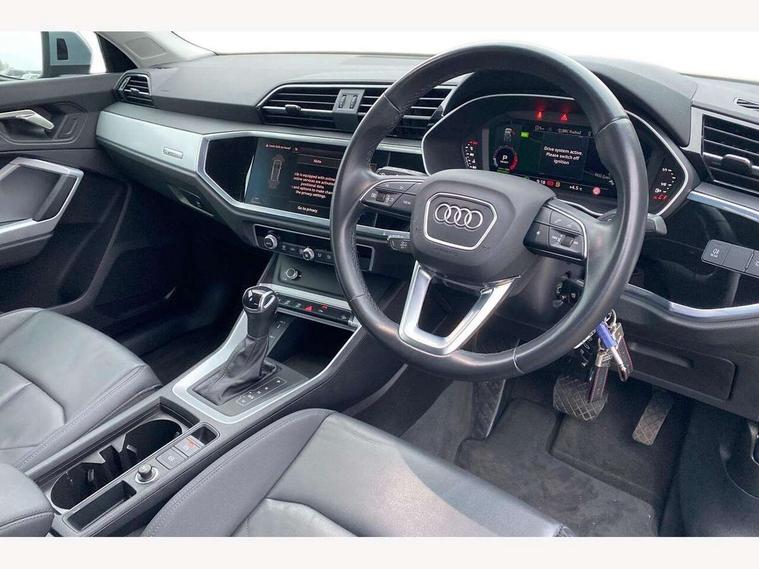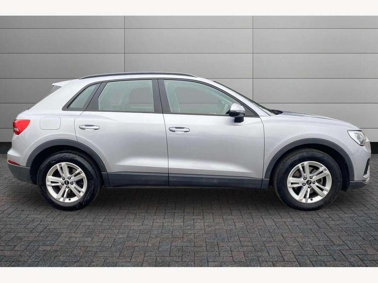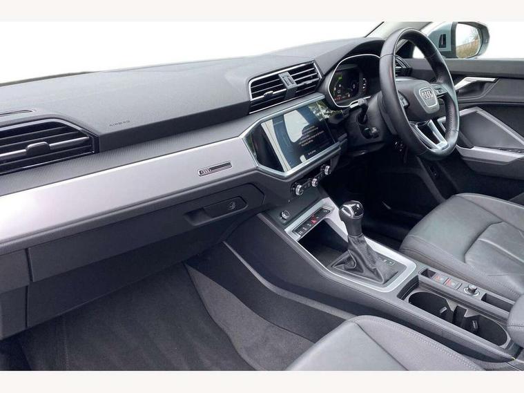 Amazon alexa Integration, Audi connect safety and service (e-call), Audi drive select, Audi lane departure warning, Audi Virtual Cockpit - 10.25" display, Bluetooth interface, Camera based traffic sign recognition, MMI Navigation Plus with high resolution 10.1 inch touchscreen colour display, Power operated tailgate, Progressive steering, Service interval indicator, Smartphone interface includes wireless Apple carplay/Android Auto, Start stop system with recuperation, Voice control system with natural language interaction, 48V Mild hybrid technology, Standard suspension, 2 USB-C ports with charge and data functions, 6 passive loudspeakers, DAB digital radio module, Acoustic windscreen, Auto dimming frameless rear view mirror, Black roof rails, Body colour door mirrors, Diffuser in grained anthracite, Electrically folding, adjustable and heated door mirrors with integrated LED side indicators and kerb view function for passenger side, Exterior bumper with wheel arch trims and side sill trims in grained black matt, Front and rear electric windows, Grained radiator protective grille, Halogen rear lights, LED headlights with LED daytime running lights, Rain and light sensors, Rear side wing doors, Rear wiper, Third brake light, Variable front intermittent wipers, 12V socket in rear centre console, 3 seat bench in 2nd row, 3 spoke multi-function leather steering wheel, 40:20:40 folding with manual adjustment for 60:40 forwards/backwards position and backrest angle, Dual zone electronic climate control, Front and rear floor mats, Front and rear headrests, Front and rear roof module including reading lights, Front centre armrest, Glove compartment lighting, Height and reach adjustable steering wheel, ISOFIX child seat mounting for front passenger with airbag deactivation and outer rear seat including top tether attachment point for outer rear seats, Luggage compartment light, Lunar silver cloth headlining, Manual front seats with height adjustment, Single front passenger seat, Stainless steel luggage compartment sill finisher, Non smoking pack - Q3, 3x3 point rear seatbelts, 6 airbags - Driver, front passenger, curtain and side windows, Audi pre-sense front with pedestrain and cyclist recognition, Electromechanical parking brake, Electronic stabilisation control including ABS, ASR and EDL, Front seatbelt reminder, Hill descent control, Hill hold assist, Manual child lock in rear doors, Pre sense basic, Seatbelt monitoring, Tyre pressure warning, Warning triangle and first aid kit, Anti theft alarm, Anti theft wheel bolts, Immobiliser, Remote central locking, Detail dashboard around MMI touch colour display in glass look, black with surround in aluminium look, Micrometallic silver inlay, 17" 5 twin spoke design alloy wheels, Tool kit, Tyre repair kit,