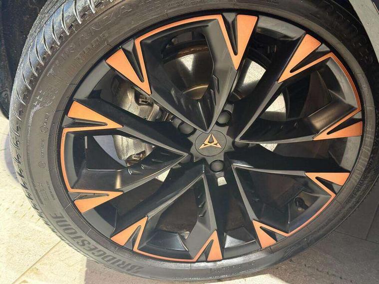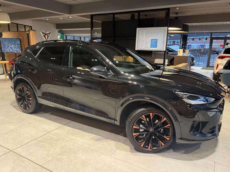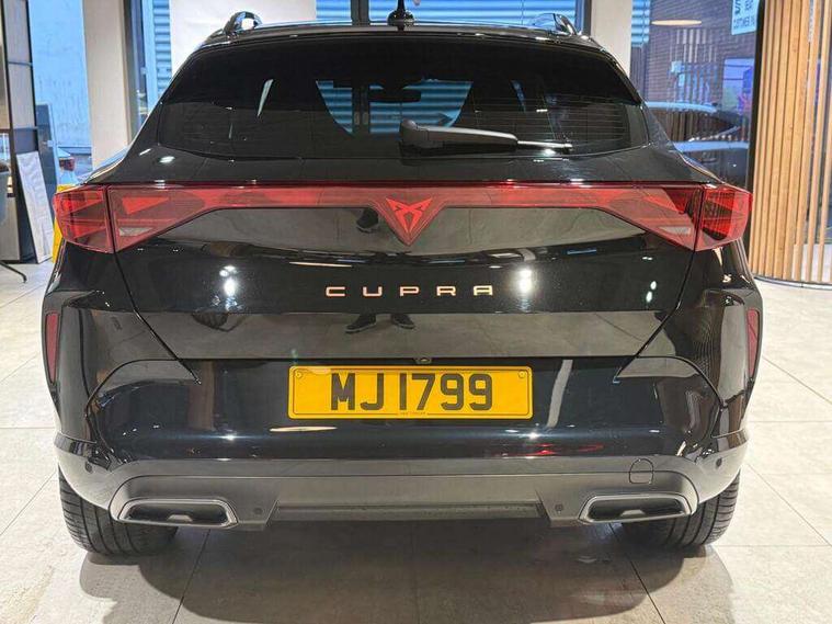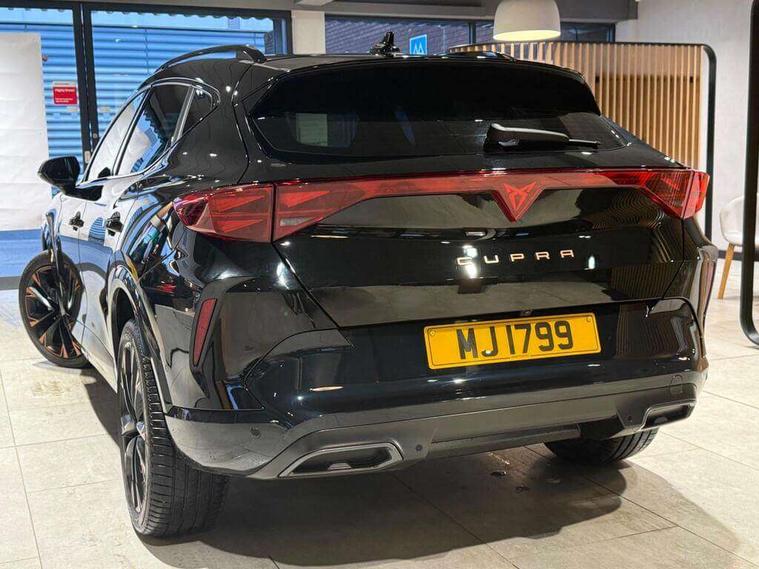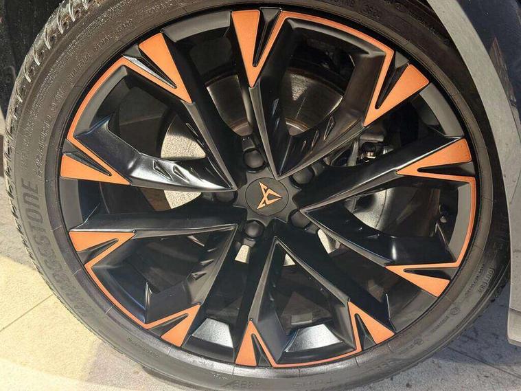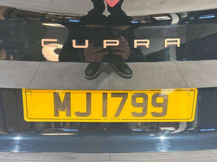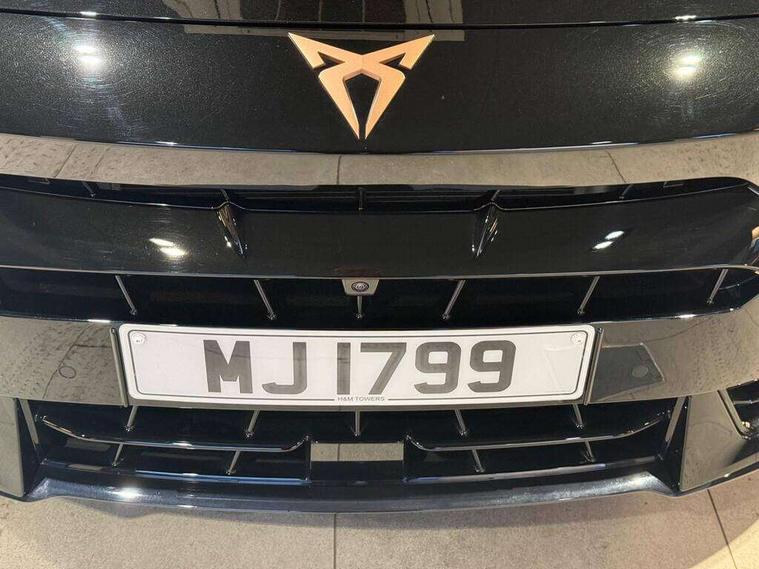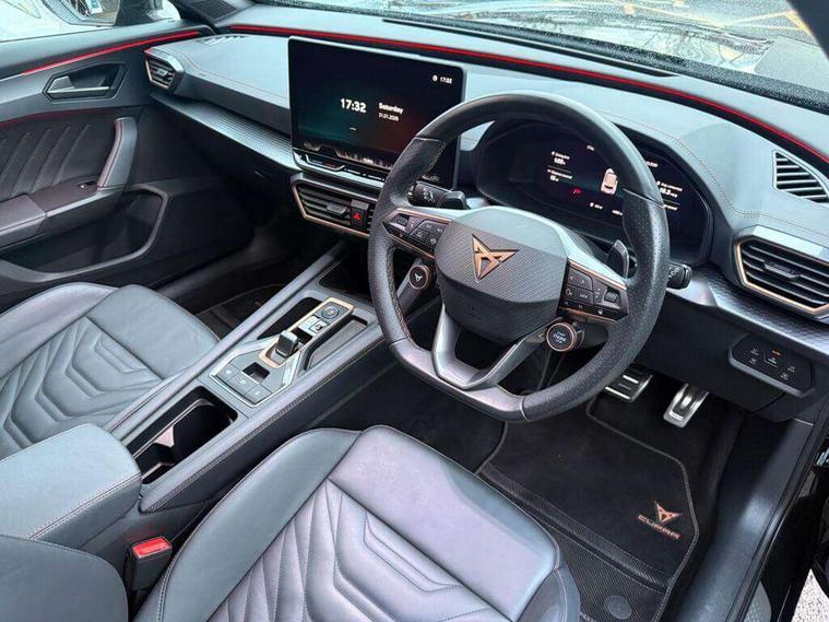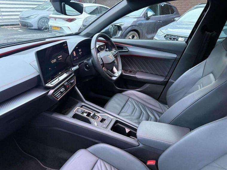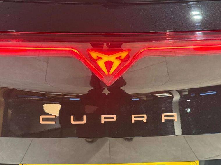 10.25" digital cockpit and configurable dashboard, Adaptive cruise control with follow-to-stop and speed limiter, Advanced driver alert system, Advanced lane assist with semi-automatic vehicle control in a medical emergency and traffic jam assist, Driving profile selection, Dynamic road sign display, Emergency steering support with turn assist, Forward collision warning with automatic braking, Full link phone integration, Intelligent park assist, Progressive steering, RPM, trip computer, outside temp gauge, instrument light brightness, low fuel warning light, lights on reminder, gearshift indicator, Service interval indicator, Side and exit assist, Start/stop system with regenerative braking, Top view camera, Virtual pedal and electric tailgate, Voice control system, Wired Android Auto, Wireless apple carplay, Wireless phone charger, CUPRA sport suspension, Electronic locking differential and dynamic traction support, 2 front and 2 rear USB type C sockets, Media system with navigation, 12.9" touchscreen display, voice control, DAB, steering wheel mounted controls, Auto dimming rear view mirror, Body colour door handles, Body coloured bumpers, Dark grey wing mirror, Daytime running light with automatic headlight control and coming home feature, Door panel ambient lighting, Dynamic headlight range control, Electric front/rear windows, Electrically adjustable heated and folding door mirrors with memory function, Gloss black roof rails and window surrounds, High beam assist, LED 3rd brake light, LED front fog lamps with cornering function, LED Headlights, LED Taillights with dynamic indicator, Rain sensing wipers, Rear diffuser with black simulated exhaust pipes, Rear fog lights, Rear side wing doors, Rear wash/wipe, Tinted rear windows, Welcome lights (within exterior mirror housing), 12V socket, 2 front and 2 rear reading lights, 3 seat bench in 2nd row, 60/40 split rear bench seat with armrest and mechanical seat release, Black headlining, Black interior roof lining, Cupra sports pedals, Dust/pollen filter, Electrically adjustable front seats with lumbar support and memory function, Front and rear head restraints, Front centre armrest, Heated front seats, Heated supersports multifunction leather steering wheel with satellite buttons and gear shift paddles, Height/reach adjust steering wheel, Illuminated aluminium doorsteps, Illuminated interior front door sills, Illuminated sunvisor with mirror, Isofix, Leather dashboard, door insert and side trim panel, LED smart wraparound lighting, PVC/Leather upholstery, Satellite steering wheel, Single front passenger seat, Storage pockets on rear of front seats, Three zone climate control with control panel in rear, Variable luggage/load compartment floor, 3 point seatbelts on all rear seats, ABS, Brake control system - ESC and brake booster, Child proof door locks, Driver and front passenger airbags with front passenger airbag de-activation, Electronic parking brake, Front and rear disc brakes, Front side curtain airbags, Hill hold control, Pre-crash front and rear seat belt tensioner, window closure and hazard lights, Public e-call, Seat belt reminder for front and rear seats, Tyre pressure monitoring system, Anti theft alarm system, KESSY Advanced - Keyless start, keyless entry with SAFELOCK, Locking wheel bolts, Copper and aluminium interior detailing,