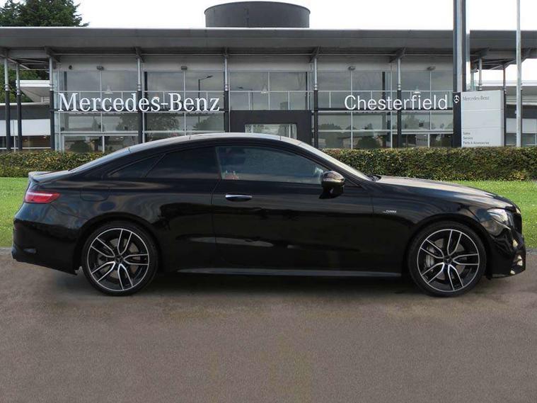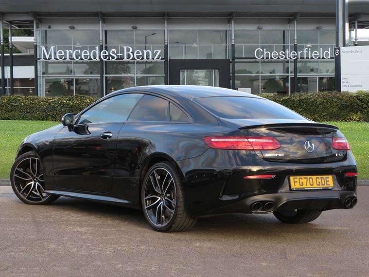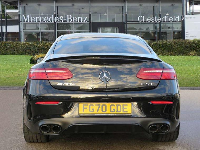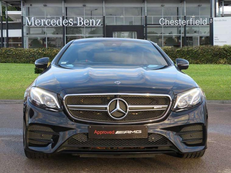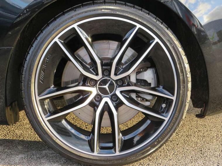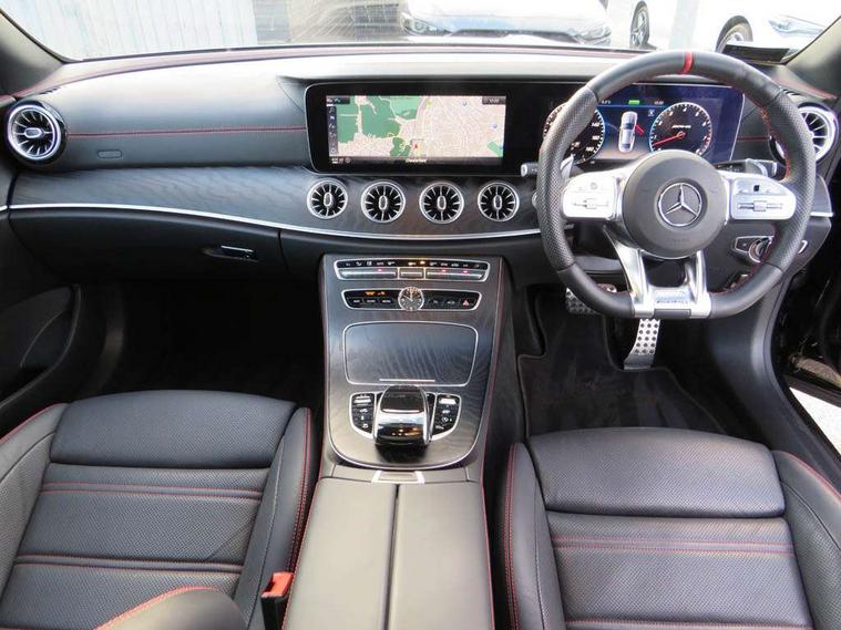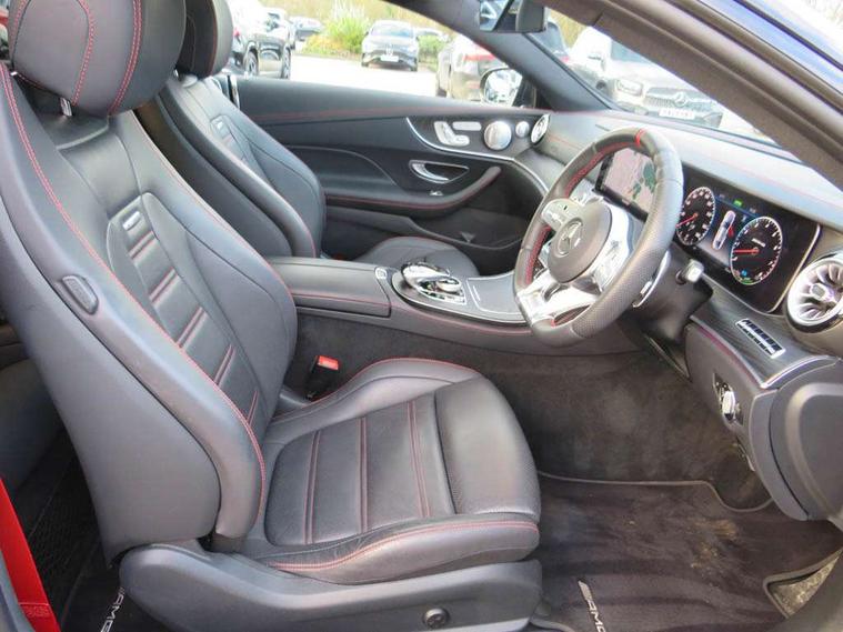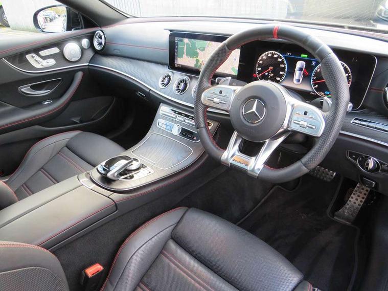 360 degree parking camera, Active parking assist including front and rear parking sensors, AMG DYNAMIC SELECT with a choice of driving modes (ECO, Comfort, sport, sport+ and Individual), Analogue clock, Attention assist, Blind spot assist, Brake wear warning display, Cockpit display 12.3" widescreen digital instrument cluster, Collision prevention assist plus, COMAND online HDD navigation with Radio/Media interface, linguatronic + smartphone integration/Apple CarPlay/Android Auto and 12.3" Cockpit display, Cruise control with variable speed limiter, Direct steering, ECO start/stop function, High resolution 12.3" multimedia colour display, Instrument cluster with AMG menu including RACETIMER and AMG start-up display, Mercedes connect me, Outside temperature display, Pre-installation for Vehicle Monitoring, Pre-installation for Vehicle Setup, Remote boot release, Service indicator (ASSYST), Status display for rear seat belts in instrument cluster, Touchpad with control wheel, Traffic sign assist, Trip computer in multifunction display showing current fuel consumption, Wireless charging, 66 litre fuel tank, AMG ride control+ sports suspension based on Air body control air suspension with Adaptive damping system, EQ Boost starter alternator, 2 USB ports in centre console, 2 USB ports in the rear, DAB Digital radio, Smartphone integration via Android Auto/Apple CarPlay, Media Interface, USB and Bluetooth interface and touchpad with control wheel, Adaptive brake lights, AMG bodystyling - front apron with distinctive air intakes and AMG rear apron with diffuser look, AMG boot lid spoiler in body colour, AMG performance exhaust system, Badging BITURBO 4MATIC+ lettering on front wings, Body colour door handles, Body coloured bumpers, Chrome pins diamond radiator grille with integrated stars, Electric windows with one touch opening/closing and obstruction sensors, Exterior mirrors heated and electronically adjustable, Illuminated front door sill panels with "AMG" lettering, Multibeam LED Intelligent Light System with Adaptive Highbeam Assist, Pre-installation for roof rail systems, Privacy glass Includes rear side windows and rear windscreen, Rear LED lights, Top surround of side windows in polished aluminium, Visible two twin pipe exhaust system integrated into the bumper, Waistline in polished aluminium, 3-spoke flat bottom steering wheel in silver chrome trim with "AMG" lettering, aluminium gearshift paddles, 12 o'clock mark and Touch Control buttons, 40:20:40 split folding rear seats, AMG sports seats, Artico man-made leather upper dashboard and beltlines with contrast stitching, Automatic child seat recognition sensor, Automatic two zone climate control, Belt feeder driver and front passenger seat belt automatically positioned within easier reach, Black roof lining, Central stowage compartment with USB socket for use with Android Auto and Apple CarPlay, Centre armrest and door handle illumination, Chrome door pins, Floor mats with black leather edging red piping and AMG logo, Front and rear door pockets, Front centre armrest with stowage compartment, Front footwell lights, Glasses compartment in overhead control panel, Glove compartment - lockable, air conditioned and illuminated, Head restraints for driver and front passenger (four-way adjustability) and in rear (two-way), Heated front seats, Interior lighting - 64 colour Ambient lighting, Interior rear light/integral reading lights, Isofix rear child seat fastenings, Nappa leather upholstery, Seat occupancy sensor for front passenger seat, Sports pedals in brushed stainless steel with black rubber studs, Start up display with AMG logo, Steering column electrically adjustable for height and reach, Steering wheel touch control buttons for audio and onboard settings, Sunvisors with illuminated vanity mirrors, Memory pack - E Class, Mirror pack - E Class, Seat comfort pack - E Class, Stowage pack - E Class, 2 x 3-point rear seatbelts, Active bonnet pedestrian safety measure which detects an impact and raises bonnet, Active brake assist, Adaptive brake system with HOLD function and brake drying in the wet, Adaptive driver and front passenger airbags, Airbags - sidebag for driver and front passenger with combined thorax/pelvis bag, Anti-lock braking system (ABS), Drivers knee airbag, Electric parking brake, Electronic Stability Programme, Front and rear window airbags, Head airbags, Hill hold function, Perforated front brake discs and anodised silver brake calipers with "AMG" lettering, Pre-Safe anticipatory safety system, Red seat belts, Seatbelt warning, Tyre pressure monitoring system, Warning triangle and first aid kit, Alarm system/interior protection/immobiliser, Central locking with interior switch, automatic locking and crash sensor with emergency opening function, Chrome surround in electric key, Keyless entry go starting function, Black open pore ash wood, Open pore black ash wood centre console, 19" AMG 5 twin spoke alloy wheels in high gloss black with high sheen finish, TIREFIT with tyre inflation compressor,