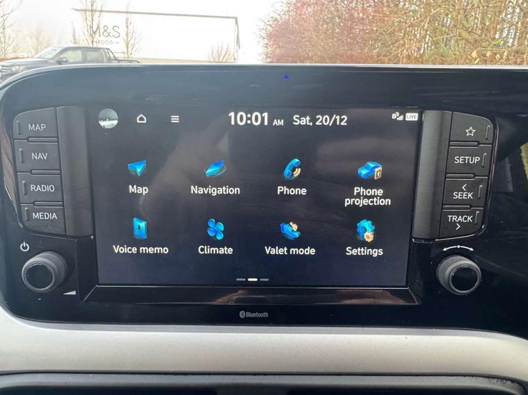 Apple car play/Android Auto, Bluelink mobile remote connectivity, Bluetooth connectivity with voice recognition, Cruise control, Driver attention alert system, eCall emergency call system, Forward Collision-Avoidance Assist (FCA) - Pedestrian/Cyclist, Front USB-C charging and USB-A data, Full-width 4.2" LCD instrument cluster, Intelligent speed limit assist, Lane departure warning system with lane keep assist - LKAS, Lane follow assist, PAS, Rear parking sensors, Rear view camera with guidelines, Roadside assistance, Start/Stop function, Tailgate, Trip computer, Wireless charging pad, 2 front/2 rear speakers, Rear USB-C device charger, Steering wheel audio, phone and cruise controls, 1 speed non intermittent rear windscreen wiper, Black finish on B pillars, Body colour door handles, Body coloured bumpers, Body coloured door mirrors, Electric folding door mirrors, Electric front windows, Electric rear windows, Electrically adjustable and heated door mirrors, Flat metal emblem, Front fog lights, Front grille in glossy black, Front intermittent wipers, Halogen bi-function headlights, Headlights inner with Black Blade design, Heated rear window, High beam assist, Indicator light on door mirrors, LED DRLs diamond mesh design, Privacy glass - Rear windows and tailgate, Rear roof spoiler with integrated LED brake light, Rear side wing doors, 12v power outlet - front, 3 seat bench in 2nd row, 60/40 split folding flat to floor rear seats, Air conditioning, Auto light control, Bottle holders in front/rear doors + front centre console, Cabin and luggage compartment interior lighting, Cloth upholstery, Driver + passenger vanity mirrors, Driver's seat height adjustment, Driver/passenger sunvisors with ticket holders, Floor mats, Front door pockets, Front Head Restraints - Vertical and Horizontal Adjustment, Front LED blue mood lighting, Glove compartment, Heated front seats, Heated steering wheel, Height adjustable steering column, Isofix child seat preparation, Leather multifunction steering wheel, Rear door pockets, Single front passenger seat, Vertical adjustment rear head restraints, 3x3 point rear seatbelts, Airbags - front, front side and curtain airbags, Anti-lock brake system (ABS), Autonomous emergency braking (AEB) with forward collision warning system, Brake assist function, Childproof rear door locks, Electronic stability control, Front and rear seatbelt reminder, Front seatbelt pretensioners, Hill start assist control (HAC), Passenger airbag deactivate switch, Traction control, Tyre pressure monitoring system, Immobiliser, Perimeter alarm, Rear occupant alert, Remote central locking, Second remote key, Smart key with motion sensor, Speed sensitive auto door locking, 16" alloy wheels, Tyre repair kit,