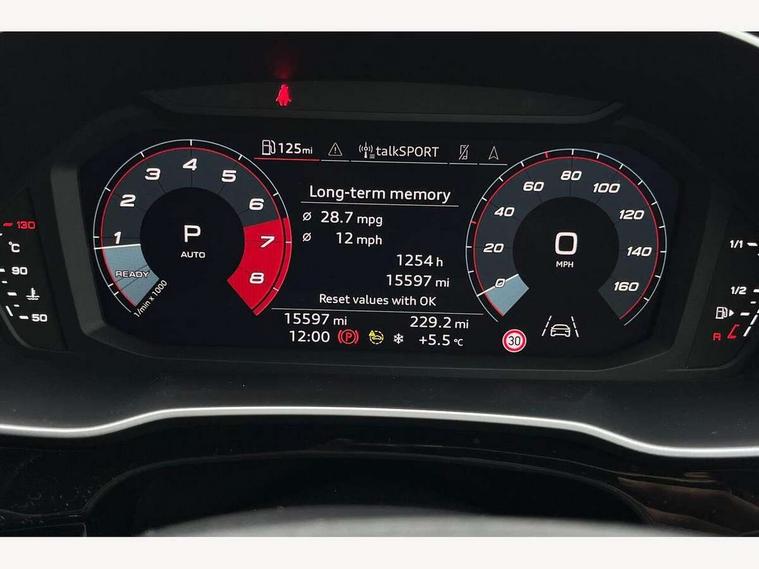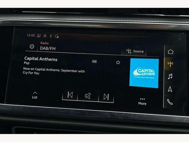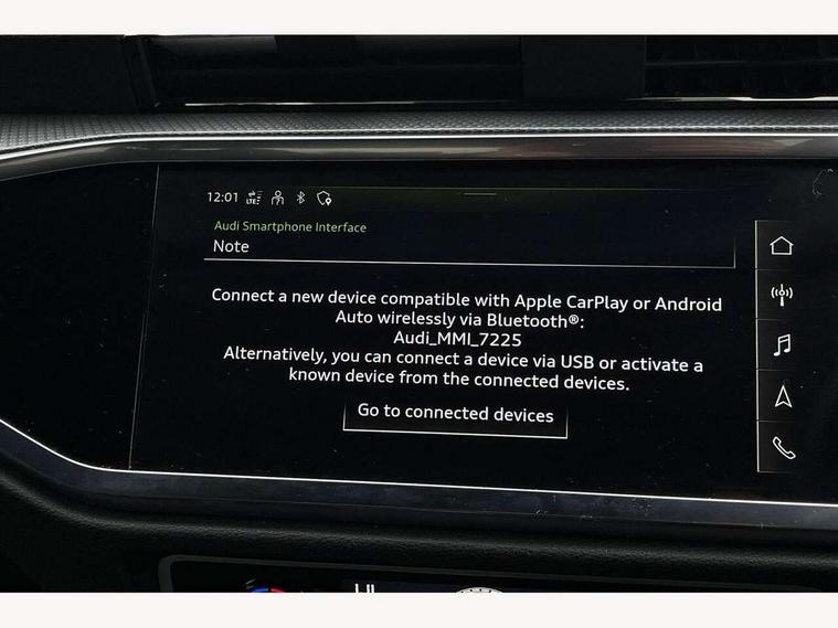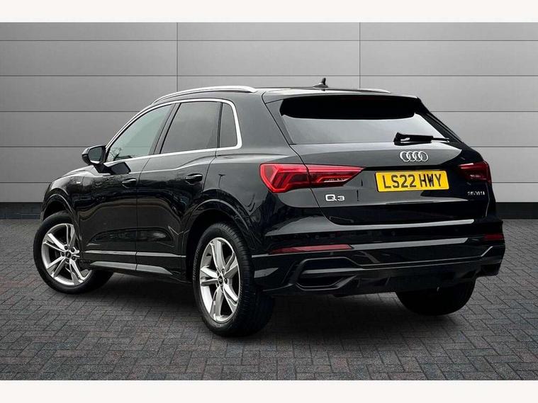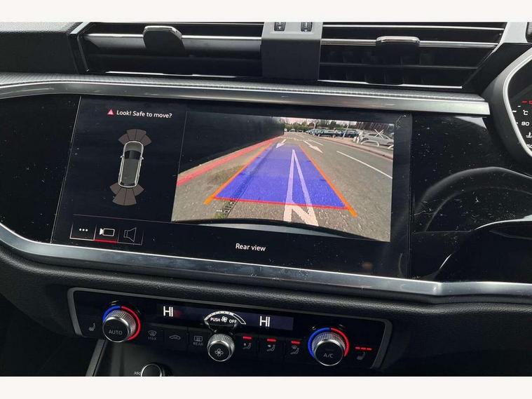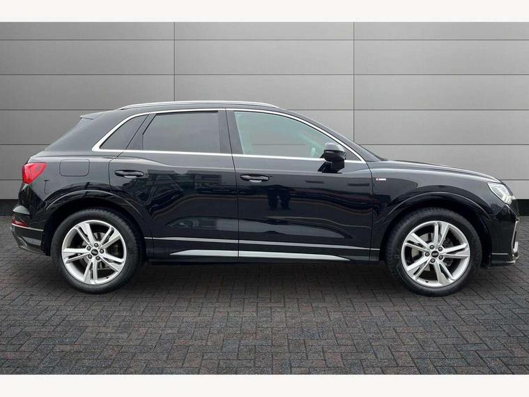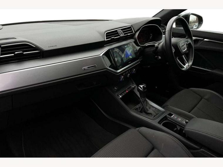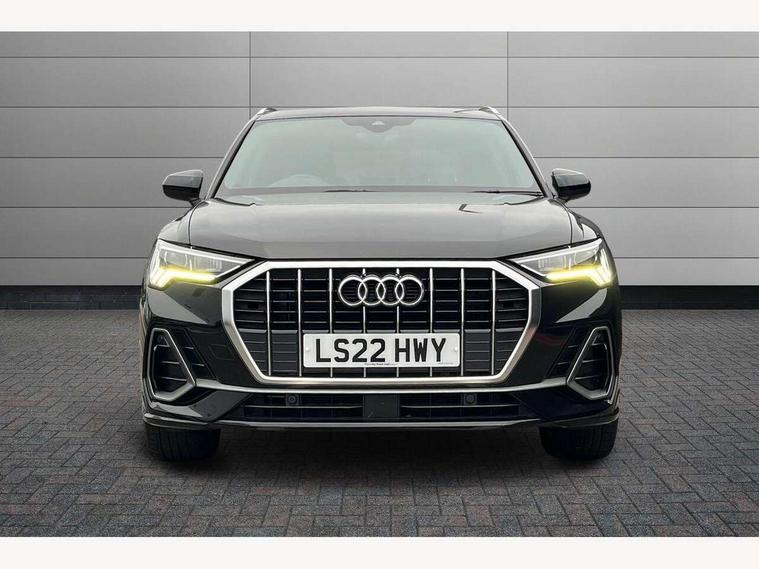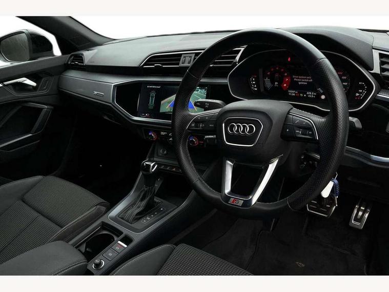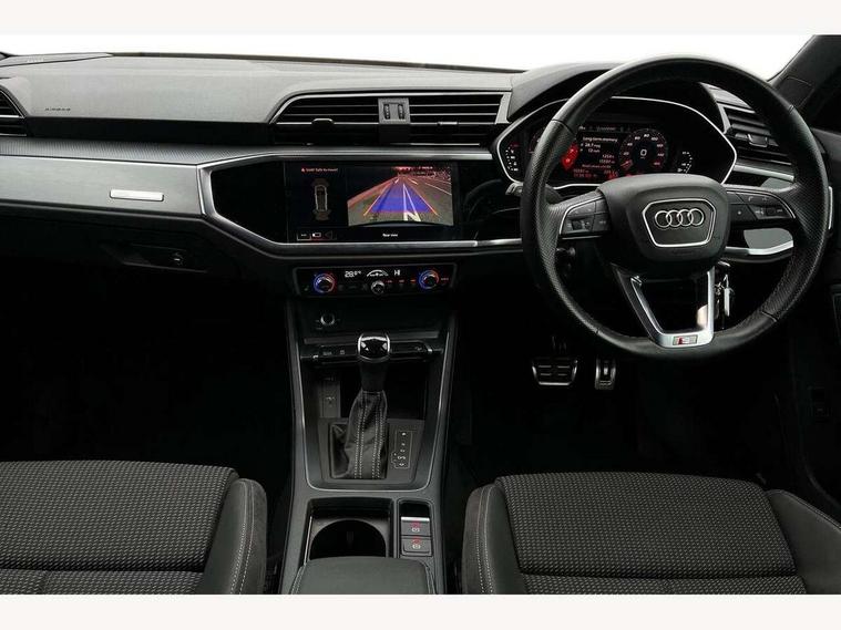 Amazon alexa Integration, Audi connect safety and service (e-call), Audi drive select, Audi lane departure warning, Audi Virtual Cockpit - 10.25" display, Bluetooth interface, Camera based traffic sign recognition, MMI Navigation Plus with high resolution 10.1 inch touchscreen colour display, Power operated tailgate, Progressive steering, Service interval indicator, Smartphone interface includes wireless Apple carplay/Android Auto, Start stop system with recuperation, Voice control system with natural language interaction, 48V Mild hybrid technology, Sports suspension, 2 USB-C ports with charge and data functions, 6 passive loudspeakers, DAB digital radio module, Acoustic windscreen, Aluminium roof rails, Aluminium window trim, Auto dimming frameless rear view mirror, Body coloured bumpers, Electrically folding, adjustable and heated door mirrors with integrated LED side indicators and kerb view function for passenger side, Front and rear electric windows, Front fog lights, Front side air inlets in matt platinum grey, Front spoiler blade in matt platinum grey, Grille vertical bars in aluminium silver/Matt, High gloss black finish B and C pillars, LED headlights with LED daytime running lights, LED rear lights, LED third brake light, Privacy glass dark tinted rear and rear-side windows (from B-pillar backwards), Rain and light sensors, Rear diffuser strip in matt titanium black, Rear side wing doors, Rear wiper, S line badges on front wings, S Line front and rear bumpers, Side skirt insert in matt Platinium grey, Silver chrome grille surround, Titanium black radiator grille, Variable front intermittent wipers, 12V socket in rear centre console, 3 seat bench in 2nd row, 40:20:40 folding with manual adjustment for 60:40 forwards/backwards position and backrest angle, Adjustable rear seat bench/backrest with centre armrest and cupholder, Black cloth headlining, Dual zone electronic climate control, Front and rear black floor mats with contrast stitching in rock grey, Front and rear headrests, Front and rear roof module including reading lights, Front centre armrest, Glove compartment lighting, Height and reach adjustable steering wheel, Illuminated door sill trims with S logo, ISOFIX child seat mounting for front passenger with airbag deactivation and outer rear seat including top tether attachment point for outer rear seats, Luggage compartment light, Manual front seats with height adjustment, Perforated leather gearknob, Single front passenger seat, Stainless steel luggage compartment sill finisher, Stainless steel pedals, Non smoking pack - Q3, 3x3 point rear seatbelts, 6 airbags - Driver, front passenger, curtain and side windows, Audi pre-sense front with pedestrain and cyclist recognition, Electromechanical parking brake, Electronic stabilisation control including ABS, ASR and EDL, Front seatbelt reminder, Hill descent control, Hill hold assist, Manual child lock in rear doors, Pre sense basic, Seatbelt monitoring, Tyre pressure warning, Warning triangle and first aid kit, Anti theft alarm, Anti theft wheel bolts, Immobiliser, Remote central locking, Dark matt brushed aluminium inlay, Detail dashboard around MMI touch colour display in glass look, black with surround in aluminium look, Leatherette door armrest, Tool kit, Tyre repair kit,