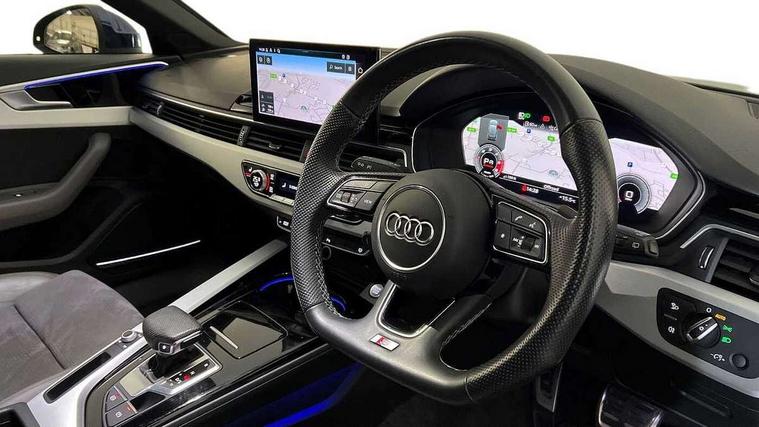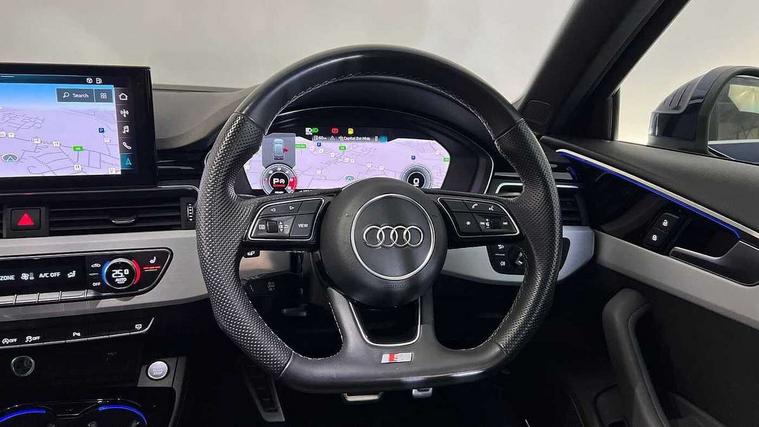 Audi connect safety and service (e-call), Audi connect with Amazon Alexa Integration, Audi drive select, Audi parking system plus with front and rear sensors, Audi smartphone interface, Audi virtual cockpit, Automatic start-stop system with coasting functionality and efficiency programme, Bluetooth interface, Electromechanical power steering, Email, calendar and text messages displayed via MMI, MMI Navigation plus with MMI touch includes 10.1" high resolution colour MMI display, 3D map, Power operated tailgate, Rear view camera, Voice control system, Sports suspension lowered by 23mm, 2 USB charging ports, 8 passive loudspeakers, DAB digital radio reception, Aluminium roof rails, Auto dimming rear view mirror, Body colour door handles, Body colour front spoiler lip, Body colour side sill trim, Body coloured door mirrors, Electrically folding auto dimming/adjustable/heated door mirrors with LED side indicators and kerb view function for passenger side, Grained matt black side air inlets with matt aluminium silver inlay, High beam assistant, Honeycomb structure radiator grille in grained matt black, LED headlights with LED rear lights + dynamic rear indicators + headlight adjustment and high beam, turning light + LED daytime running lights, Matt aluminium silver tailpipe trim, Privacy glass, Rain and light sensors, S Line badges on the front wings, S line front and rear bumpers with side skirts, S Line rear diffuser in matt titanium black with trim strip in matt aluminium silver, S Line roof edge spoiler, Windscreen with acoustic glazing, 4 way electric lumbar support for driver and front passenger, 40/20/40 split folding 3 rear seat bench in 3 parts with rear centre armrest, Black cloth headlining, Black perforated leather gearknob, Contrast stitching on seats, steering wheel and gear lever gaiter, Deluxe 3 zone electronic climate control, Door sill trims with aluminium inlay, Electric load area cover, Front and rear head restraints, Front centre armrest, Heated front seats, Illuminated door sill trims with S logo, ISOFIX child seat mounting and top tether, Manual seat adjustment, Stainless steel pedals and foot rest, High gloss package - A4, LED Interior light pack - A4/S4, 3 rear seatbelts, 6 airbags - Driver, front passenger, curtain and side windows, Electronic Stabilisation Control (ESC) including ABS, ASR and EDL, Hill hold assist, Multi collision brake assist, Pop-up bonnet for pedestrian protection, Pre sense city, Seatbelt monitoring, Warning triangle and first aid kit, Anti theft alarm, Anti theft wheel bolts, Keyless Go, Matt brushed aluminium inlays, Tool kit, Tyre repair kit,