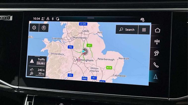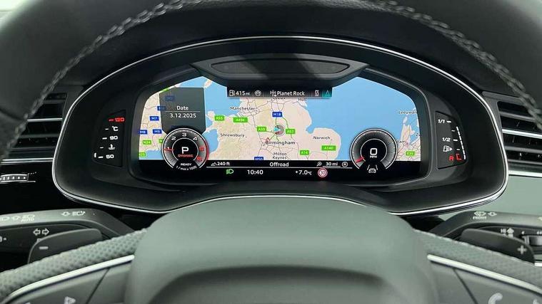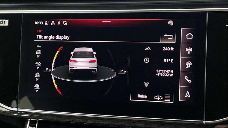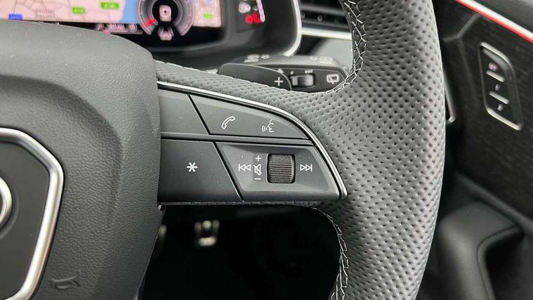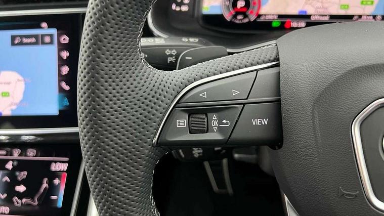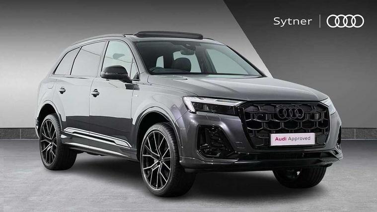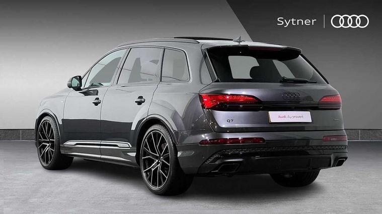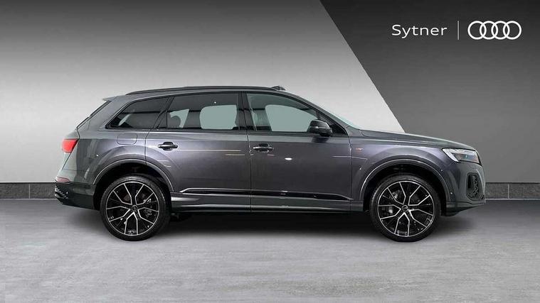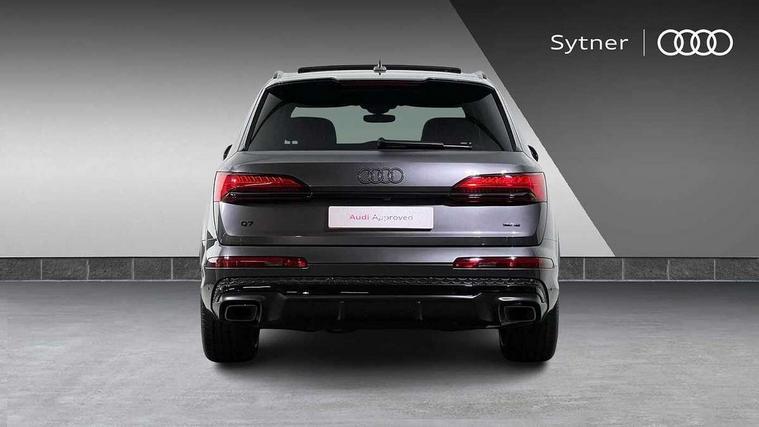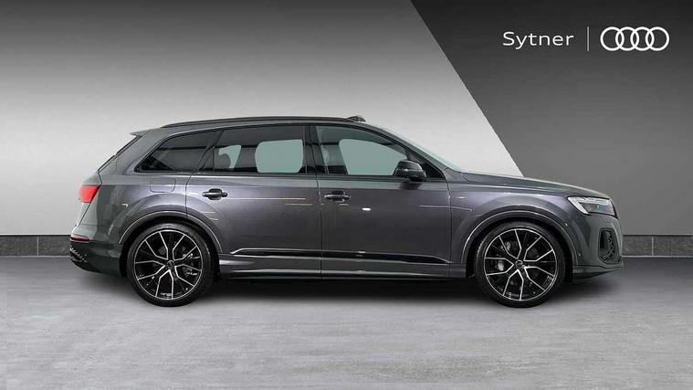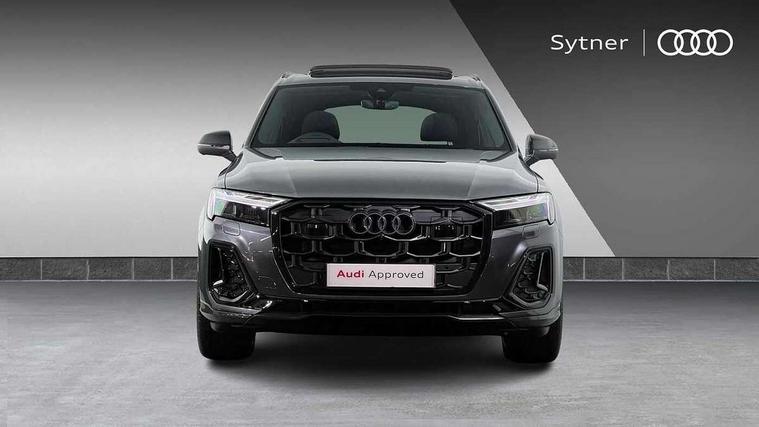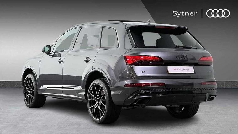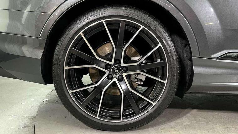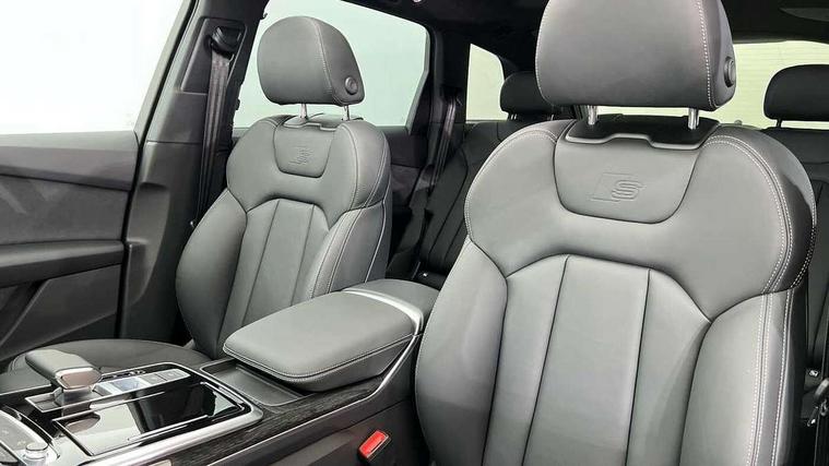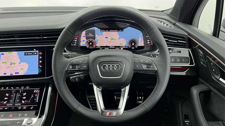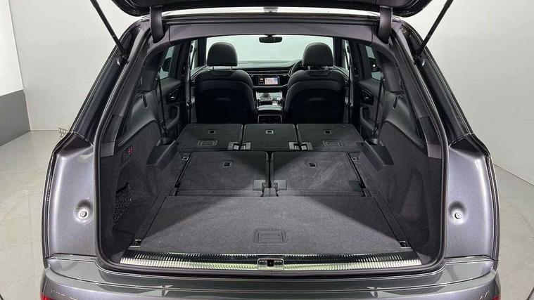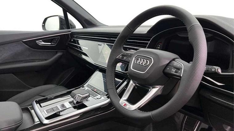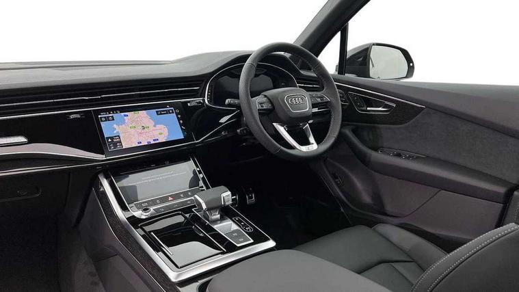 Audi connect safety and service (e-call), Audi connect with Amazon Alexa Integration, Audi drive select (Auto, Comfort, Dynamic, Efficiency, Individual, Off-road and All road), Audi phone box light with wireless charging, Audi virtual cockpit - 12.3" high-resolution LCD display with fully customisable instrument cluster, Bluetooth interface, Camera based traffic sign recognition, Electromechanical power steering, MMI navigation plus with MMI touch screens includes 10.1" and 8.6" screens with haptic feedback, Natural voice recognition, Operating buttons in Matte black, Parking system plus with 360 degree display (front, rear and side sensors) - acoustic and visual park assist system, Power operated tailgate, Rear view camera, Smartphone interface includes wireless Apple carplay/Android Auto, Start/stop system, 48V Mild hybrid technology, Adaptive air sports suspension, Quattro all wheel drive with self locking centre differential, Audi music interface - front 2 USB-C ports with charger and data functions, Audi sound system with 6 channel amplifier, 180 watt amplifying capacity and 10 loudspeakers including subwoofer, DAB digital radio module, Aluminium window trim, Audi Beam uses LEDs to project S emblem with red rhombus onto the ground when opening the side doors (front/rear), Auto dimming frameless rear view mirror, Black exhausts, Black roof rails, Electrically adj heated/folding + automatically dimming exterior mirrors with memory + automatic kerb side function for passenger side exterior mirror, Heat insulating glass in windshield, Integrated LED indications in door mirrors, LED 3rd brake light, LED daytime running lights, LED rear tail lights, Loading edge protection in stainless steel, Matrix LED headlights with dynamic front and rear indicators, Privacy glass - dark tinted rear and rear side windows from B-pillar backwards, Rear side wing doors, Rear wiper, 2 seat bench in 3rd row, 2 zone automatic climate control, 3 seat bench in 2nd row, 7 seat layout with ISOFIX points for the front passenger seat and rear passenger seat, Black carpets, Black cloth headlining, Comfort front centre armrest, Electric adjustable front seat with 4 way lumbar support, driver memory functionality, Folding rear seats, Front head restraints, Front/rear floor mats, Heated front seats, Illuminated door sill trims with S logo, ISOFIX child seat mounting for front passenger seat and 2 outer rear seats with top tether child seat mounting for all 3 rear seats, LED interior ambient lighting, Luggage compartment cover, Luggage compartment sill protection in stainless steel, Rear head restraints, Rear seat bench plus for the second row, with forwards/backwards sliding adjustment and backrest angle adjustment, Single front passenger seat, Stainless steel pedals, Sunvisors with illuminated vanity mirrors, Black styling pack plus - Q7, 3 point seatbelts on all rear seats, Audi pre sense basic, Audi pre sense front, Child locks on rear doors, Convenience key with safelock and gesture tailgate, Driver and front passenger, front side and curtain airbags, Electromechanical parking brake, Electronic Stabilisation Control (ESC) including ABS, ASR and EDL, Extended pedestrian protection measures, Hill hold assist, Seatbelt reminder, Tyre pressure loss indicator, Warning triangle and first aid kit, Anti theft alarm with tow away protection, Anti-theft wheel bolts and wheel loosening detection, Keyless Go, Remote central locking, Black dashboard, Polished oak trim with grey finish inlay, Tool kit, Tyre repair kit,