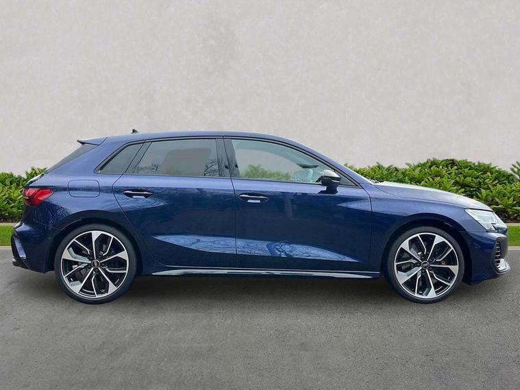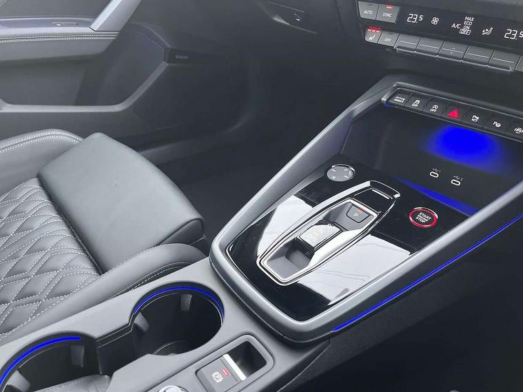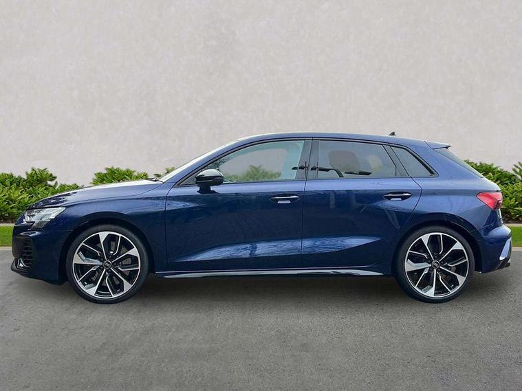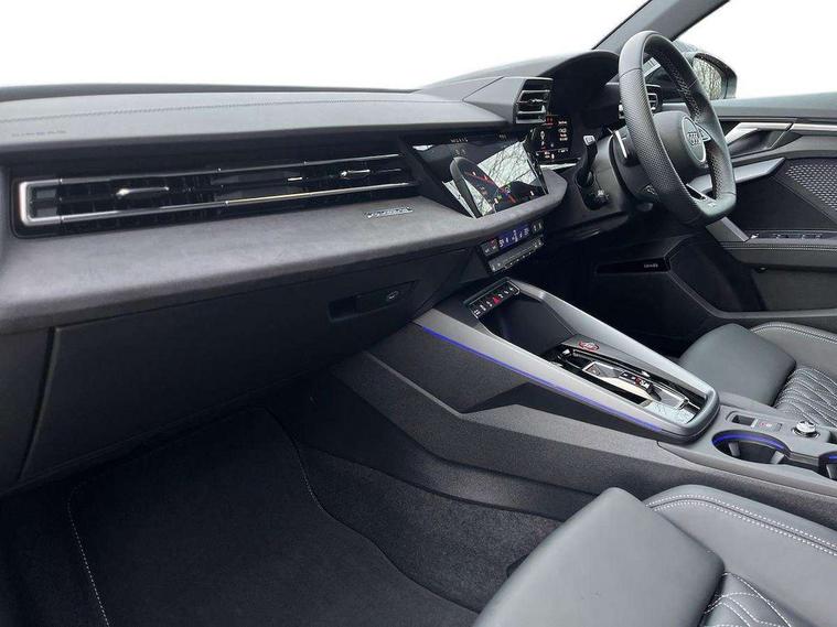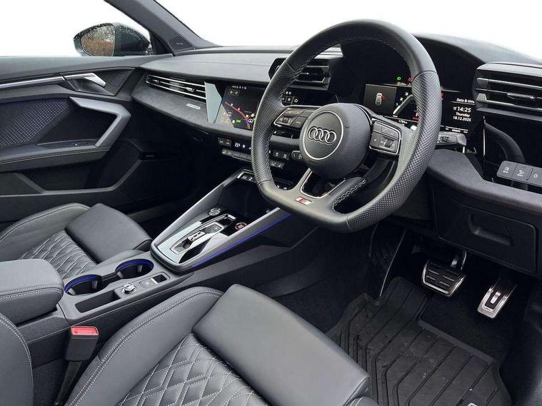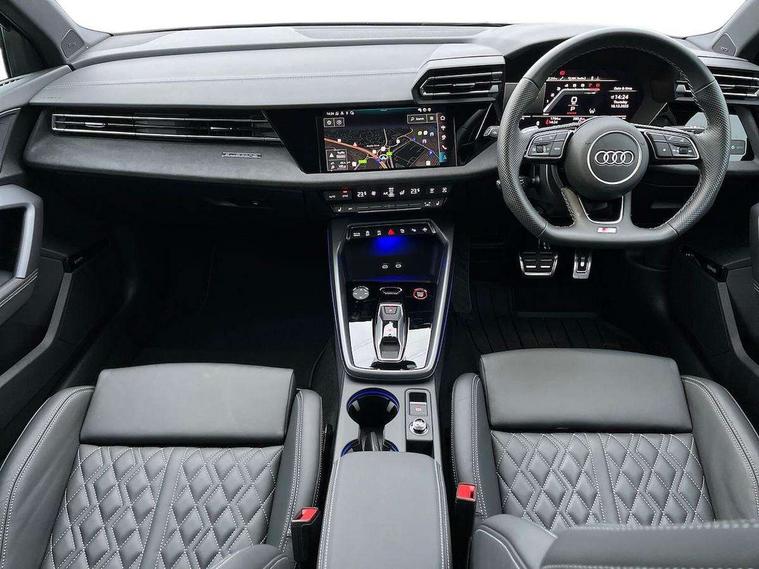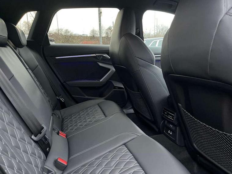 Adjustable speed limiter, Audi drive select, Audi smartphone interface with app store includes wireless Apple carplay, Android auto and Amazon alexa integration, Audi virtual cockpit plus - 12.3" full HD resolution dynamic digital instrument cluster, Automatic start/stop system with recuperation, Bluetooth interface, Camera based traffic sign recognition, Collision avoidance assistant, Distraction and Fatigue warning, e-Call (emergency call), Lane departure warning system, MMI Navigation Plus with high resolution 10.1" colour touch screen display, Park Assist with parking system Plus, Progressive steering, Service indicator, Tailgate, Trip computer, Voice control system with natural language interaction, Quattro permanent four wheel drive, S sport suspension with spring damper adjustment and lowering by 15mm, Audi Phonebox light with wireless charging, DAB Digital radio, USB ports with charging function in the rear, Anthracite grey Audi rings (front and rear), Audi Beam uses LEDs to project the rhombus S logo onto the ground as you exit your S3, Auto dimming frameless rear view mirror, Black accents front and rear bumpers including air inlets, Black accents in front grille and frame, Black accents window trims strips, Electrically adjustable/heated/folding/auto dimming door mirrors with integrated LED indications + kerb view function for passenger side, Exterior model badging, Front electric windows, Headlight washers, Heat insulating glass windscreen, Illuminated door sills with aluminium inserts at the front with S logo, LED 3rd brake light, LED daytime running lights, LED headlights with LED rear lights and dynamic rear indicators, Light and rain sensors, Privacy glass - dark tinted rear window, rear door and side windows, Rear electric windows, Rear side wing doors, Rear wiper, S grille, S3 front bumper with S specific air intake grilles, S3 roof spoiler, 12V socket and storage compartment in front centre console, 3 seat bench in 2nd row, 3 spoke flat bottomed leather multifunction sport steering wheel with gear shift paddles, 3-zone deluxe automatic air conditioning, 4 way electrically adjustable lumbar support for driver and front passenger, 40/20/40 split folding rear seat bench, Black cloth headlining, Fine Nappa leather upholstery with front sports seats S embossed logo, Front and rear centre armrest in artificial leather, Front and rear centre armrest in artificial leather with contrasting stitching on armrests and instrument panel, Front and rear headrests, Front/rear floor mats, Heated front seats, Height and reach adjustable steering wheel, Manual boot compartment lid, Manually adjustable front seats, Rear cup holders, S badging on the steering wheel, Seat side bolsters, Single front passenger seat, Stainless steel pedals and front footrest in black, Aluminium interior elements pack - A3 Sportback, Extended ambient lighting package Pro - S3 Black edition, Storage package - A3, Technology package - A3, 3x3 point rear seat belts, Driver and front passenger airbag with passenger airbag deactivation, Electronic Stabilisation Control (ESC) including ABS, ASR and EDL, First aid kit with warning triangle and 2 safety vests, Front side airbags with head airbags and interaction airbag, Hill hold assist, Pre-sense front with pedestrian and cyclist detection, Seatbelt monitoring, Tyre pressure loss indicator, Anti theft alarm, Anti-theft wheel bolts, Electronically operated child locks, Immobiliser, Remote central locking with safelock, Inlays in black dynamica microfibre, Tyre repair kit,