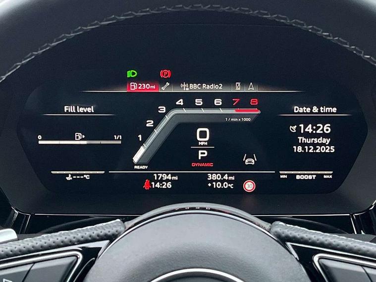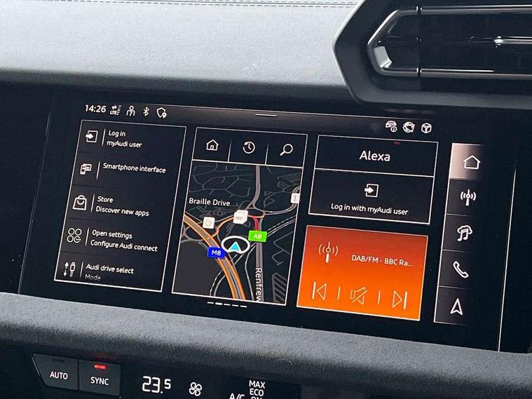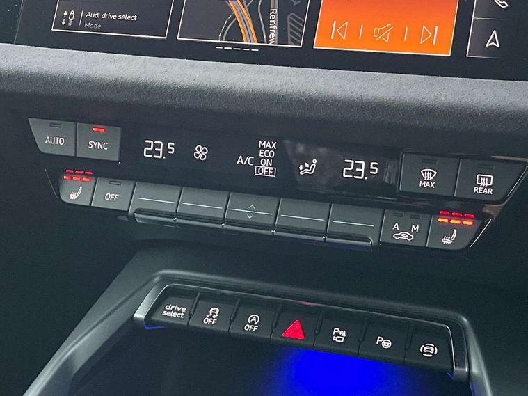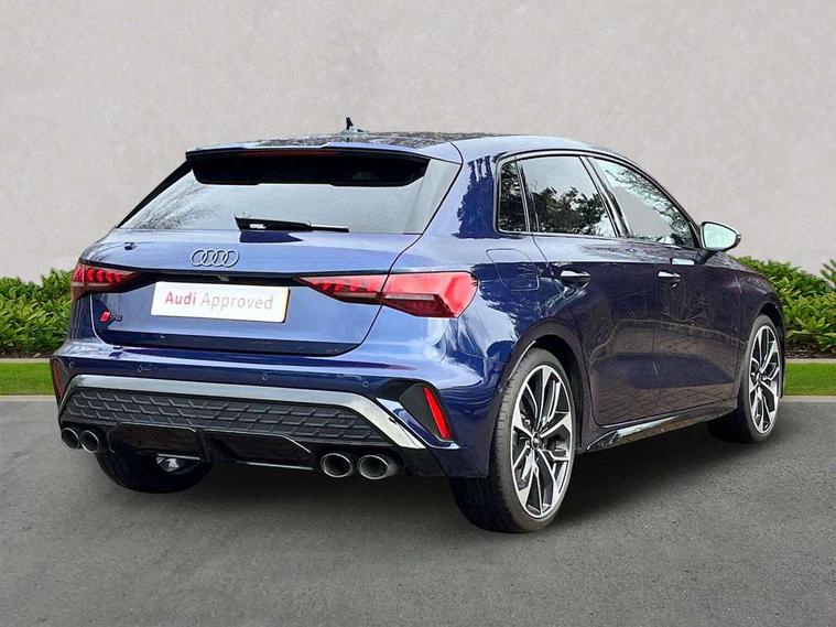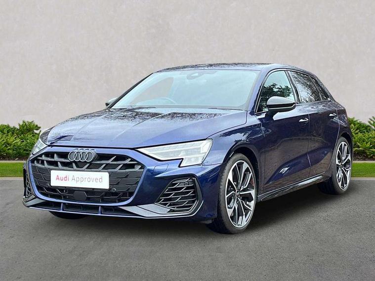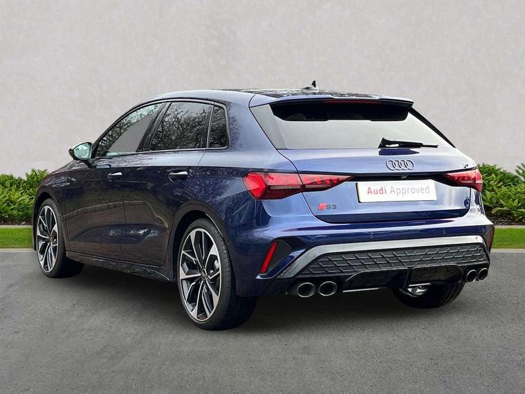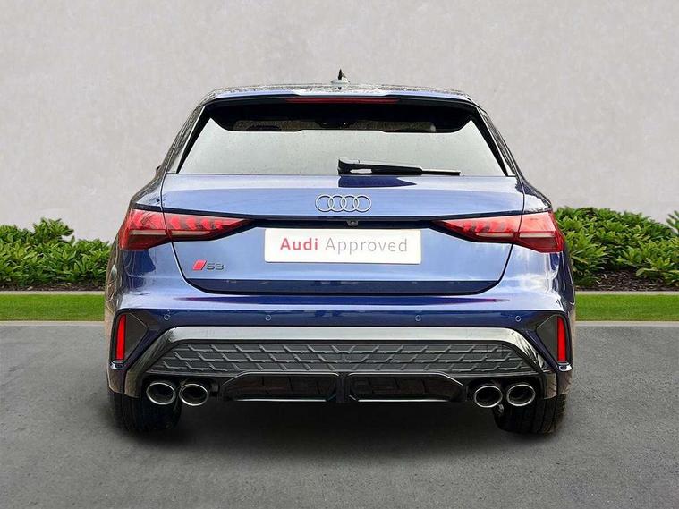 Adjustable speed limiter, Audi drive select, Audi smartphone interface with app store includes wireless Apple carplay, Android auto and Amazon alexa integration, Audi virtual cockpit plus - 12.3" full HD resolution dynamic digital instrument cluster, Automatic start/stop system with recuperation, Bluetooth interface, Camera based traffic sign recognition, Collision avoidance assistant, Distraction and Fatigue warning, e-Call (emergency call), Lane departure warning system, MMI Navigation Plus with high resolution 10.1" colour touch screen display, Park Assist with parking system Plus, Progressive steering, Service indicator, Tailgate, Trip computer, Voice control system with natural language interaction, Quattro permanent four wheel drive, S sport suspension with spring damper adjustment and lowering by 15mm, Audi Phonebox light with wireless charging, DAB Digital radio, USB ports with charging function in the rear, Anthracite grey Audi rings (front and rear), Audi Beam uses LEDs to project the rhombus S logo onto the ground as you exit your S3, Auto dimming frameless rear view mirror, Black accents front and rear bumpers including air inlets, Black accents in front grille and frame, Black accents window trims strips, Electrically adjustable/heated/folding/auto dimming door mirrors with integrated LED indications + kerb view function for passenger side, Exterior model badging, Front electric windows, Headlight washers, Heat insulating glass windscreen, Illuminated door sills with aluminium inserts at the front with S logo, LED 3rd brake light, LED daytime running lights, LED headlights with LED rear lights and dynamic rear indicators, Light and rain sensors, Privacy glass - dark tinted rear window, rear door and side windows, Rear electric windows, Rear side wing doors, Rear wiper, S grille, S3 front bumper with S specific air intake grilles, S3 roof spoiler, 12V socket and storage compartment in front centre console, 3 seat bench in 2nd row, 3 spoke flat bottomed leather multifunction sport steering wheel with gear shift paddles, 3-zone deluxe automatic air conditioning, 4 way electrically adjustable lumbar support for driver and front passenger, 40/20/40 split folding rear seat bench, Black cloth headlining, Fine Nappa leather upholstery with front sports seats S embossed logo, Front and rear centre armrest in artificial leather, Front and rear centre armrest in artificial leather with contrasting stitching on armrests and instrument panel, Front and rear headrests, Front/rear floor mats, Heated front seats, Height and reach adjustable steering wheel, Manual boot compartment lid, Manually adjustable front seats, Rear cup holders, S badging on the steering wheel, Seat side bolsters, Single front passenger seat, Stainless steel pedals and front footrest in black, Aluminium interior elements pack - A3 Sportback, Extended ambient lighting package Pro - S3 Black edition, Storage package - A3, Technology package - A3, 3x3 point rear seat belts, Driver and front passenger airbag with passenger airbag deactivation, Electronic Stabilisation Control (ESC) including ABS, ASR and EDL, First aid kit with warning triangle and 2 safety vests, Front side airbags with head airbags and interaction airbag, Hill hold assist, Pre-sense front with pedestrian and cyclist detection, Seatbelt monitoring, Tyre pressure loss indicator, Anti theft alarm, Anti-theft wheel bolts, Electronically operated child locks, Immobiliser, Remote central locking with safelock, Inlays in black dynamica microfibre, Tyre repair kit,