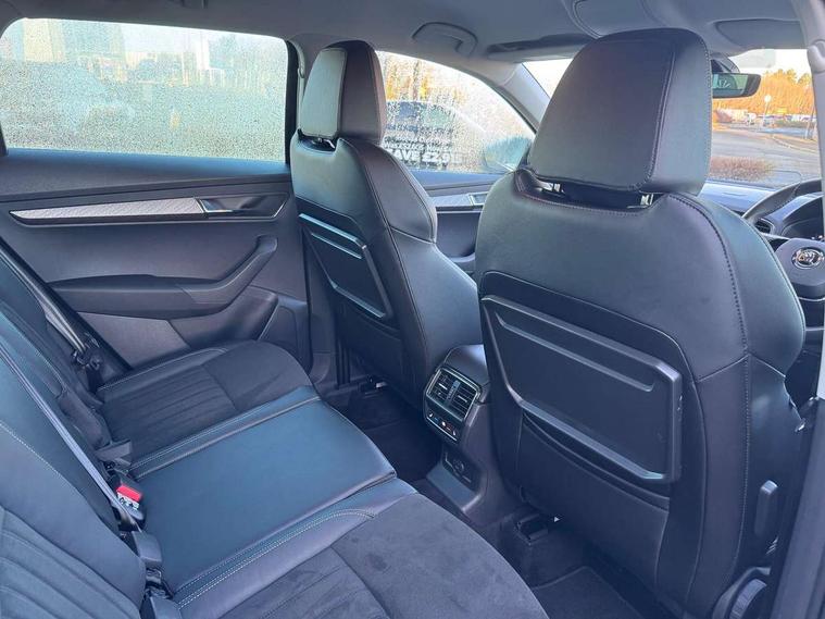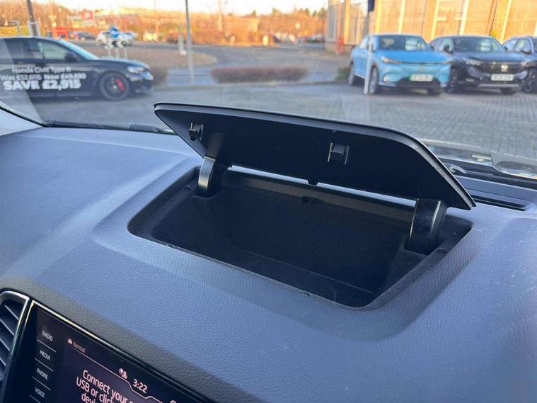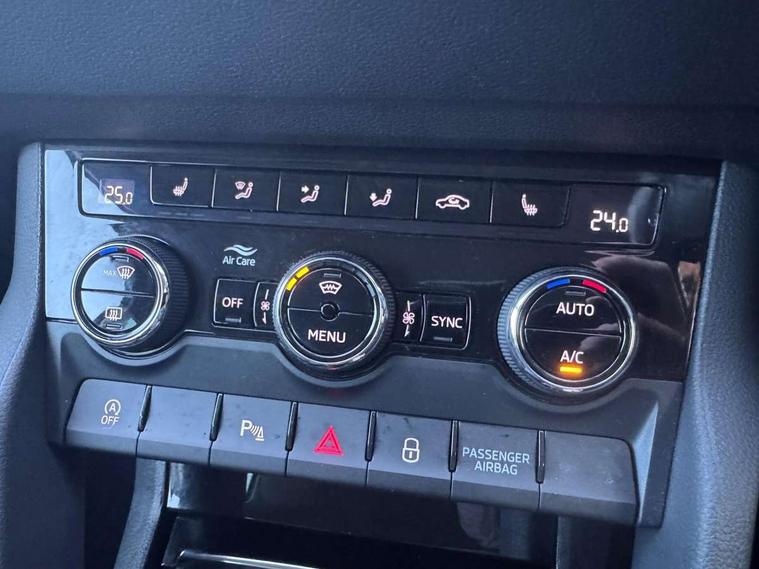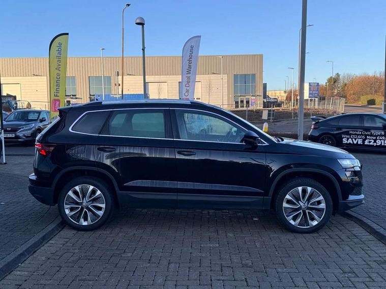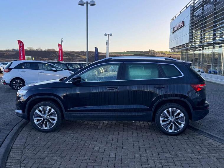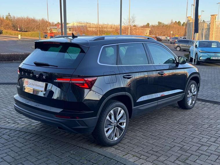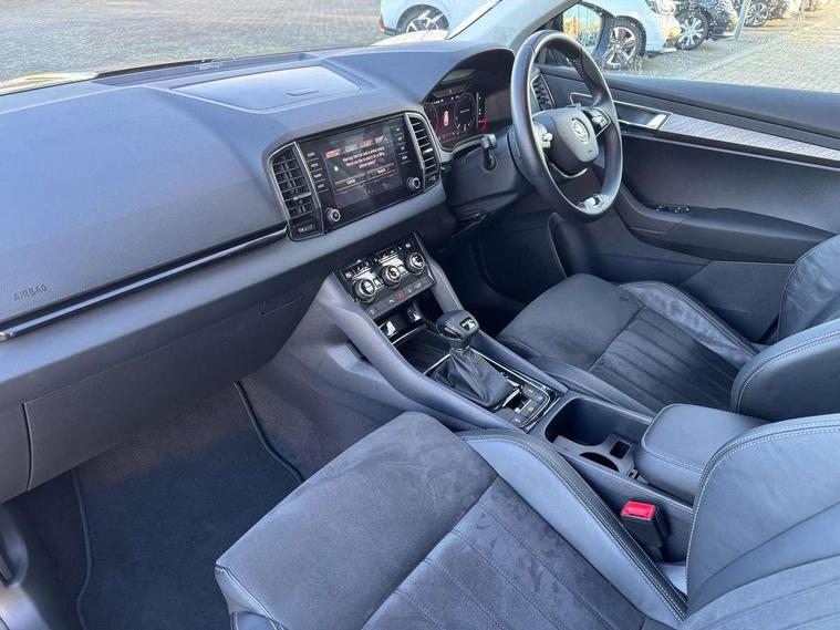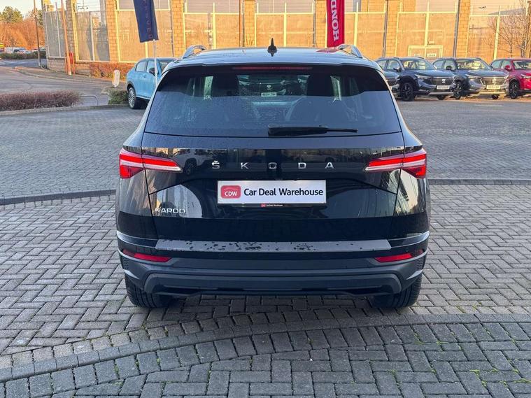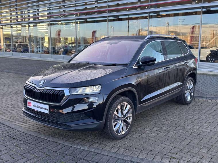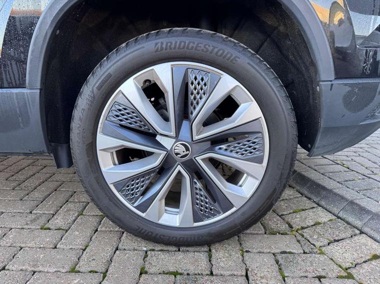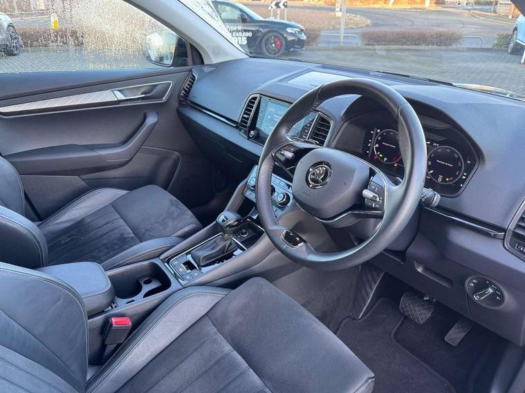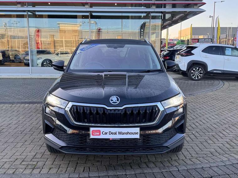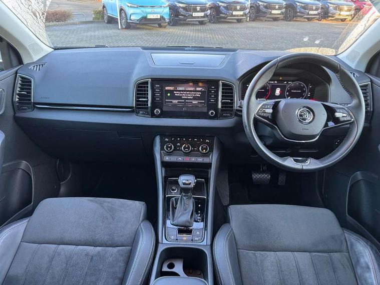 8" Digital display, Care connect, Driver fatigue sensor, Emergency services call system, Outside temperature gauge, Service interval indicator, SmartLink wireless for Apple and wired for Android, Start/stop system with regenerative braking, USB C Port x 2 in front centre console, 8 Speakers, DAB radio with Bluetooth, USB connection, Acoustic glass, Aero front windscreen wipers with intermittent function, Auto dimming rear view mirror with light and rain sensors, Black electric window control buttons, Body colour door mirrors and handles, Dynamic headlight range control with cornering light function, Electric front and rear windows with child proof lock, Heated rear windscreen, LED daytime running lights, LED rear lights with high functionality welcome effect and dynamic indicators, Light assistant (coming/leaving home/tunnel light), Plastic scuff plates, Privacy glass, Rear side wing doors, Rear spoiler, Rear window wiper with washer system and intermittent control, Safety reflectors on front doors, 1.5 litre bottle holders in driver and front passenger door panels, 12V socket in boot, 12v socket in front centre armrest with storage compartment and rear air vents, 2 Folding hooks and nets in boot, 2 spoke leather heated multifunction steering wheel with DSG paddles, 2 x Tablet holder, 3 rear height adjustable headrests, 3 seat bench in 2nd row, 4 foldable roof handles with rear coat hooks, Black floor carpet, Chrome inner door handles, Decorative door sills with KAROQ badging, Double sided boot floor, Foldable hooks in the boot, Front head restraints, Height adjustable front three point seats belts with tensioners, Height/reach adjust steering wheel, Ice scraper, Illuminated glovebox, Illuminated luggage compartment, Isofix child seat preparation for front passenger seat, Isofix child seat preparation outer rear, Manual lumbar support for front seats, Pen holder, Pollen filter, Rear boot cover, Rear reading lights, Rubbish bin door, Safety vest holder, Single front passenger seat, Storage box in upper central dashboard closed, Sunvisors with illuminated vanity mirrors, Textile floor mats, Ticket holder, VarioFlex seats with standard rear seat release, Chrome roof rails + chrome pack - Karoq, Parking pack - Karoq, Automatic door unlocking in case of crash, Automatic fuel cut off in case of crash, Child locks on rear doors, Driver airbag, Electronic parking brake with auto hold function, Emergency rear braking signal, ESC including ABS, MSR, ASR, EDS, HBA, DSR, RBS, MKB and traction control, Front side airbags, Hill hold control, Knee airbags, Passenger airbag with switch-off function, Pedestrian monitor, Seatbelt reminder signalisation and pretensioner for all seats, Three point seatbelts rear, Two tone horn, Tyre pressure display, Tyre pressure monitor, Alarm with interior monitoring, back up horn and tilt sensor with safe function, Electronic engine immobiliser, Keyless entry and start/stop, Remote central locking with 2 remote folding keys, Chrome framed air vents, 18" Procyon silver alloy wheels with anthracite aero inserts, Anti-theft wheel bolts protection, Storage on wheel cover, Tool kit,