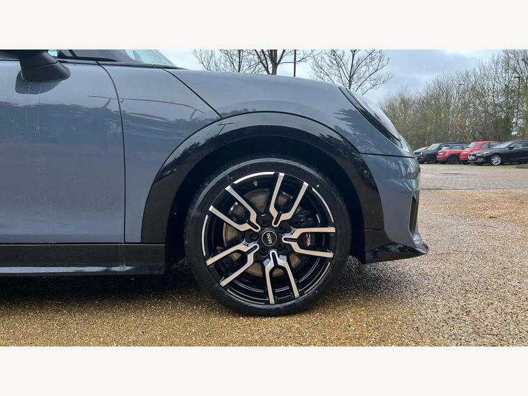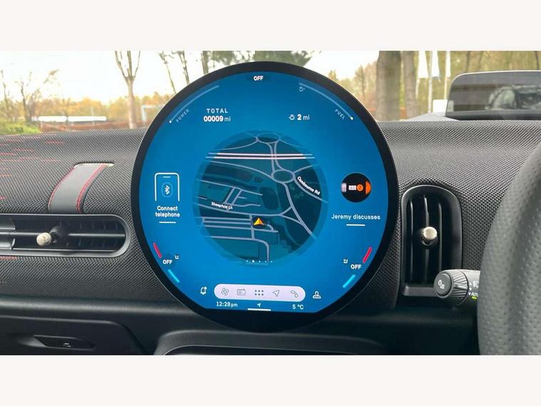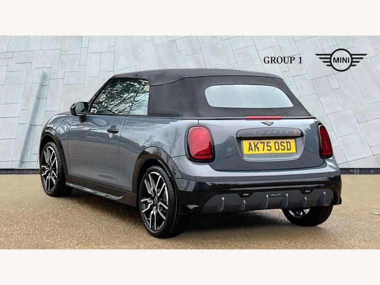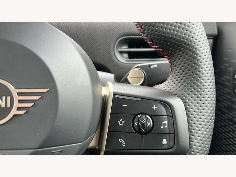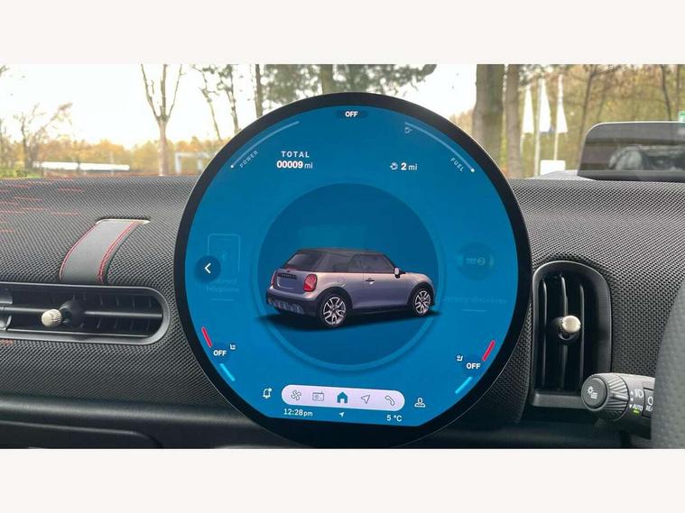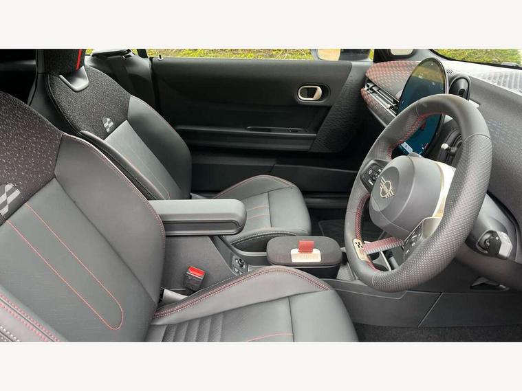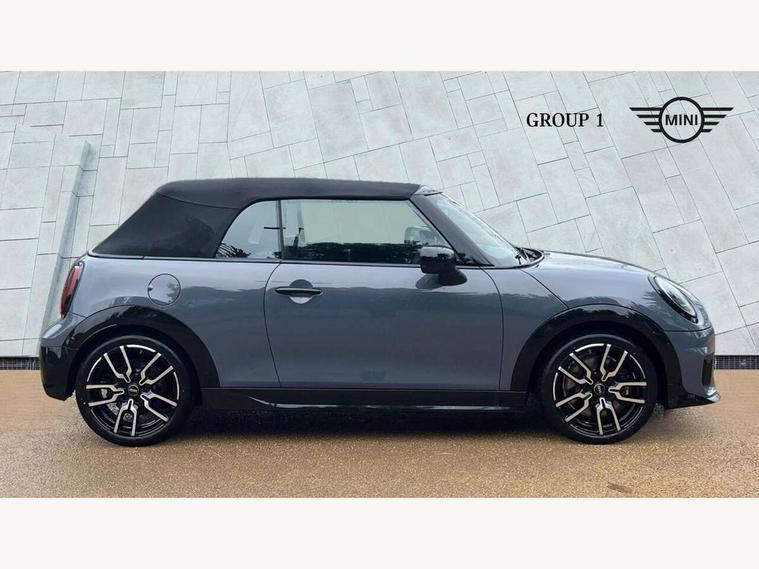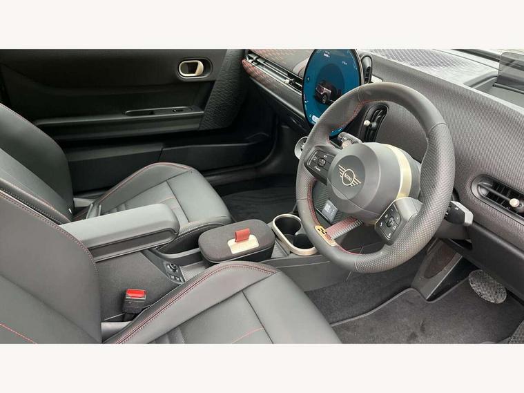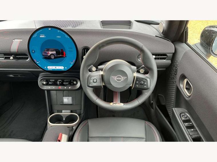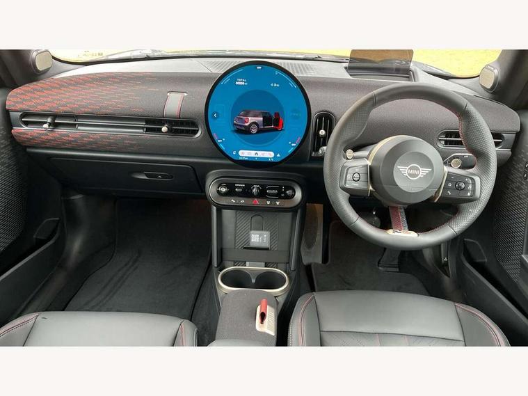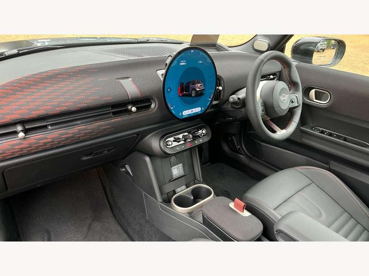 Always open timer, Central toggle bar, Circular OLED Screen, Compatible mobile phone bluetooth with audio streaming, Cruise control, Digital instrument cluster, e-Call (emergency call), MINI Experience Modes, Mini navigation system, On board computer, PAS, Service interval indicator, 7 speed steptronic transmission with double clutch, Adaptive suspension, DAB Digital radio, Personal eSim, Adaptable light signatures, Auto headlights, Electric front windows, Front and rear apron, High gloss hexagonal patterned grille surround, LED 3rd brake light, LED daytime running lights, LED indicator lights, LED rear lights, Logos in Vibrant Silver, Rain sensor window wipers, Rear boot, Rear fog lights, Rear roof spoiler with airblades, Wind deflector, 2 seat bench in second row, 2 zone automatic air conditioning, 60/40 rear seat bench, Ambient lighting, Black lower band in high gloss, Floor mats, Front and rear head restraints, Front compact armrest, Heated steering wheel, Height adjustable passenger seat, Lidded storage box in Black/Red knit, Light headliner, Luggage compartment lighting, Partially perforated vescin steering wheel with red accent, black/red decorative strap, Single front passenger seat, Steering wheel paddle shift, Sunvisors with vanity mirrors, Driving assistant pack - Cooper Convertible, Level 1 pack - Mini Convertible, Park assistant pack - Cooper Convertible, 3 point seatbelts on all four seats, 6 Airbags - front, side, head and seat belt tensioners, Anti-lock braking system (ABS), Brake caliper in Black with JCW badge, DSC - Dynamic Stability Control, Electronic parking brake, Front and rear disc brakes, Front ISOFIX (iSize), Front passenger airbag deactivation, JCW Sport Brakes, Traction control, Tyre pressure monitoring system, Alarm, Immobiliser, Physical spare key (not digital), Remote central locking, Black/Red decorative dash strap, Tyre repair kit,