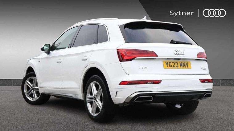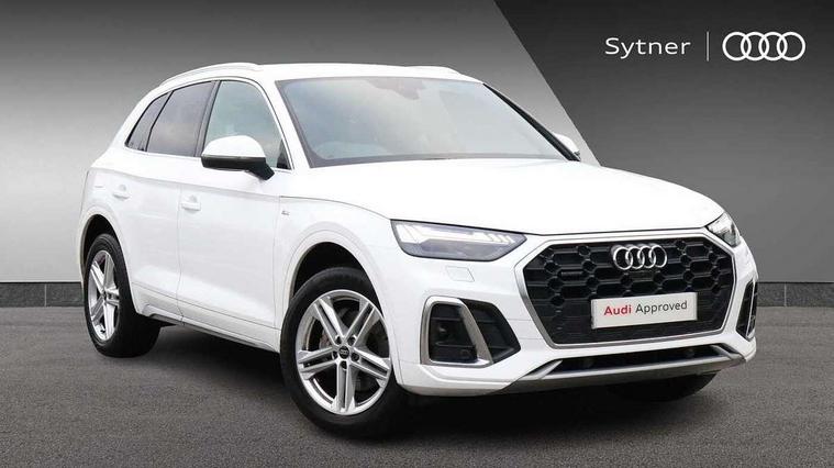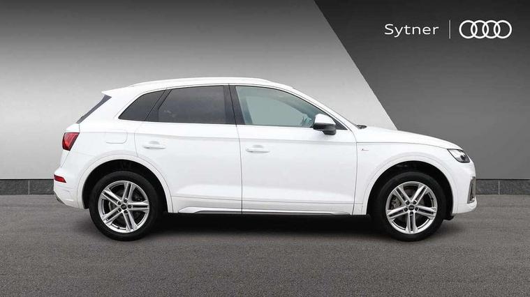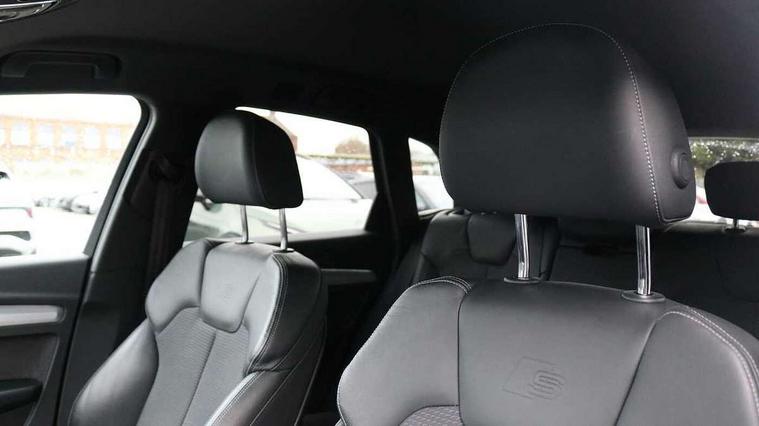 Acoustic front and rear parking sensor, Audi connect safety and service (e-call), Audi connect with Amazon Alexa Integration, Audi drive select, Audi virtual cockpit plus with 12.3" screen and three different layout designs, Audi wireless smartphone interface, Automatic start-stop system with coasting functionality and efficiency programme, Bluetooth interface, Electro - mechanical power assisted steering, MMI navigation plus with 10.1" touch screen, Power tailgate, Reversing camera, Service interval indicator, Voice control system with Audi hotword activation "Hey Audi", Diesel particulate filter, Quattro on demand, S line sports suspension, 2 x USB charging port with aux input socket, 8 loudspeakers, DAB Digital radio, Acoustic windscreen, Aluminium roof rails, Audi matrix LED headlights with dynamic front and rear indicators, Auto dimming door mirrors, Auto dimming frameless rear view mirror, Automatic headlight adjustment, Automatic headlights and windscreen wipers, Body colour bumpers, Body colour door mirrors, Body colour rear diffuser with matt aluminium silver surrounds, Body colour underbody protection, Chrome plated exhaust trims, Daytime running lights, Door sills in Selenite silver, Electric adjustable/heated/folding door mirrors, Front air inlet surrounds in aluminium, Front and rear electric windows, Front radiator grille in honeycomb design, Headlight washers, High level LED brake light, Lower bumpers painted in contrast Manhattan grey, Rear chrome trim strip below lights, Rear privacy glass and rear side windows, Rear side wing doors, Rear wiper, Roof bars, S Line badges on the front wings, S Line front and rear bumpers, S Line rear spoiler, S Line side skirts, 3 rear headrests, 3 spoke leather multifunction steering wheel with S badging perforated leather grips, 40:20:40 split folding 3 rear bench seat in 2nd row with rear centre armrest, Black cloth headlining, Comfort front centre armrest, Contrast stitching on seats, steering wheel and gear lever gaiter, Deluxe 3 zone electronic climate control, Front/rear floor mats, Gear lever in black leather, Heated front seats, Height adjustable front head restraints, Height/reach adjustable steering column, Illuminated door sill trims with S logo, Luggage compartment cover, Manual seat adjustment with 4-way electric lumbar support, Removable luggage compartment floor, Single front passenger seat, Stainless steel pedals, Sunvisors with vanity mirrors, High gloss pack - Q5, LED interior light pack - Q5, 3 point seatbelts on all seats, 6 airbags - Driver, front passenger, curtain and side airbags, Electrically operated child locks on rear doors, Electromechanical parking brake, Electronic stabilisation control including ABS, ASR and EDL, First aid kit with warning triangle and vests, Front passenger airbag deactivation, Hill descent control, Hill hold assist, ISOFIX child seat mounting for front passenger seat and ISOFIX child seat mounting with Top Tether for outer rear seats, Multi collision brake assist, Pop-up bonnet for pedestrian protection, Pre sense city, Seat belt force limiter, Seatbelt monitoring, Tyre pressure warning, Anti theft alarm, Anti-theft wheel bolts, Keyless Go access/ignition system, Remote central locking, Air vents inserts and centre console in gloss black, Matt brushed aluminium inlays,