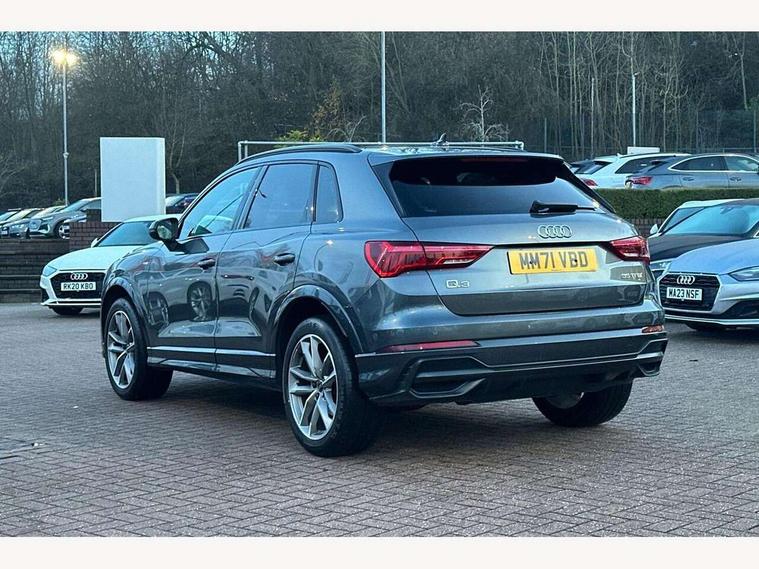 Amazon alexa Integration, Audi connect safety and service (e-call), Audi drive select, Audi lane departure warning, Audi smartphone interface includes wireless Apple carplay/Android Auto, Audi Virtual Cockpit - 10.25" display, Bluetooth interface, Camera based traffic sign recognition, MMI Navigation Plus with high resolution 10.1 inch touchscreen colour display, Power operated tailgate, Progressive steering, Service interval indicator, Start stop system with recuperation, Voice control system with natural language interaction, 48V Mild hybrid technology, Sports suspension, 2 USB-C ports with charge and data functions, 6 passive loudspeakers, DAB digital radio module, Acoustic windscreen, Auto dimming frameless rear view mirror, Black roof rails, Electrically folding, adjustable and heated door mirrors with integrated LED side indicators and kerb view function for passenger side, Front and rear electric windows, Front fog lights, Grille vertical bars in aluminium silver/Matt, High gloss black finish B and C pillars, LED headlights with LED daytime running lights and dynamic rear indicator, LED rear lights, Privacy glass dark tinted rear and rear-side windows (from B-pillar backwards), Rain and light sensors, Rear diffuser strip in matt titanium black, Rear side wing doors, Rear wiper, S line bumpers in contrasting Manhattan grey, Third brake light, Tinted rear windows, Variable front intermittent wipers, 12V socket in rear centre console, 3 seat bench in 2nd row, 40:20:40 folding with manual adjustment for 60:40 forwards/backwards position and backrest angle, Adjustable rear seat bench/backrest with centre armrest and cupholder, Black cloth headlining, Dual zone electronic climate control, Front and rear black floor mats with contrast stitching in rock grey, Front and rear headrests, Front and rear roof module including reading lights, Front centre armrest, Glove compartment lighting, Height and reach adjustable steering wheel, Illuminated door sill trims with S logo, ISOFIX child seat mounting for front passenger with airbag deactivation and outer rear seat including top tether attachment point for outer rear seats, Luggage compartment light, Manual front seats with height adjustment, Perforated leather gearknob, Single front passenger seat, Stainless steel luggage compartment sill finisher, Stainless steel pedals, Tool kit, Black styling pack - Q3, Non smoking pack - Q3, 3x3 point rear seatbelts, 6 airbags - Driver, front passenger, curtain and side windows, Electrically operated child locks on rear doors, Electromechanical parking brake, Electronic stabilisation control including ABS, ASR and EDL, Front seatbelt reminder, Hill descent control, Hill hold assist, Pre sense basic, Seatbelt monitoring, Tyre pressure warning, Warning triangle and first aid kit, Anti theft alarm, Anti theft wheel bolts, Audi pre-sense front with pedestrain and cyclist recognition, Immobiliser, Remote central locking, Leatherette door armrest, MMI touch colour display in glass look, black with surround in aluminium look, Piano black inlay, Tyre repair kit,