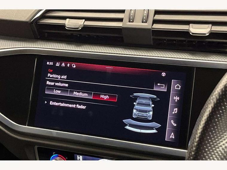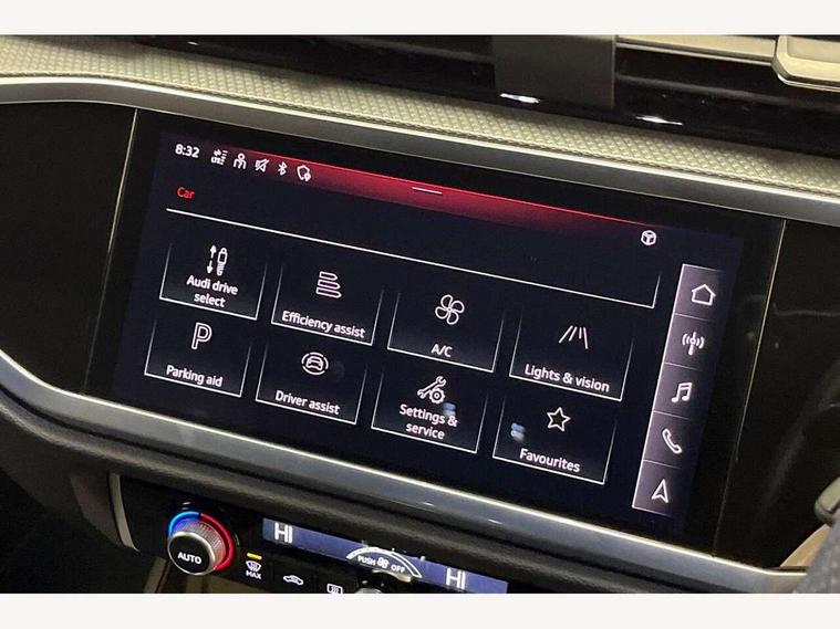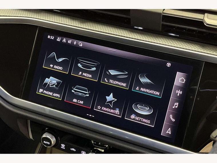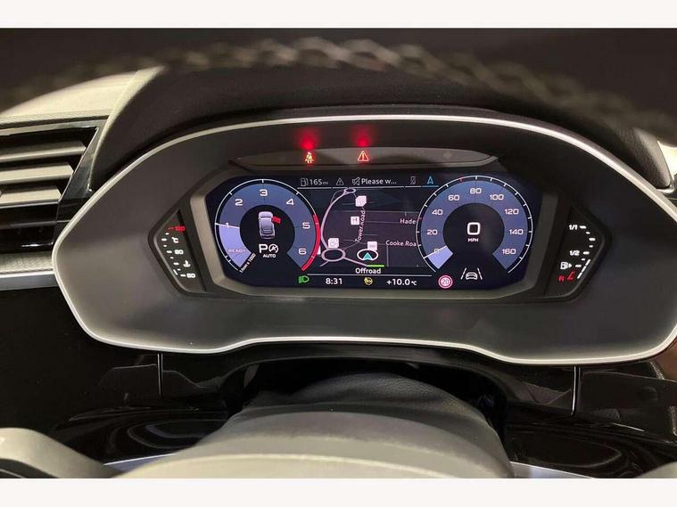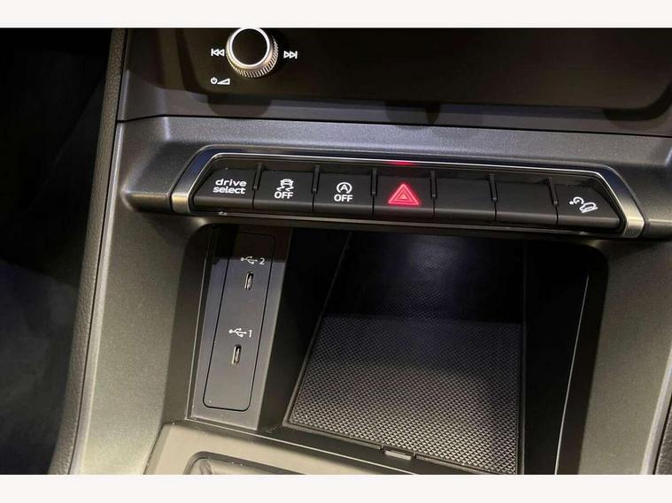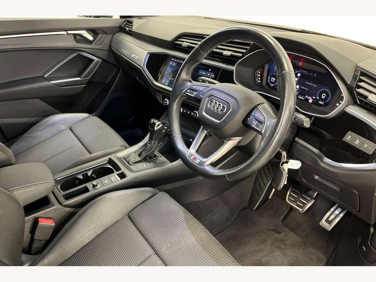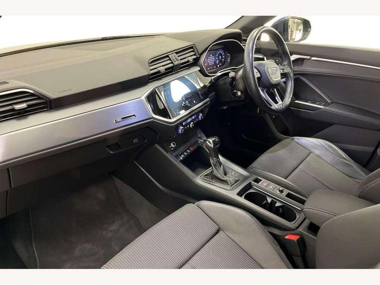 Audi connect safety and service (e-call), Audi drive select, Audi lane departure warning, Audi smartphone interface includes wireless Apple carplay/Android Auto, Audi Virtual Cockpit - 10.25" display, Bluetooth interface, Camera based traffic sign recognition, MMI Navigation Plus with high resolution 10.1 inch touchscreen colour display, Power operated tailgate, Progressive steering, Service interval indicator, Start stop system with recuperation, Voice control system with natural language interaction, Diesel particulate filter, Sports suspension, 2 USB-C ports with charge and data functions, 6 passive loudspeakers, DAB digital radio module, Acoustic windscreen, Aluminium window trim, Auto dimming frameless rear view mirror, Diffuser grille in grained matt black, Diffuser trim in selenite silver, Electrically folding, adjustable and heated door mirrors with integrated LED side indicators and kerb view function for passenger side, Front and rear electric windows, Front fog lights, Front side air inlets in selenite silver, Front underbody protection in manhattan grey paint finish, Grille surround in aluminium silver matt, High gloss black finish B and C pillars, LED headlights with LED daytime running lights and dynamic rear indicator, LED rear lights, Privacy glass dark tinted rear and rear-side windows (from B-pillar backwards), Radiator grille in titanium black with inlay in matt aluminium silver, Rain and light sensors, Rear underbody protection in matt black, S line badges on front wings, Side skirt insert in matt Platinium grey, 12V socket in rear centre console, 40:20:40 folding with manual adjustment for 60:40 forwards/backwards position and backrest angle, Adjustable rear seat bench/backrest with centre armrest and cupholder, Black cloth headlining, Dual zone electronic climate control, Front and rear black floor mats with contrast stitching, Front and rear headrests, Front and rear roof module including reading lights, Front centre armrest, Glove compartment lighting, Height and reach adjustable steering wheel, Illuminated door sill trims with S logo, ISOFIX child seat mounting for front passenger with airbag deactivation and outer rear seat including top tether attachment point for outer rear seats, Luggage compartment light, Manual front seats with height adjustment, Perforated leather gearknob, Stainless steel luggage compartment sill finisher, Stainless steel pedals, Non smoking pack - Q3, 3x3 point rear seatbelts, 6 airbags - Driver, front passenger, curtain and side windows, Audi pre-sense front with pedestrain and cyclist recognition, Electrically operated child locks on rear doors, Electromechanical parking brake, Electronic stabilisation control including ABS, ASR and EDL, Hill descent control, Hill hold assist, Pre sense basic, Seatbelt monitoring, Tyre pressure warning, Warning triangle and first aid kit, Anti theft alarm, Anti theft wheel bolts, Remote central locking, Black dashboard, Dark matt brushed aluminium inlay, Detail dashboard around MMI touch colour display in glass look, black with surround in aluminium look, Leatherette door armrest,