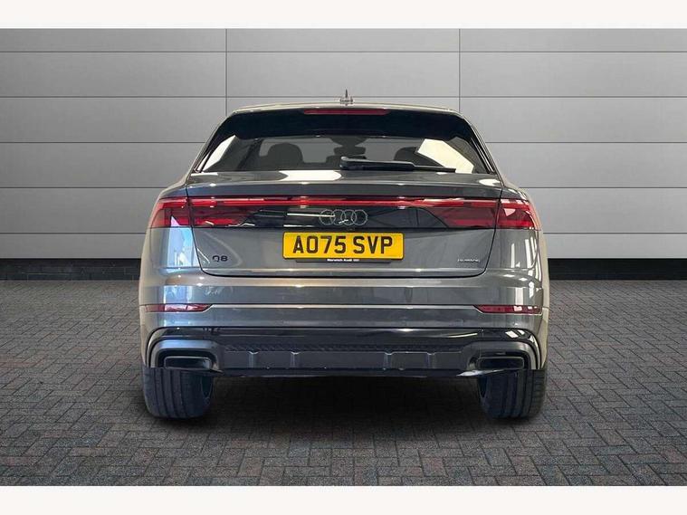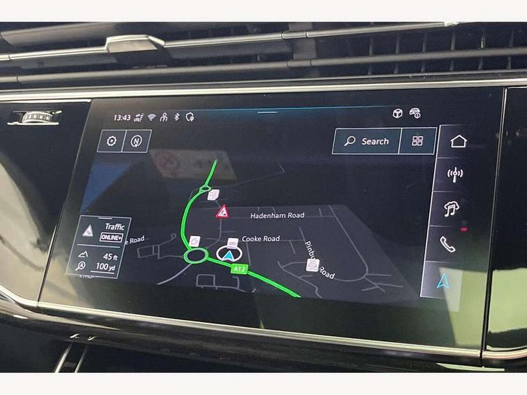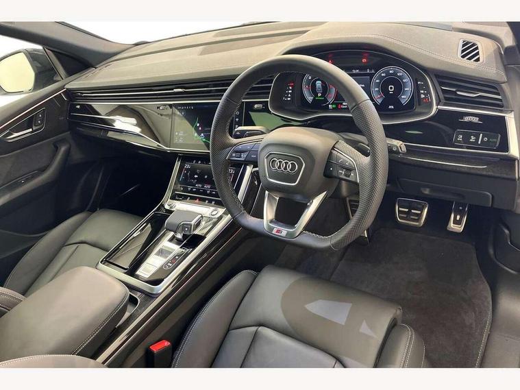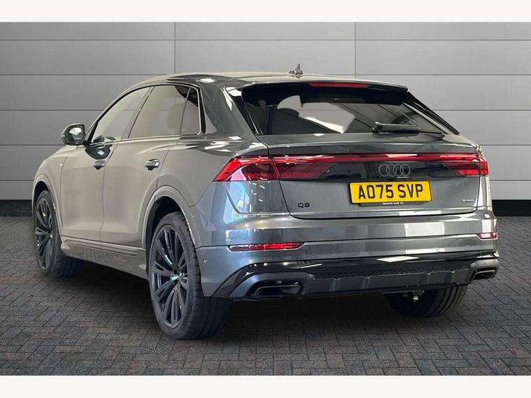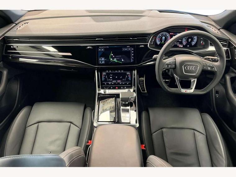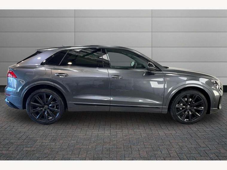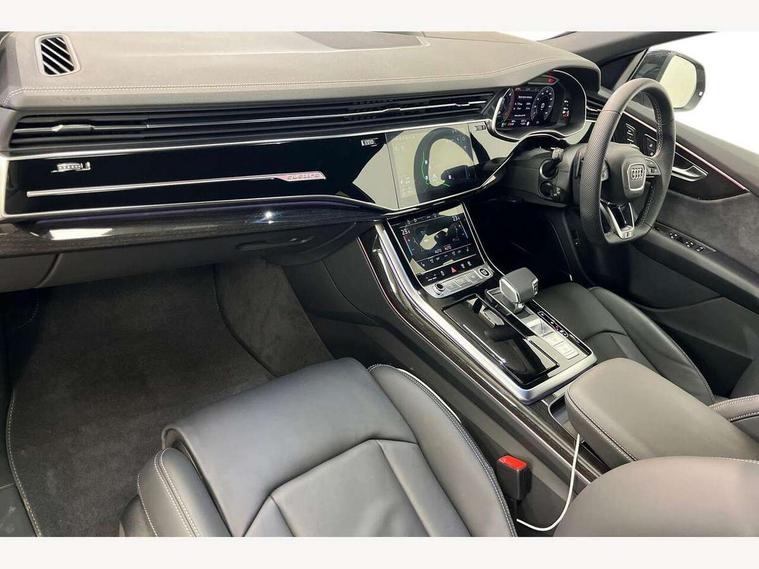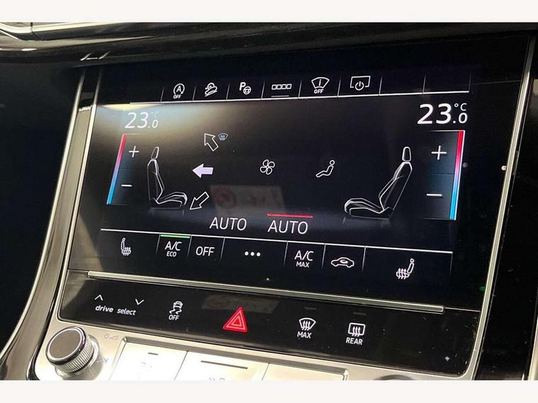 10.1" and 8.6" Dual colour touchscreens, Audi application store, Audi connect safety and service (e-call), Audi connect with Amazon Alexa Integration, Audi drive select, Audi parking system plus includes 360 degree display with front and rear sensors, Audi phone box light with wireless charging, Audi virtual cockpit - 12.3" high resolution LCD display with fully customisable instrument cluster, Automatic start/stop system, Bluetooth, Electro-mechanical PAS, Low washer fluid indicator, MMI navigation plus with MMI touch, Natural voice recognition, On board computer, Operating buttons in black, glass look with haptic feedback, Power operated tailgate, Rear view camera, Service interval indicator, Smartphone interface includes wireless Apple carplay/Android Auto, 48V Mild hybrid technology, Adaptive sport air suspension, Diesel particulate filter, Quattro all wheel drive with self locking centre differential, Audi music interface with 2 USB ports with charge and data functions, Audi sound system with 6 channel amplifier, 180 watt amplifying capacity and 10 loudspeakers including subwoofer, Aux-in socket, DAB Digital radio, 3rd brake light, Audi beam, Auto dimming frameless rear view mirror, Black exhaust tailpipes, Black single frame mask, Coming/leaving home lighting function, Electric front+rear windows, Electrically folding auto dimming/adjustable/heated door mirrors with memory function, LED side indicators and kerb view function for passenger side, Headlight washers, Heat insulating glass in windshield, LED rear light plus, LED signature daytime running lights, Loading edge protection in stainless steel, Matrix LED headlights with dynamic front and rear indicators, Platinum grey front spoiler lip and diffuser insert with honeycomb grille in black, Privacy glass - dark tinted rear and rear side windows from B-pillar backwards, Rain and light sensors, Rear side wing doors, Rear wiper, Singleframe grille surround in matte platinum grey, 2 zone automatic climate control, 3 bench rear seats in 2nd row, 4-way lumbar support for front seats, 40:20:40 split folding rear bench seat, Black cloth headlining, Comfort front centre armrest, Driver seat memory function, Electrically adjustable front seats, Front head restraints, Front/rear floor mats, Heated front seats, ISOFIX child seat mounting for front passenger seat and 2 outer rear seats with top tether child seat mounting for all 3 rear seats, LED interior ambient lighting, Luggage compartment sill protection in stainless steel, Rear centre armrest with 2 cupholders, Rear headrests, Seat cushion displaceable by 100mm in the ratio 60:40, Single front passenger seat, Stainless steel pedals, Sunvisors with illuminated vanity mirrors, Black styling pack plus - Q8, 3 point seatbelts on all seats, Audi pre sense front, Convenience key with safelock, Driver and front passenger, front side and curtain airbags, Electromechanical parking brake, Electronic Stability Control (ESC) including ABS, ASR and EDL, Front passenger airbag deactivation, Hill descent control, Hill hold assist, Predictive pedestrian protection, Seatbelt monitoring, Traction control, Tyre pressure loss indicator, Warning triangle and first aid kit, Anti theft alarm with tow away protection, Anti-theft wheel bolts and wheel loosening detection, Electronically operated child lock, Immobiliser, Keyless go with remote central locking, Polished oak trim with grey finish inlay, Tool kit, Tyre repair kit,