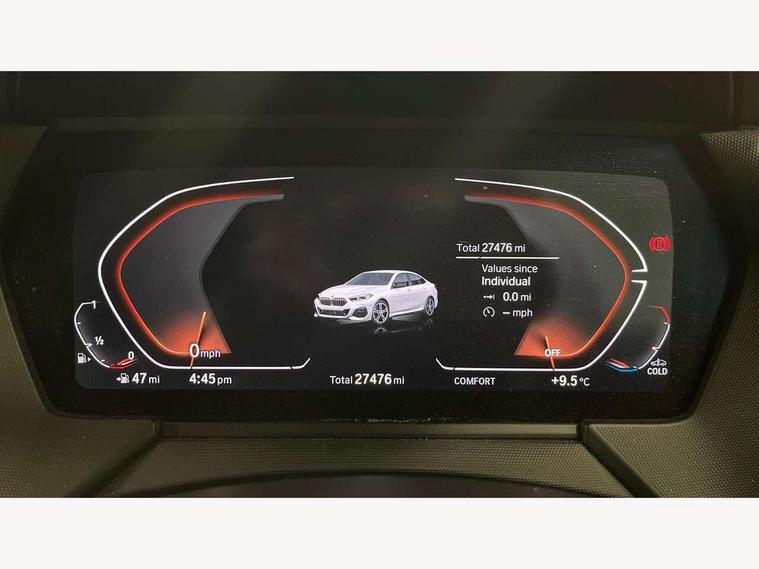 Active guard plus, Attentiveness assist, Auto start-stop, BMW Intelligent Personal Assistant, BMW Live Cockpit Professional with 10.25" high resolution instrument and control display, BMW Online services, BMW operating system with 7.0 mid interface, BMW Teleservices, Characteristic map controlled oil pump system, Check Control warning system for monitoring of lights and door/luggage compartment open warning, Cruise control with braking function, iDrive controller with 7 short cut favourite buttons on centre console, Integrated navigation data with map data via USB +features such as 3D landmarks and micro city models, Integrated owners handbook, Intelligent voice assistant, Lane departure warning system, M Sports steering, On board computer - average speed+fuel consumption, service interval, clock/date, odometer/trip meter, outside temperature display and ice warning, Optimum shift indicator, Personal Profile, Pull away assistant, Speed limiting function, 2 balance shafts, 7 speed sport automatic transmission with double clutch technology and sportier application, Aluminium lightweight construction, BMW TwinPower twin-scroll Turbo four-cylinder petrol engine, Double VANOS, Drive performance control with ECO PRO comfort + sport mode, Electronic differential lock, High precision injection, Larger fuel tank capacity (50 litres), M Sport suspension with stiffer spring/damper set-up and vehicle lowered by 10mm + twin tube gasfilled shock absorbers and Anti roll bars, Performance Control, Petrol Particulate Filter, VALVETRONIC engine management, 2x USB Type C ports (for charging and data transfer), 4G LTE Connectivity with hard wied 4G network sim card, DAB digital radio, MP3 players and RDS double tuner, Auto wipers, Automatic headlight beam throw control, Automatically dimming rear view mirror, Body colour door handles, Body colour mirror caps, Chrome 'M' logo side designation, Chrome exhaust single tailpipe, round, Direction indicator side lights integrated exterior mirrors, Electric windows - front and rear, with open/close fingertip control and trap release, Exterior mirrors - electrically folding with anti-dazzle, Fading support, Follow me home headlights, Front and rear bumper system with replaceable deformation elements, Front door sill finishers in black plastic with M designation in metallic look, Heated, electrically adjustable exterior mirror aspheric on driver side, convex on passenger side, High gloss black B pillar finish, High gloss shadow line exterior trim, High level third brake light, LED daytime running lights, LED front fog lights, LED Headlights, Lightweight engineering, Model designation on right side of tailgate, Preparation for high beam assistant, Rain sensor with automatic headlight activation, Rear boot, Rear fog lights, Rear side wing doors, Reversing light in rear light cluster, Welcome lighting, 12V power socket in centre console, 2 cupholders in front centre console, 3 rear seat head restraints, 3 rear seats, 3 spoke M sports design leather steering wheel finished in nappa leather with specific M badge, Anthracite finished floor mats with contrasting surround, Anthracite headlining, Automatic two zone climate control air conditioning, Child seat ISOFIX attachment for two outer rear seats and front passenger seat with anchorage points, Conditioned based service, Driver and front passenger seat heating, Front and rear door pockets including bottle trays, Front and rear side armrests integrated into door trim, Front armrest foldable with integrated storage compartment, Front centre interior light over interior mirror and rear centre automatic interior light when door is opened/ignition switched off or via remote key, Front head restraints, Front passenger seat, Front sports seats with electric side bolster adjustment, Glove compartment, Glovebox with light, Luggage compartment lighting, Manually adjustment steering wheel column, Multi-function controls for steering wheel, Sun visors with vanity mirrors and insert tab, Through loading system with 40/20/40 split folding rear seat, Two lashing eyes, Additional interior lighting pack - 2 Series Gran Coupe, Extended storage pack - 2 Series Gran Coupe, M Sport exterior styling aerodynamics pack - 2 Series Gran Coupe, 2 tone horn, Airbag - Front driver and passenger, front and rear head, front side, curtain head protection, manual deactivation of front passenger airbag possible, Anti lock braking system (ABS) with cornering brake control, BMW emergency call, Brake drying, Braking readiness, City braking function, Crash sensor activating of airbags, Unlocking doors, hazard warning lights, interior light, safety battery terminal, Dynamic stability control + (DSC+), Dynamic Traction Control - DTC, Electrically operated hand brake, Rear brake discs, Rear child proof door locks, Seat belt security check for driver and front passenger, Seatbelt warning, Side impact protection, Three point seat belts on all seats including front belt stopper, pyrotechnic belt tensioners and belt force limiters, Trailer stability control, Tyre pressure monitoring system, Ventilated front disc brakes, Warning triangle and first aid kit, Central locking switch for all doors, fuel filler cap and luggage compartment, Deadlocking function system to all doors, Drive away locking system on all doors and luggage compartment, Locking wheel bolts, Start/Stop button (illuminated) in centre console with keyless engine start and Auto Start-Stop deactivation button, Thatcham Cat.1 alarm and immobiliser, Two remote control key with integrated key - open/close doors/fuel flap/tailgate +1 button for unlock compartment with M design high gloss black inlay, Contrast stitching on instrument panel, 18" Burnished M double spoke bi-colour alloy wheels finished in orbit grey - style 819M, Reduced rolling resistance tyres,