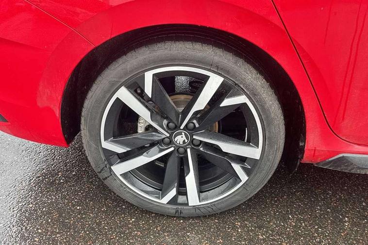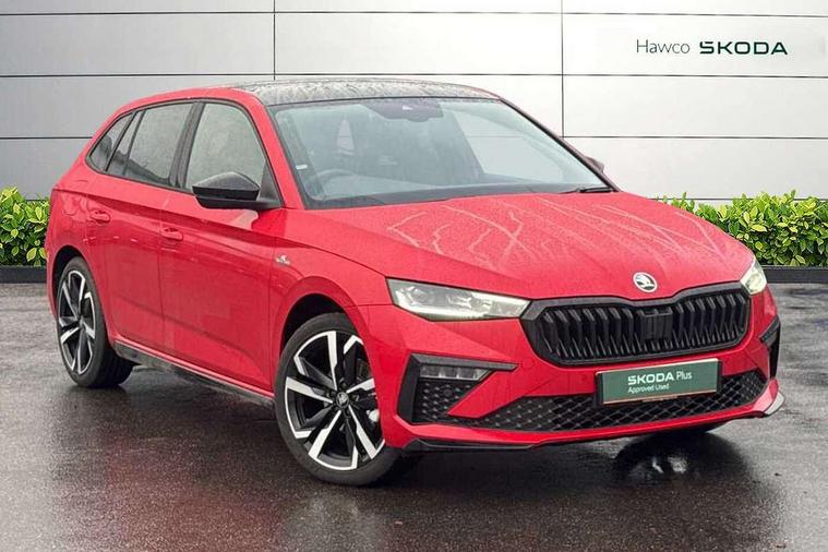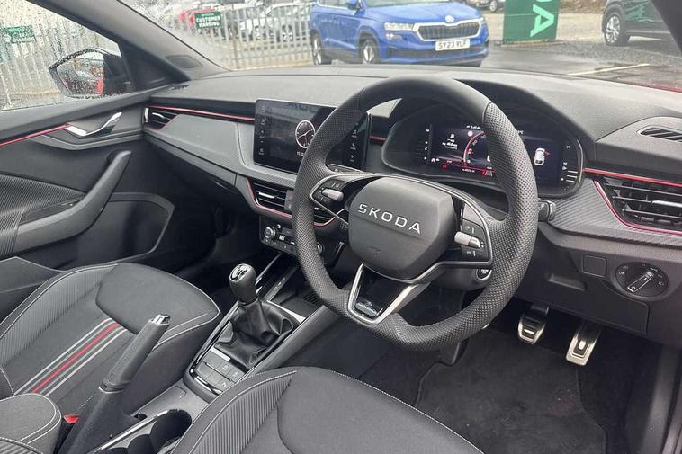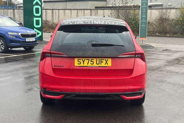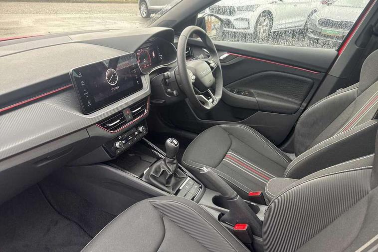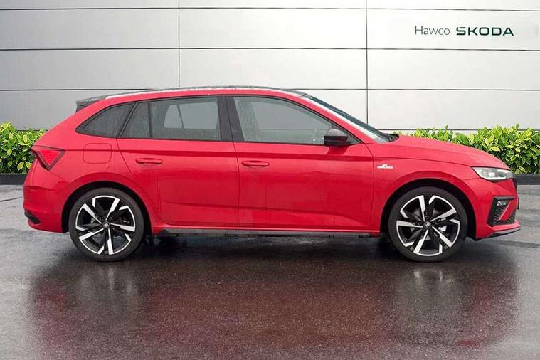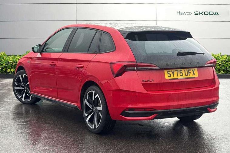 Advanced driver attention and drowsiness monitor, Bluetooth, e-Call (emergency call), Front assist system, PAS, Rear parking sensors, Rear view camera, Speed limiter, Tailgate, Traffic sign recognition, Virtual Cockpit - 10.25" digital display, Voice control system, Wireless smartlink, Drive mode select with Sport Chassis Control and ECO mode, 4 USB C ports, 8 Speakers, 9.2" Skoda navigation display, DAB radio, Auto dimming rear view mirror, Automatic headlight control with manual coming and leaving home feature, Automatic intermittent wipers, Black door mirrors, Black lettering on boot lid, Black radiator grille, Black rear diffuser, Black roof spoiler, Black window frames, Body colour bumpers, Body colour door handles, Extended tailgate glass, Front and rear electric windows, Heated rear window, LED 3rd brake light, LED daytime running lights, LED high beam, LED low beam, Light sensors, Monte carlo plaque, Panoramic glass roof, Privacy glass, Rear LED fog light, Rear side wing doors, Rear wiper, Tinted windows, Unique dark chrome design logo on alloy wheels, 12V socket in luggage compartment, 3 seat bench in 2nd row, Aluminium pedals, Ambient lighting in white/red, Black / White armrest stitching, Black roof headlining, Cargo elements, Chrome inner door handles, Door inserts in art.leather carbon, Driver and passenger sun visors with vanity mirror, Dual zone climate control, Front and rear roof lights, Front centre armrest, Front head restraints, Height adjustable driver seat, Height adjustable passenger seat, Ice scraper, Illuminated glove compartment, Inner circulation control with pollen filter, ISOFIX for front passenger seat, Isofix preparation for back seats, Leather gearknob and handbrake lever, Luggage net under rear parcel shelf, Manual lumbar support for front seats, Monte Carlo cloth upholstery, Net package and top tether hooks in boot space, Pocket on the back of both front seats, incl. mobile phone pockets, Rear centre armrest, Red hotstamping, Single front passenger seat, Skoda lettering on steering wheel, Sport seats, Textile floor mats, Third rear headrest, Ticket holder, Top tether for front passenger seat, Umbrella in driver's door, Light and view plus pack - Scala, 3x3 point rear seatbelts, ABS, Child locks, Curtain airbags and front side airbags, Disc brakes, Driver and front passenger airbags, ESP, Hill hold control, Manual leather parking brake, One tone horn, Passenger airbag switch off function, Seatbelt reminder for driver and front passenger, Tyre pressure monitoring system, Anti theft alarm system with interior monitoring, backup horn and towing protection, Anti-theft wheel bolts, Remote central locking with 2 remote folding keys, SAFE function for remote central locking, Carbon effect decorative inserts, 18" Ursa black diamond cut alloy wheels,