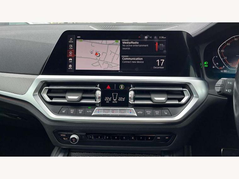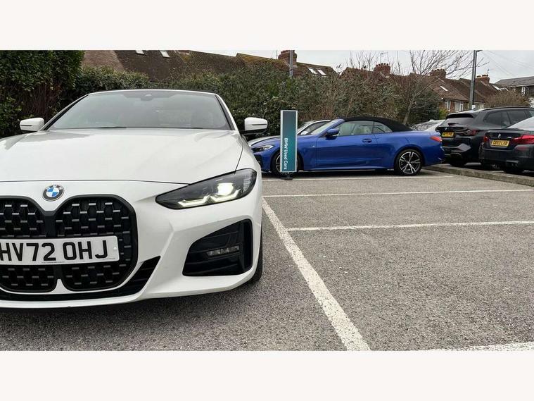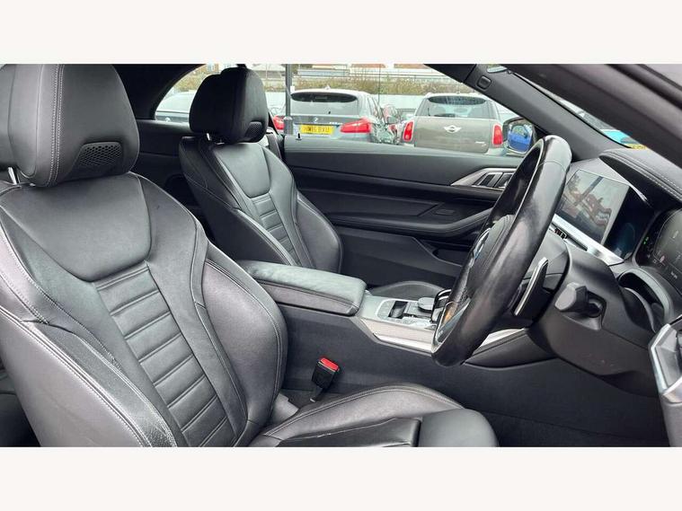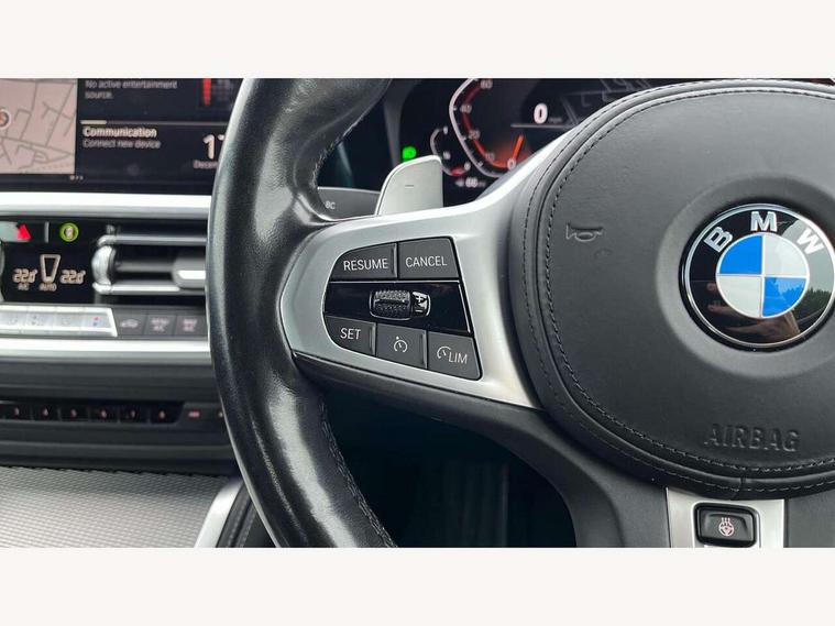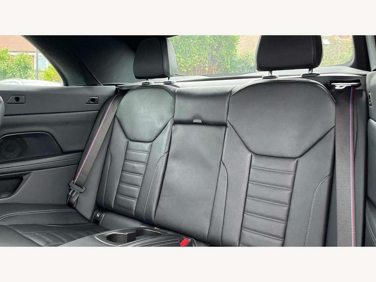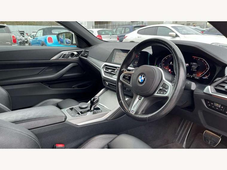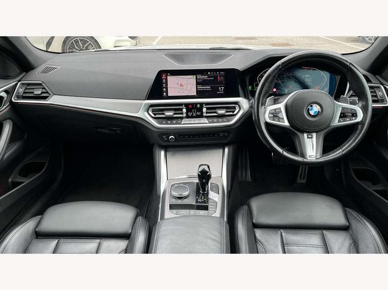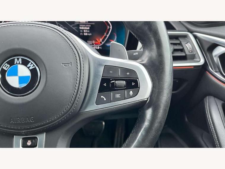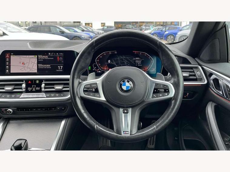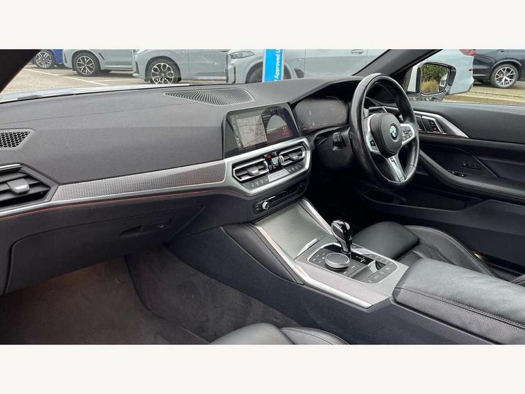 Active guard plus, Attentiveness assist, Auto start-stop, BMW ConnectedDrive online services, BMW iDrive controller on centre console, BMW Live Cockpit Professional Nav with 12.3" instrument display + 10.25" display, Intelligent Voice Assist, BMW OS 7, HDD, 2USB, 4G LTE connect, BMW service history, BMW Teleservices, Brake pad wear indicator in front and rear, Check Control warning system for monitoring of lights and door/luggage compartment open warning, Condition based service, Cruise control with brake assist, Electric power steering with Servotronic steering optimised at all speed ranges, Gearshift time display in manual mode, Instrument cluster with speedometer with mph readout, tachometer, fuel gauge and oil temperature gauge, Integrated owners handbook, Oil sensor for level and grade, warning by check control system, On board computer - average speed, fuel consumption, outside temp display with acoustic warning, clock/date, service interval, odometer/trip meter, Optimum shift indicator, Variable sport steering, 8 speed automatic steptronic transmission with gearshift paddles, Balanced 50/50 weight distribution, Double VANOS, Drive performance control - ECO PRO, comfort and sport modes, High precision injection, Low centre of gravity, M sport suspension, Petrol Particulate Filter, Stroke dependent dampers, VALVETRONIC engine management, DAB tuner, Electronic service booklet, Acoustic glazing, Automatic headlight beam throw control with load dependent regulating reaction, dynamic compensation of braking dive and acceleration squat, Automatic windscreen wipers and automatic headlight, Automatically dimming electrochromatic rear view mirror, BMW emblem on engine compartment lid and tailgate, BMW kidney grille with mesh grille front side of the nuggets in matt aluminium and frame in chrome high gloss, Body colour fuel filler flap, Body colour roof fin, Brushed aluminium inserts in the front door sill finishers with BMW designation, Dynamic brake lights, Electric windows - front and rear, with open/close fingertip control, anti trap facility and comfort closing function all round, Exhaust tailpipe - split left and right, Exterior mirrors - electrically folding with anti-dazzle, Fading support, Follow me home headlights, Front and rear bumper system, Front apron plastic in body colour, Green tinted heat protection glazing, High gloss shadow line exterior trim, Illuminated bow type door handles in body colour drivers side with door lock, Interior rear view electrochromatic mirror with automatic anti dazzle function, LED daytime running lights, LED front fog lights, Licence plate panel integrated into front bumper and tailgate, Lightweight engineering, M designation on front side panels, left and right, Model designation on right side of tailgate, One piece front bumper cover including towing eye cover in body colour, Preparation for high beam assistant, Rear boot, Reversing light, Side frame decorative moulding black matt, Third brake light, Two part LED tailights in L-shape with components in smoked glass, brake light, LED turn indicator and rear fog light, Visible VIN plate, Welcome lights in interior and door handle area, Widened track and increased camber values for max transverse dynamics, agility and steering precision, Window recess cover black high gloss, Windscreen wipers with integrated heated washing jets, 12V power socket in front centre console, 2 2nd row folding seats, 2 front cupholder in centre console with clamping elements and matt black inlay, 2 Rear seat headrests, 2nd row centre armrest with built-in cupholders, 3 spoke M sport leather multifunction steering wheel, 3 zone automatic air conditioning, 4 pieces lashing eyelets in luggage compartment, Ambient lighting with welcome carpet light, Armrest integrated in front and rear door trim + front centre console armrest, Electric seat adjustment with memory, Four grab handles integrated in roof lining, Front and rear door pockets, Front and rear footwell lights, Front and rear reading lights, Front headrests, Front sport seats, Heated driver and front passenger seats, Height adjustable mechanically and infinitely variable steering column, Illuminated armrest storage compartment, Illuminated glove compartment with separate small compartment, Luggage compartment light, Make-up mirror lights, Single front passenger seat, Storage compartment in rear centre console, Sunvisors with vanity mirrors and ticket pocket, Toolkit located in luggage compartment, USB type - C cable charging function in the rear centre console, Velour front floor mats, Vernasca leather upholstery, Connected professional package - 4 Series, M sport exterior styling pack - 4 Series, Park assist pack - 4 Series, 2 x 3-point rear seatbelts, Battery safety cut-off, BMW emergency call, Brake energy regeneration, Braking pre-tensioning, Child proof rear door locking, Coasting in idle in ECO PRO mode, Cornering brake control (CBC), Crash sensor activating of airbags, Unlocking doors, hazard warning lights, interior light, safety battery terminal, Driver and front passenger side airbags, integrated in the door side seat backrest bolsters for all seat variants, Driver/Front Passenger airbags, Dry braking, Dynamic brake control, Dynamic stability control + (DSC+) - Anti-lock Braking System (ABS) with brake assist and cornering brake control + Automatic Stability Control (ASC), Dynamic Traction Control - DTC, Electric parking brake including automatic hold function and automatic release of the parking brake when driving off, Electronic differential lock control (EDLC), Front and rear ventilated brake disc, Front passenger manual airbag deactivation, Head airbags for all 4 outer seats, Hill start assistant, Seat belt security check for driver and front passenger, Seat belt with belt stopper, pyrotechnic belt tensioners and belt force limiters, Side impact protection, Tyre pressure monitoring with three level warning strategy, Warning triangle and first aid kit, Alar