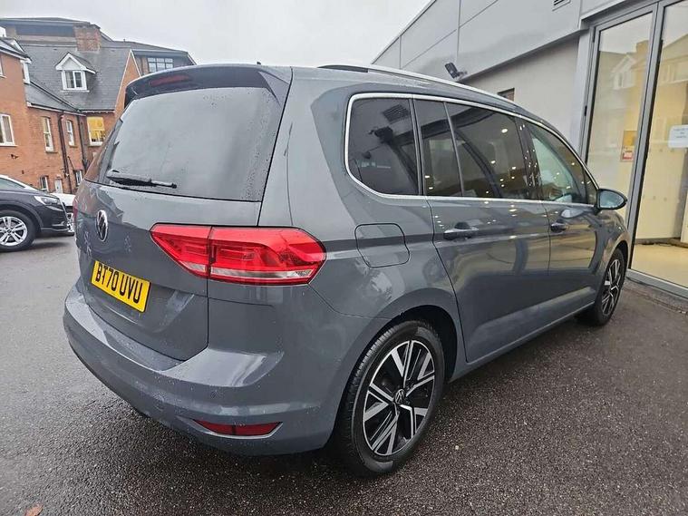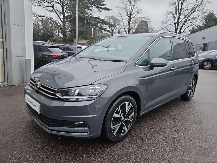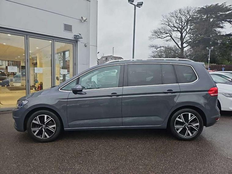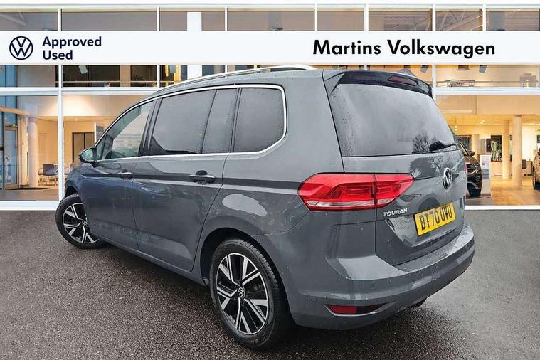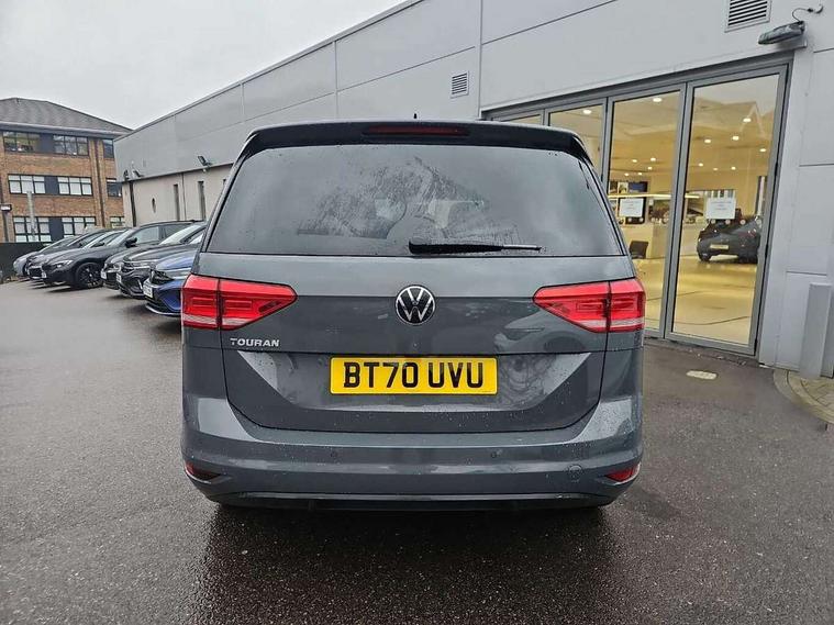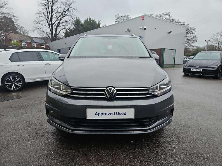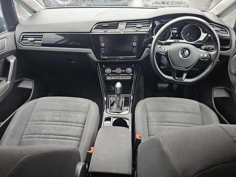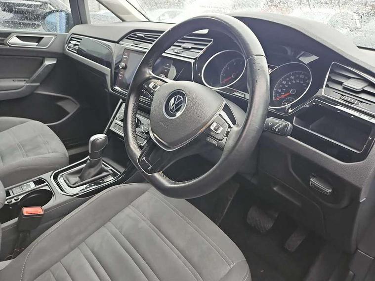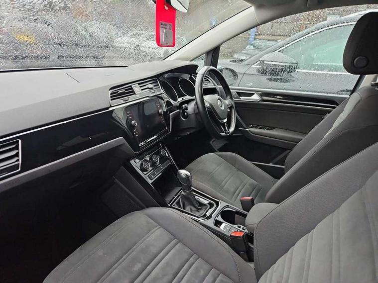 Adaptive cruise control, Audible lights on warning, Bluetooth telephone connectivity, Car information display, Driver alert system, Driver electronic voice amplification function, Electronic odometer, External temperature gauge, Flat tyre indicator, Mobile pairing with SMS function, Multifunction colour display, Rev counter with fuel gauge, Speed limiter, Speed sensitive power steering, Stop/start system, Think blue trainer driver tips and journey analysis, Trip and service interval display, Petrol Particulate Filter, XDS electronic differential lock, 4x20 watt output, Audio Connectivity System, DAB Digital radio, MP3/WMA compatability, SD card slot, Title and cover art display, USB connection, Aerial integrated into side window, Body colour bumpers, Body colour door handles, Body colour door mirrors with integral indicators, Chrome fog light surround, Chrome lower front bumper insert, Chrome trimmed front air intake surrounds, Chrome trimmed radiator grille louvre inserts, Chrome trimmed side windows, Dusk sensor + auto driving lights, Electric folding door mirrors with reverse activated kerb-view adjustment on passenger's door mirror, Front and rear electric windows, Front fog lights with static cornering function, Fully galvanised body, Gloss black finish B pillar, Green tinted heat insulating glass, High level third brake light, Rear tinted glass from B-pillar backwards approx 65% tinted, Rear wash/wipe with intermittent wipe setting, Silver roof rails, Tailgate wiper- reverse gear activation, Twin chrome exhaust tailpipes, Volkswagen roundel, Windscreen wipers intermittent wipe, 12V power point for Row 2, 12V socket in luggage compartment, 2 individual fold flat 3rd row seats, 2 three point seatbelts in 3rd row, 2nd row centre armrest, 2nd row centre seat converts into table, 3 single slide/fold/removable 2nd row seats, 3 spoke steering wheel, 3 Zone electronic climate control with automatic air recirculation, 3x3 point seatbelts on 2nd row with height adjust on outer seats, 4 boot load lashing points, 4 way adjustable front head restraints, 5 headrests, Ambient lighting in door trim and foot well, Driver and front passenger under seat drawer, Dust/pollen filters, Foldable front passenger seat backrest, Front + rear carpet mats, Front and rear reading lights, Front centre armrest with storage compartment, Front cupholders x 2, Front seat storage pockets, Front seatback folding tables, Height adjustable driver's seat, Height/reach adjust steering wheel, Illuminated glovebox, Illuminated vanity mirrors, Instrument lighting white adjustable panel illumination with red night time illumination, Interior light with delay, Isofix on 2nd row outer seats, Isofix on 3rd row seats, Large storage compartment in roof console, Leatherette on rear of front seats, Low tunnel 2nd row seat, Media box in dashboard on passenger side, Multi storage in passenger/luggage areas, Multi-function centre console with storage facilities, Retractable luggage cover, Split folding rear seat backrests, Storage bins on all doors, Convenience Pack - Touran, Mirror pack - Touran, 3 point height adjustable front seatbelts, Auto hold function, Automatic post collision braking system, Door open warning reflectors, Driver/Front Passenger airbags, Drivers knee airbag, EDL + ASR, Electronic parking brake, Energy recovery system, ESC with ABS, First aid kit, Front and rear (row 2) curtain airbags, Front assist including city emergency braking, Front seat side impact airbags, Front/rear disc brakes, Hill hold control, Hydraulic Brake Assist (HBA), Loose wheel warning function, Manual passenger airbag deactivation function, Pre crash preventive occupant protection, Seatbelt warning lamp and buzzer, Traction control, Two tone horn, Warning triangle, Alarm with remote central locking and interior protection, Electronic engine immobiliser, Chrome plated instrument surrounds, Piano black decorative inserts, Tyre mobility system,