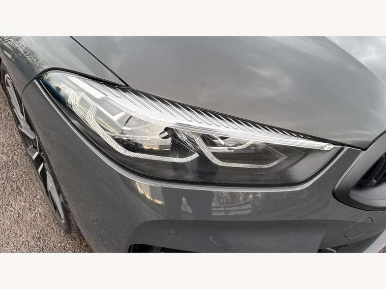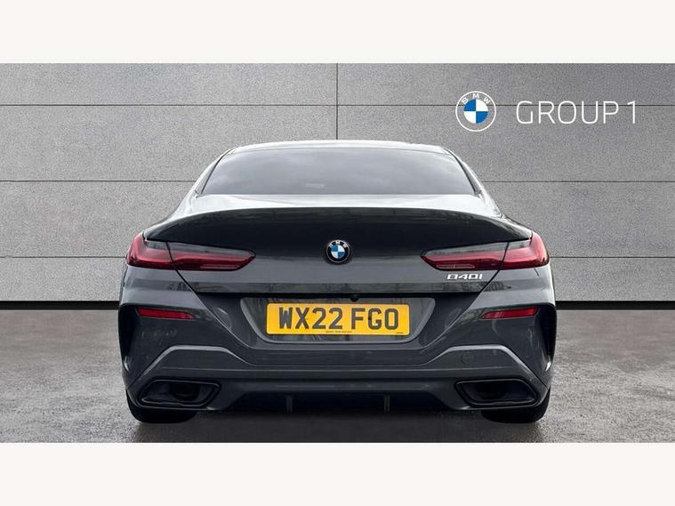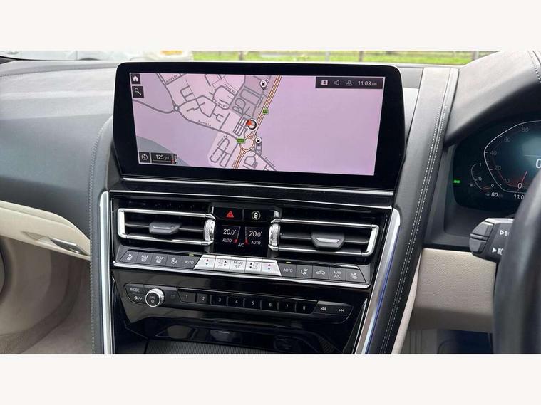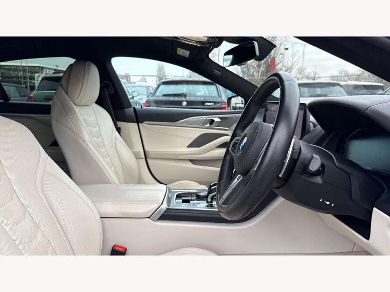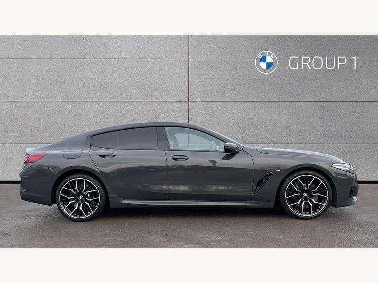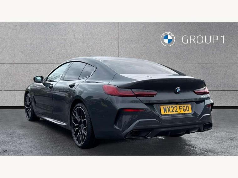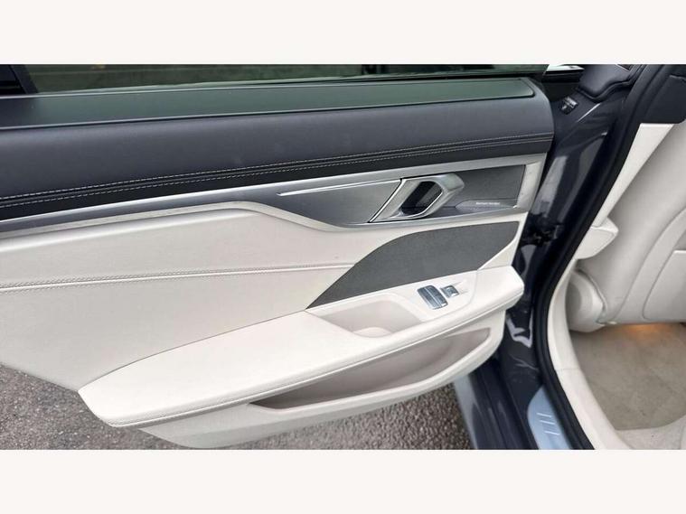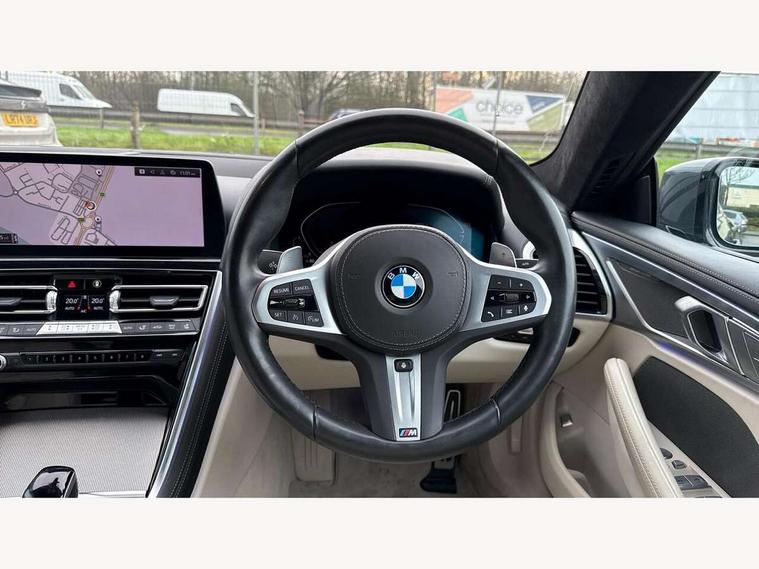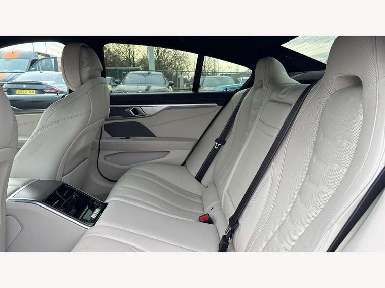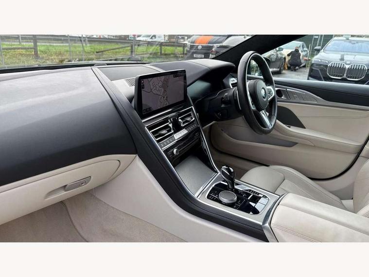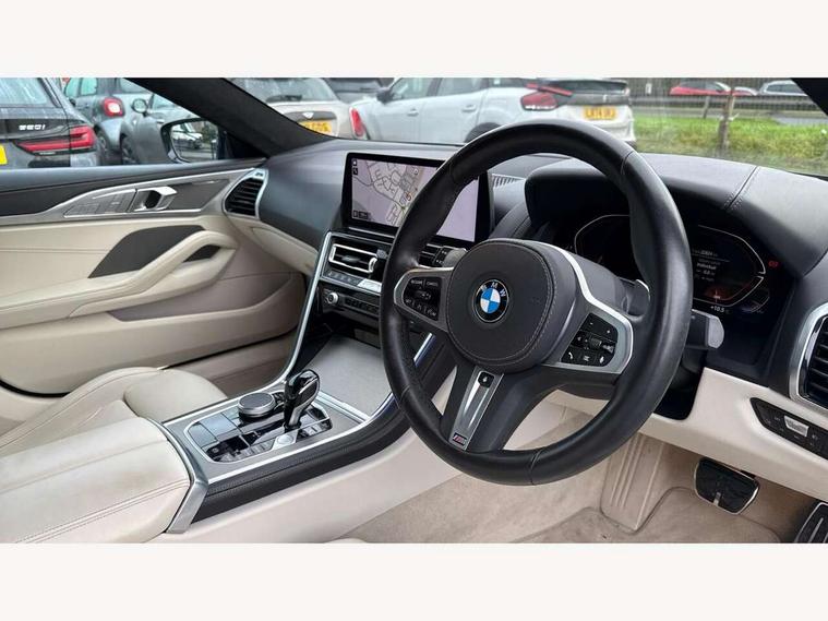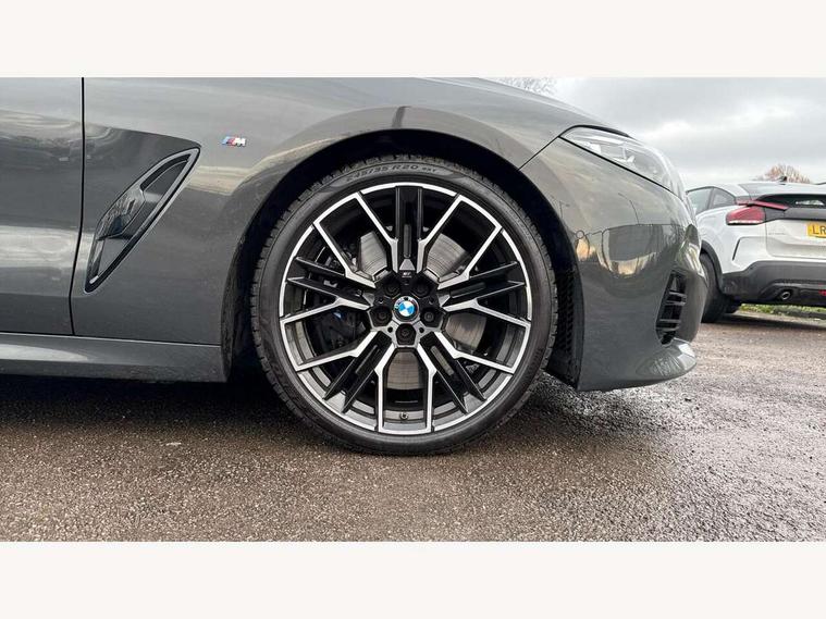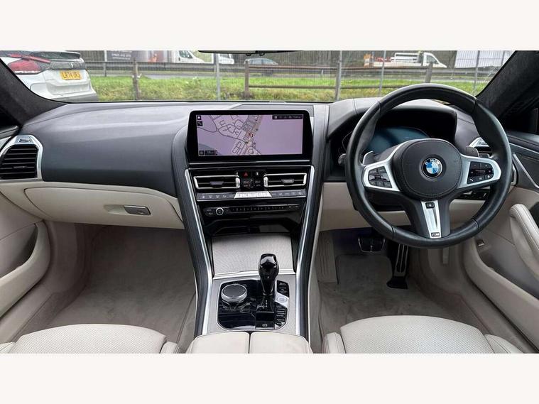 Automatic tailgate operation, remote opening with key, closing by tailgate button or remote control including tailgate in LED technology, Bluetooth hands free facility with USB audio interface, voice control and enhanced bluetooth + Wireless charging, BMW ConnectedDrive online services, BMW legal emergency call, BMW Teleservices, Brake pad wear indicator, Check control system, Condition based service, Drive experience control with Sport, Comfort, Eco Pro and Adaptive modes, Electric bootlid, Head up Display, iDrive controller with shortcut buttons, Instrument and upper door panel in walknappa leather, Integrated owners handbook, Light on warning, Oil sensor for level and grade, On board computer, Outside temperature display, Run flat indicator, Service interval indicator, Servotronic system, Speed limiter, Wi-Fi hotspot, Adaptive M suspension, Double wishbone front axle, Dynamic Damper Control, Eight speed sport automatic transmission, M Sport differential, Petrol Particulate Filter, Sport exhaust system, DAB Digital radio, Favourite buttons, Air breather inlay in pearl chrome, frame in black high gloss, Automatic windscreen wipers and automatic headlight, Carbon core, Climate comfort windscreen, Daytime driving lights front and rear active, Dynamic brake lights, Exterior mirrors - Floating design mirror, electric adjust/heated/folding, aspherical, Follow me home headlight function, Frameless interior mirror, Front and rear bumper system with replaceable deformation elements, Front electric windows, Front ornamental grille with kidney grille bars, Heated rear window, glass, Heated windscreen washer jets, High beam assistant, Illuminated door handles, LED rear lights, M emblem on front side panel in light chrome, Model logo on right tailgate, Radiator grille frame in pearl chrome, Radiator grille struts in aluminium matt, Rain sensor and automatic driving lights control, Rear boot, Rear side wing doors, sDrive designation on left tailgate, Sun protection glass, Thermally insulated windscreen, Third LED technology brake light in rear window, Welcome lights in interior and door handle area, Window frame and mirror base in black high gloss, 2 cup holders in front, 2 rear head restraints, 2 X front 12v power sockets, 3 spoke M sport leather multifunction steering wheel with shift paddle, 4 zone control automatic air conditioning, 5 seats, 50/50 split folding rear seat, Ambient light with dynamic interior light, BMW ID, Front and rear seat heating, Front centre armrest with light, 12V socket and USB and storage compartment, Front door pockets, Front entry lights doors, Front reading lights, Front sun visors with ticket holder and illuminated mirror, Interior lighting - Interior light front centre above interior mirror, luggage compartment light, automatic interior light system soft on/soft off, Lashing eyelets, Lockable glove compartment with light, Microfilter and active carbon filter, Steering column with adjustable height and length and activation via control on the steering column, Through loading function, BMW Live cockpit professional pack - 8 Series, Connected professional pack - 8 Series, Exterior items pack - 8 Series, M sport exterior styling aerodynamics pack - 8 Series, 18" M Sport braking system with blue painted brake calipers, 3x3 point rear seatbelts, ABS/EBD, Active protection, Airbags - Driver and front passenger airbag with seat occupancy detection, knee, side and front passenger seat airbag deactivation, Brake discs, compound structure, Child locks on rear doors, Cornering brake control (CBC), Crash sensor activating central locking release, hazard warning lights, fuel cut off, interior lighting, safety battery terminal clamp and airbags, DSC - Dynamic Stability Control, Dynamic brake control, Dynamic Traction Control - DTC, Electromechanical parking brake with automatic drive away release and auto hold function, Front three point with pyrotechnical belt latch tensioner seat belts, belt force limiter and belt stopper, Head airbags for 1st and 2nd seat row, Hill start assist, Integrated brake system, ISOFIX child seat mounting for the two outer rear seats, Rear three point with pyrotechnical belt latch tensioner seat belts and belt force limiter, Side impact protection, Tyre pressure monitoring system (TPMS), Warning triangle and first aid kit, Alarm system (Thatcham 1) with electronic engine immobiliser, Centre lock switch, Closing system with central locking, Comfort access system, Keyless entry with start/stop button, Locking wheel bolts, Vehicle key with exclusive M designation,