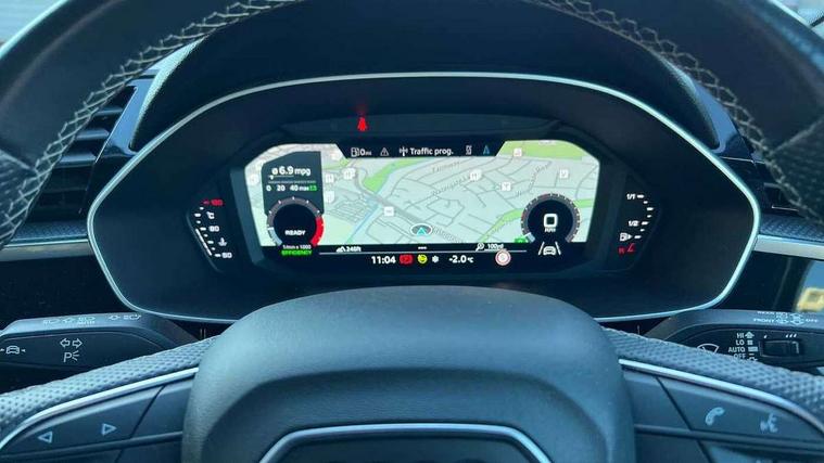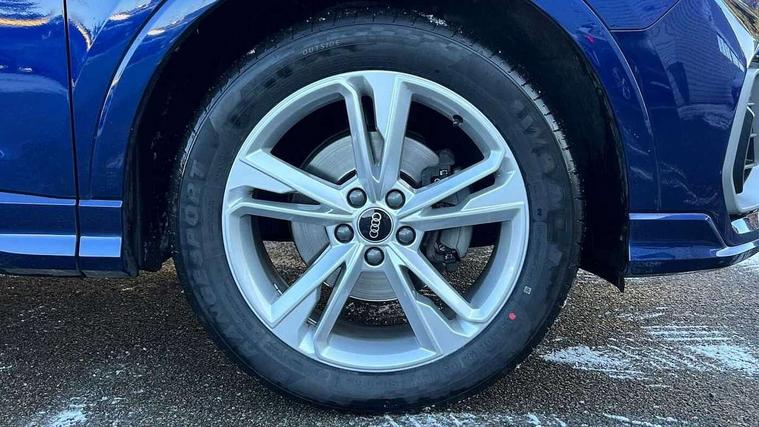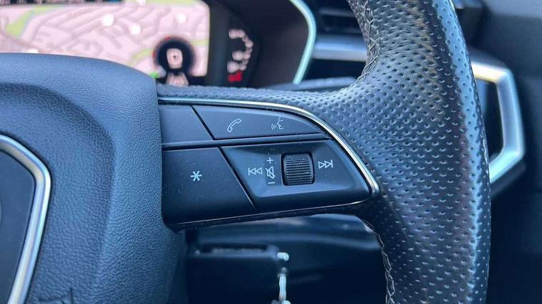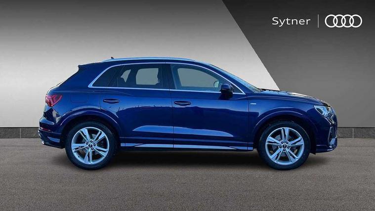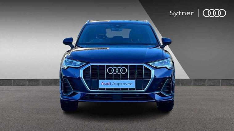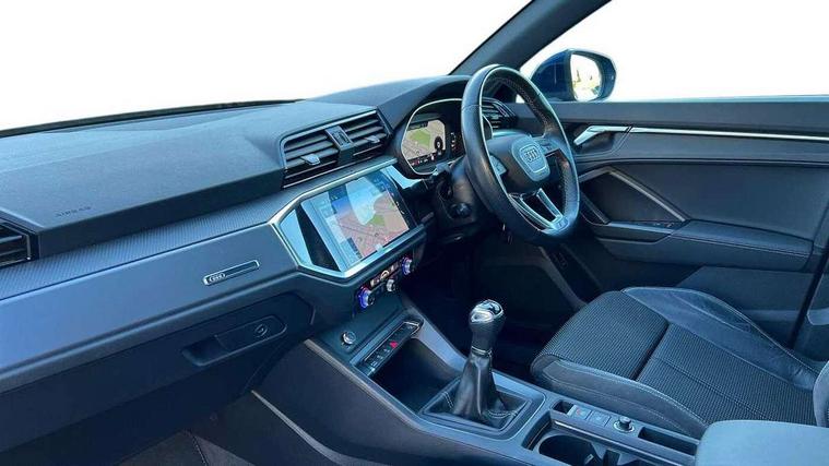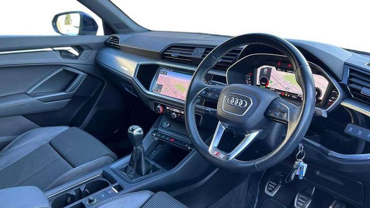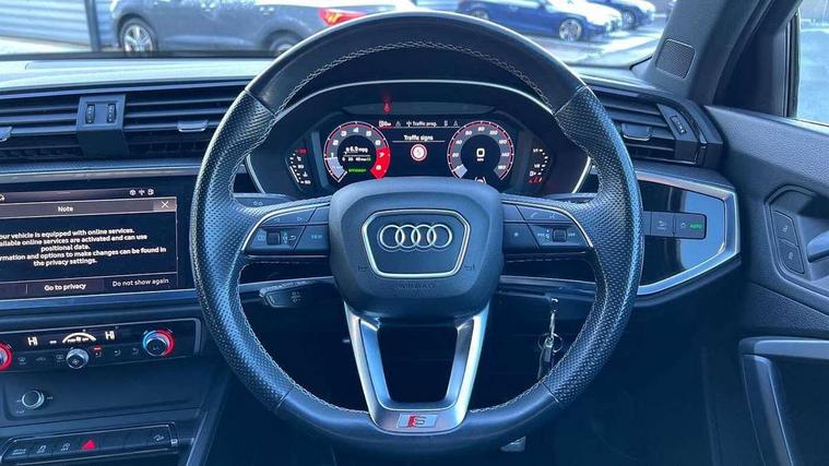Amazon alexa Integration, Audi connect safety and service (e-call), Audi drive select, Audi lane departure warning, Audi Virtual Cockpit - 10.25" display, Bluetooth interface, Camera based traffic sign recognition, Cruise control + speed limiter, MMI Navigation Plus with high resolution 10.1 inch touchscreen colour display, Power operated tailgate, Progressive steering, Rear parking sensors, Service interval indicator, Smartphone interface includes wireless Apple carplay/Android Auto, Start stop system with recuperation, Voice control system with natural language interaction, Sports suspension, 2 USB-C ports with charge and data functions, 6 passive loudspeakers, DAB digital radio module, Acoustic windscreen, Aluminium roof rails, Aluminium window trim, Auto dimming frameless rear view mirror, Body coloured bumpers, Electrically folding, adjustable and heated door mirrors with integrated LED side indicators and kerb view function for passenger side, Front and rear electric windows, Front fog lights, Front side air inlets in matt platinum grey, Front spoiler blade in matt platinum grey, Grille vertical bars in aluminium silver/Matt, High gloss black finish B and C pillars, LED headlights with LED daytime running lights and dynamic rear indicator, LED rear lights, Privacy glass dark tinted rear and rear-side windows (from B-pillar backwards), Rain and light sensors, Rear diffuser strip in matt titanium black, S line badges on front wings, S Line front and rear bumpers, Side skirt insert in matt Platinium grey, Silver chrome grille surround, Titanium black radiator grille, 12V socket in rear centre console, 40:20:40 folding with manual adjustment for 60:40 forwards/backwards position and backrest angle, Adjustable rear seat bench/backrest with centre armrest and cupholder, Black cloth headlining, Dual zone electronic climate control, Front and rear black floor mats with contrast stitching in rock grey, Front and rear headrests, Front and rear roof module including reading lights, Front centre armrest, Glove compartment lighting, Height and reach adjustable steering wheel, Illuminated door sill trims with S logo, ISOFIX child seat mounting for front passenger with airbag deactivation and outer rear seat including top tether attachment point for outer rear seats, Luggage compartment light, Manual front seats with height adjustment, Perforated leather gearknob, Stainless steel luggage compartment sill finisher, Stainless steel pedals, Non smoking pack - Q3, 3x3 point rear seatbelts, 6 airbags - Driver, front passenger, curtain and side windows, Audi pre-sense front with pedestrain and cyclist recognition, Electrically operated child locks on rear doors, Electromechanical parking brake, Electronic stabilisation control including ABS, ASR and EDL, Hill descent control, Hill hold assist, Pre sense basic, Seatbelt monitoring, Tyre pressure warning, Warning triangle and first aid kit, Anti theft alarm, Anti theft wheel bolts, Remote central locking, Dark matt brushed aluminium inlay, Detail dashboard around MMI touch colour display in glass look, black with surround in aluminium look, Leatherette door armrest,