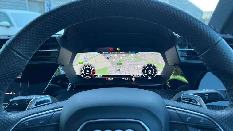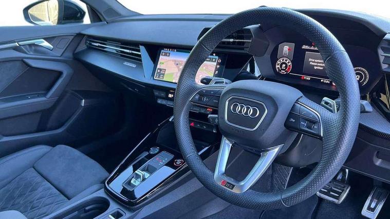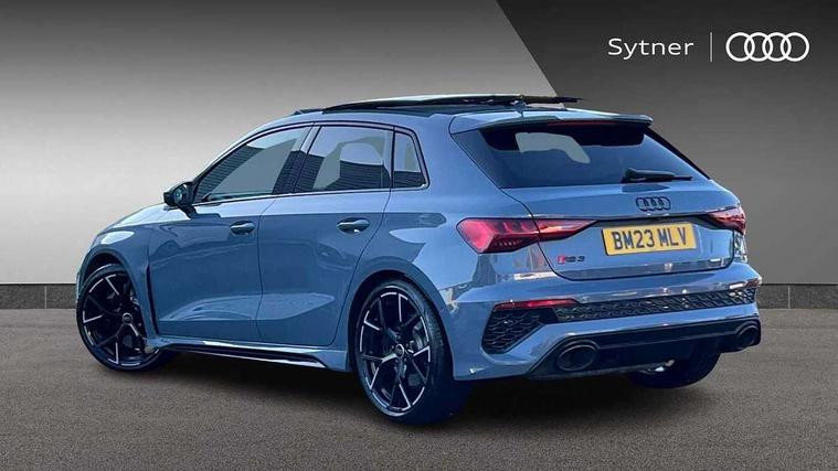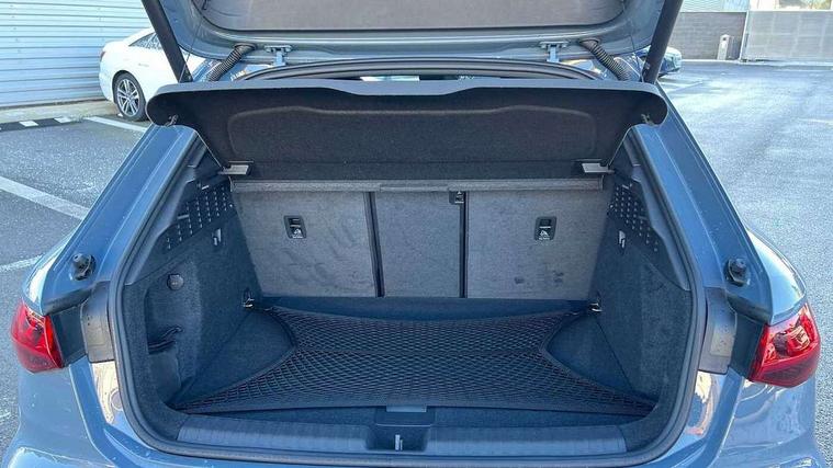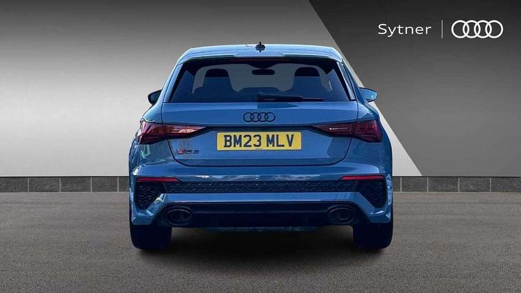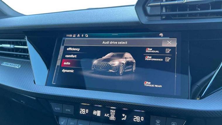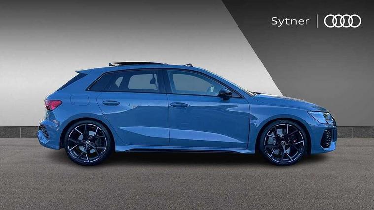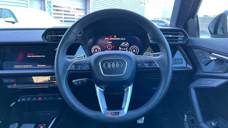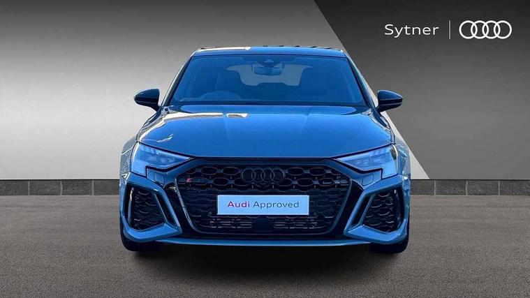Adaptive cruise assist, Adaptive cruise control, Audi smartphone interface, Audi virtual cockpit with RS specific display 12.3" full colour digital instrument cluster, Automatic start/stop system with recuperation, Bluetooth interface, Camera based traffic sign recognition, Collision avoidance assistant, Emergency e-call, Head up Display, Lane departure warning system, Legal emergency call, Parking assist with parking system plus, Power operated tailgate - Luggage compartment lid opens electrically, Progressive power assisted steering, Reversing camera, Quattro permanent four wheel drive, Rear suspension, DAB Digital radio, 3rd brake light, Acoustic glass windscreen, Audi beam uses LEDs to project the Audi sport logo onto the ground as you exit your RS 3, Audi matrix LED headlights, LED rear lights, dynamic front and rear indicators and headlight cleaning system, Auto dimming rear view mirror, Black side skirts, Body colour roof, Carbon exterior door mirror, Carbon fibre engine cover, Daytime running lights, Electric adj heated/folding + auto dimming exterior mirrors with memory + LED indicator + auto kerb side function for passenger side exterior mirror, Front spoiler in high gloss black, Heat insulating glass windscreen, Light and rain sensors, Panoramic glass sunroof, Privacy glass - dark tinted rear and rear side windows from B-pillar backwards, Rear side wing doors, Rear window wiper and washer system, RS exterior features in gloss black, RS sports exhaust system, 3 seat bench in 2nd row, 3 spoke leather multifunction steering wheel with gear shift paddles, 4 way lumbar support for front seats, 40/20/40 split folding rear seat bench, Black cloth headlining, Dual zone electronic climate control, Electrically adjustable front seats with memory function for driver's side, Front and rear headrests, Front centre armrest, Front sports seats RS embossed logo, Front/rear floor mats, Heated front seats, Honeycomb stitching and RS embossing, Illuminated door sill trims inlays in aluminium with RS 3 logo, Illuminated vanity mirror, RS emblems, Single front passenger seat, Stainless steel pedals and front footrest in black, Aluminium interior elements pack - RS3, Ambient lighting pack - RS3, Comfort and sound pack - RS3, Driver assistance pack with 3 spoke leather multi function steering wheel - RS3, MMI navigation plus with MMI touch - RS3, RS bodystyling - RS3, Storage Pack - RS3, 3x3 point rear seat belts, ABS/EBD, ASR, Audi pre sense front, Driver/Front Passenger airbags, EDL, ESC - Electronic Stability Control + traction control, Front passenger airbag deactivation, Front side airbags with head airbags and interaction airbag, Hill hold assist, Seat belt reminder with passenger presence detection in rear, Tyre pressure loss indicator, Warning triangle and first aid kit, Anti theft alarm, Anti-theft wheel bolts, Electronically operated child lock, Remote control central locking, Full decorative carbon trim, 19" 5 Y spoke black with graphic print alloy wheels, Tool kit, Tyre repair kit,