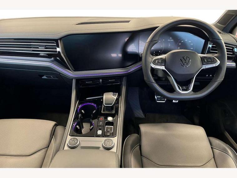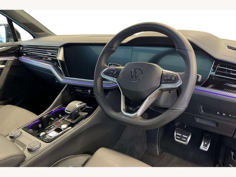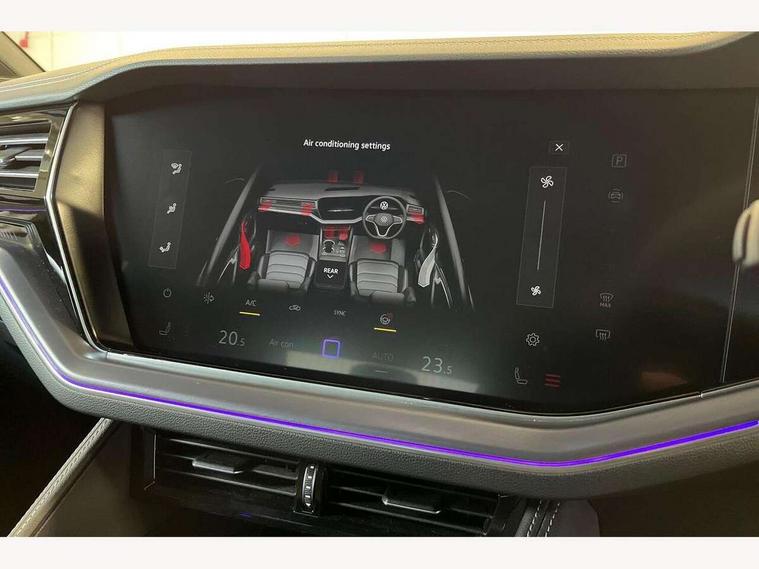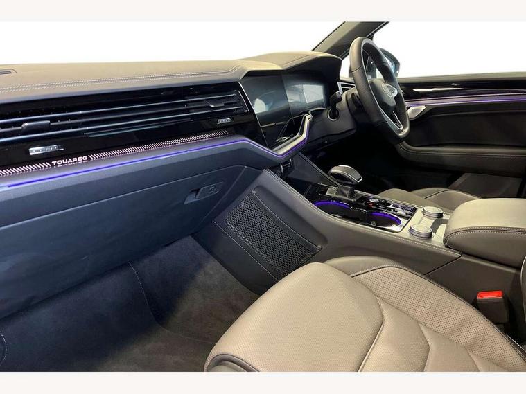 15" Screen Top infotainment system Premium (MIB3), Adaptive cruise control, Advanced driver attention and drowsiness monitor, Driver profile selection, Dynamic road sign display, E-Sim card for online connectivity, eCall emergency system, Innovision cockpit, Intelligent park assist, Mobile phone interface with inductive charging, Multi-colour Active Info display, Park Assist - Sensor controlled steering aid to assist parallel or bay parking, PAS, Warning signal and warning light for front and rear seatbelts not fastened, Wireless app connect, Adaptive chassis control, DAB Digital radio, Diversity antenna for AM/ FM reception, We Connect and We Connect Plus functionality, Automatic coming/leaving home lighting function, Automatic headlights, Black door mirrors, Black style comfort bumpers, Dynamic headlight range control with dynamic cornering light, Electric front tilt/slide panoramic sunroof and fixed rear sunroof, Electrically power adjustable, heated, folding, auto dimming, front passenger exterior door mirror lowering function, External USB type C socket and charging sockets, Gloss black roof rails, HD LED Matrix beam plus digital headlight projection with variable light distribution, Headlight washers, Highway light, LED 3rd brake light, LED daytime running lights, LED rear combination lamp with variable lighting functions and special styling, Poor weather light, Rain sensor, Rear exhaust tailpipe, Rear fog light with back up light on both sides, Rear light bar and illuminated logo, Rear side wing doors, Rear wiper, Stainless steel door sill protection, 12V socket in centre console, 3 rear headrests, 3 seat bench in 2nd row, 4 zone climate control, Airbag label on sun visor and B-pillar, Brushed stainless steel pedals, Double sun visors with illuminated vanity mirrors, Front + rear carpet mats, Front centre armrest, Leather wrapped multifunction sports steering wheel, heated, with touch control and shift paddles, Mechanical rear seat release, Power adjustable lumbar support in front, Power seats in front, right side with memory features and seat cushion depth adjustment, Rear seat backrest and split folding with center armrest, Single front passenger seat, Memory pack plus - Touareg, 3 point seatbelts, outer rear with ECE lable, ABS, Child locks on rear doors, Curtain airbags, Driver and front passenger safety-optimised head restraints, Driver/Front Passenger airbags, Extended pedestrian protection measures, Front assist, Front seat side impact airbags, Generative braking with start and stop system, Height adjustable 3 point front seatbelts with pre tensioners, Passenger airbag deactivate switch, Three 3 point rear seatbelts, Two tone horn, Tyre pressure loss indicator, Warning triangle and first aid kit, Alarm system with interior protection, Easy open and close sensor controlled luggage compartment opening and closing with remote unlocking, Keyless Access Keyless locking and starting system with SAFELOCK, Aluminium decorative inserts, Black decorative trims, Gloss black decorative inserts in centre console, Tool kit,