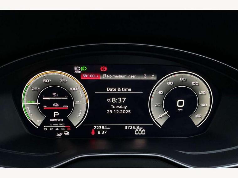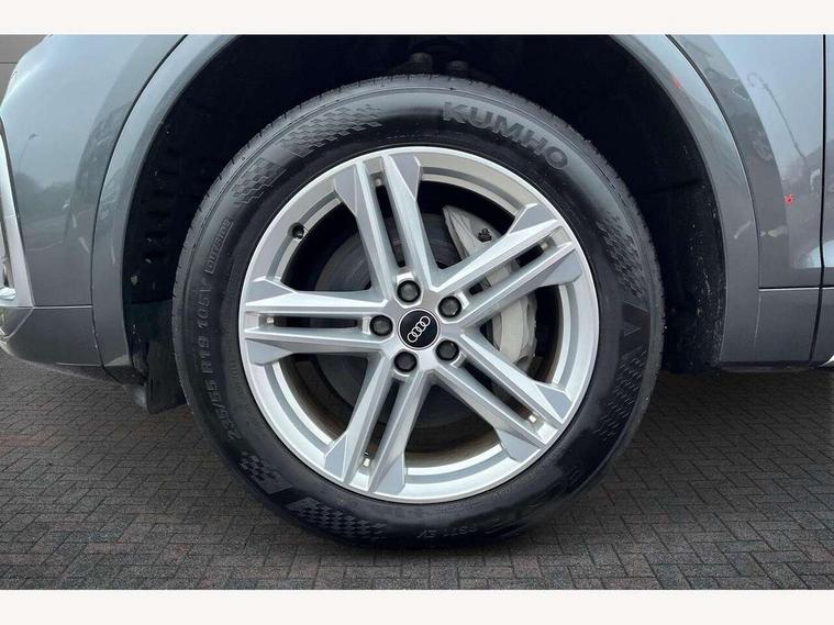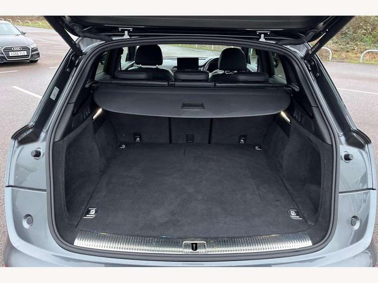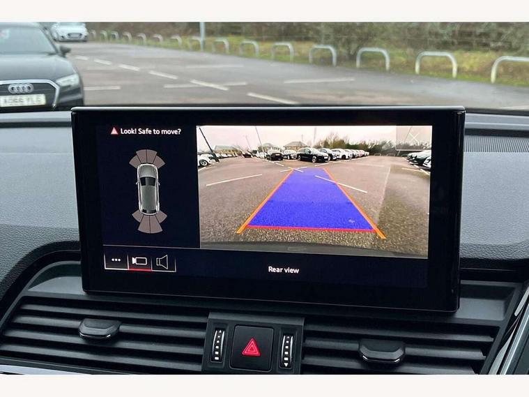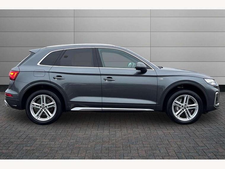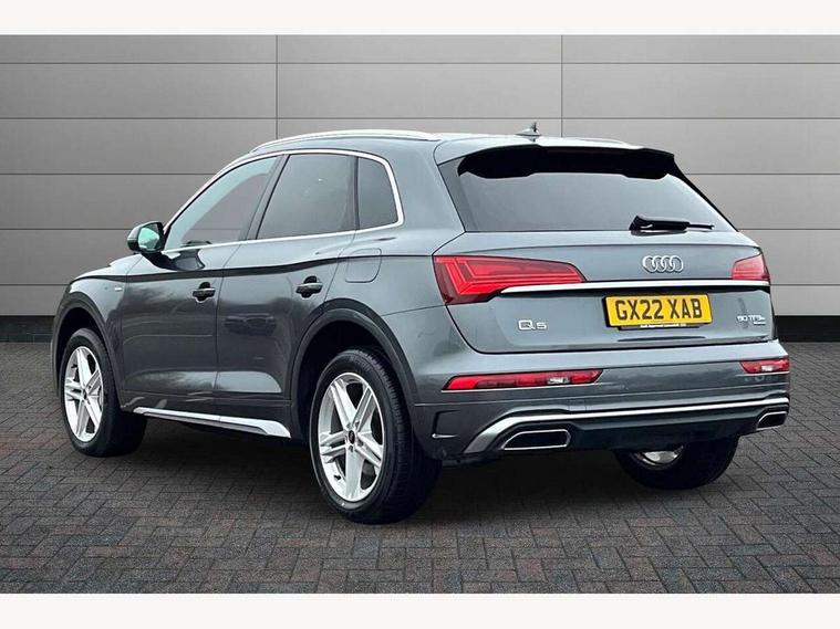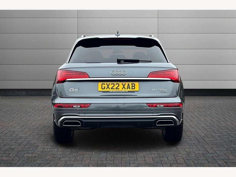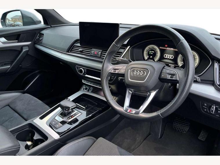 Audi connect safety and service (e-call), Audi connect with Amazon Alexa Integration, Audi drive select, Audi virtual cockpit plus with 12.3" screen and three different layout designs, Audi wireless smartphone interface, Automatic start-stop system with coasting functionality and efficiency programme, Bluetooth interface, Electro - mechanical power assisted steering, MMI navigation plus with 10.1" touch screen, Power tailgate, Reversing camera, Service interval indicator, Voice control system with Audi hotword activation "Hey Audi", 3 pin 10 amp domestic charging cable, 7.4 kW onboard charger, Dynamic suspension, Quattro on demand, Type 2 mode 3 22kW 32 amp charging cable, Type 2 socket for AC charging, 2 x USB charging port with aux input socket, DAB Digital radio, 3rd brake light, Acoustic windscreen, Aluminium roof rails, Audi matrix LED headlights with dynamic front and rear indicators, Auto dimming door mirrors, Auto dimming rear view mirror, Automatic headlights and windscreen wipers, Body colour bumpers, Body colour door mirrors, Body colour rear diffuser with matt aluminium silver surrounds, Body colour underbody protection, Chrome plated exhaust trims, Daytime running lights, Door sills in Selenite silver, Electric adjustable/heated/folding door mirrors, Front air inlet surrounds in aluminium, Front and rear electric windows, Front radiator grille in honeycomb design, Headlight washers, Lower bumpers painted in contrast Manhattan grey, Rear chrome trim strip below lights, Rear privacy glass and rear side windows, Rear side wing doors, Rear wiper, Roof bars, S Line badges on the front wings, S Line front and rear bumpers, S Line rear spoiler, S Line side skirts, 3 rear headrests, 40:20:40 split folding 3 rear bench seat in 2nd row with rear centre armrest, Black cloth headlining, Comfort front centre armrest, Contrast stitching on seats, steering wheel and gear lever gaiter, Deluxe 3 zone electronic climate control, Front/rear floor mats, Gear lever in black leather, Heated front seats, Height adjustable front head restraints, Height/reach adjustable steering column, Illuminated door sill trims with S logo, ISOFIX child seat mounting and top tether, Manual seat adjustment with 4-way electric lumbar support, Rear seat bench plus, Single front passenger seat, Sunvisors with vanity mirrors, Trunk roller cover, High gloss pack - Q5, LED interior light pack - Q5, 3 point seatbelts on all seats, 6 airbags - Driver, front passenger, curtain and side airbags, Electrically operated child locks on rear doors, Electromechanical parking brake, Electronic stabilisation control including ABS, ASR and EDL, Front passenger airbag deactivation, Hill descent control, Hill hold assist, Multi collision brake assist, Pop-up bonnet for pedestrian protection, Pre sense city, Seat belt force limiter, Seatbelt monitoring, Tyre pressure warning, Warning triangle and first aid kit, Anti theft alarm, Anti-theft wheel bolts, Keyless Go access/ignition system, Remote central locking, Matt brushed aluminium inlays, Tool kit, Tyre repair kit,