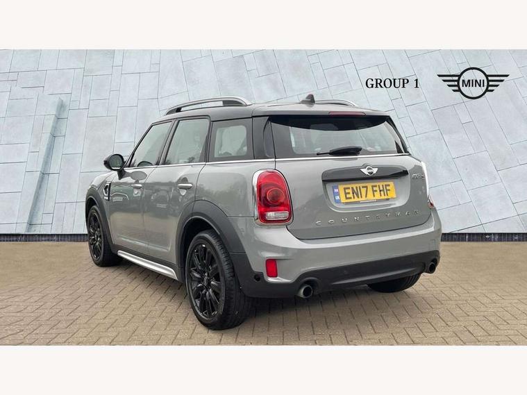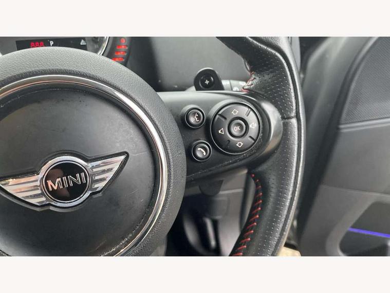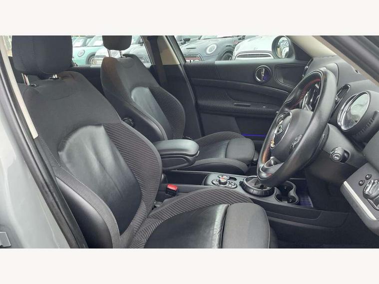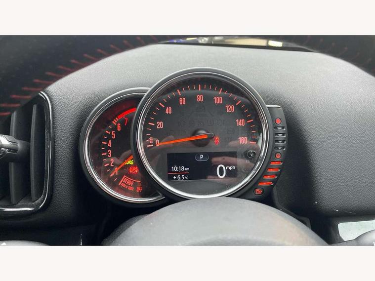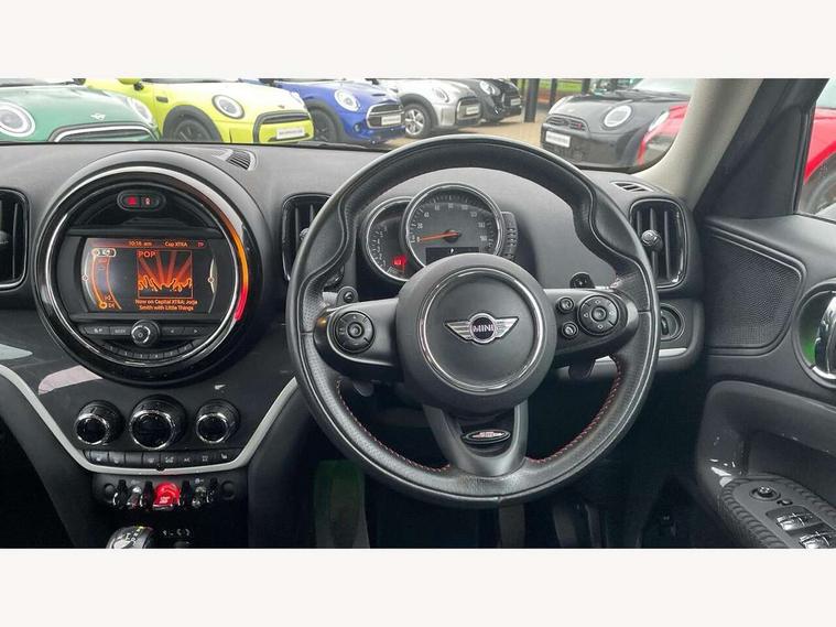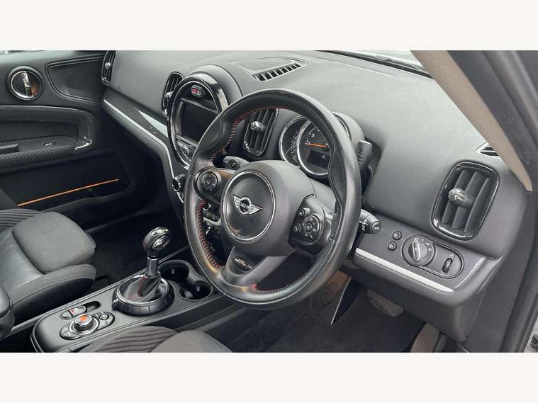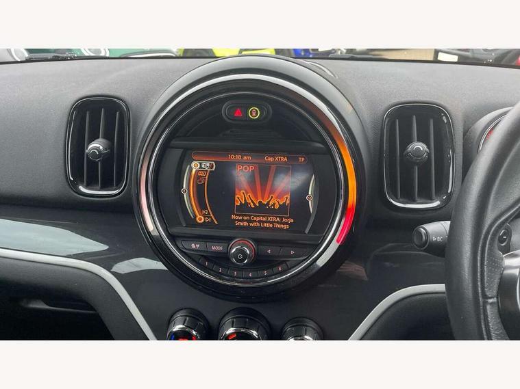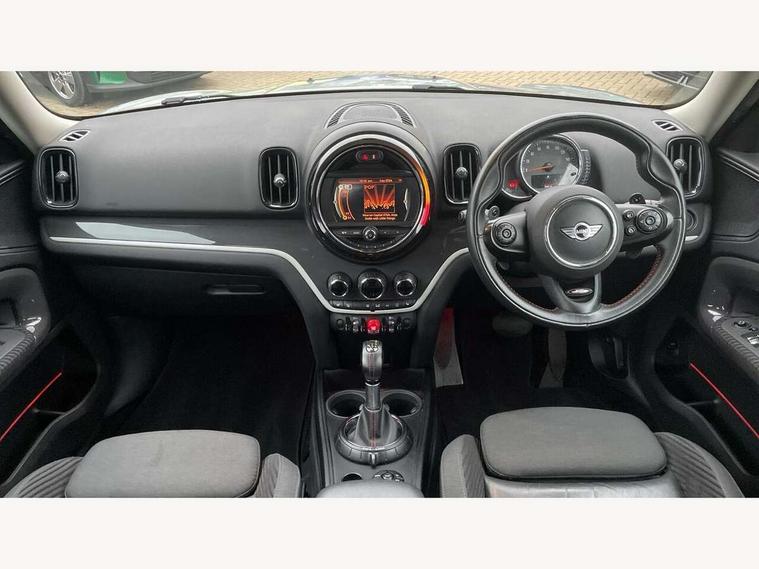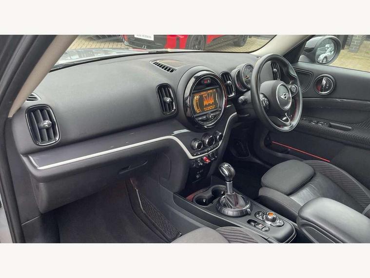Brake pad wear indicator warning light, DTC - Dynamic traction control, Exterior temperature gauge, Intelligent emergency call, MINI TeleServices, Navigation system, On board computer, Personal Profile, Service interval indicator, Servotronic speed sensitive power steering, Electronic differential lock, Performance Control, Auxiliary input socket, DAB digital radio module, MINI Connected, MP3 compatible radio/single CD player, Radio visual boost, Anti dazzle rear view mirror, Body colour scoop integrated into engine- compartment lid, Chrome door handles, Chrome headlight surround, Chrome plated radiator grille, Chrome side scuttle, Chrome window surround, Electric front windows + one touch + anti-pinch, Electrically adjustable door mirrors, Follow me home headlights, Heated door mirrors/heated windscreen washers, Heated rear window with automatic switch off, Metal look door sill finishers, Rain sensor including auto headlights activation, Rear wiper, Twin chrome exhaust tailpipes, White indicator lights, 12V power point front, 2 cupholders in front centre console, 4 lashing points to secure luggage, 40:20:40 split folding rear seats, Centre console storage box, Chrome interior door handles, Driver/passenger sunvisors, Front and rear headrests, Front and rear Isofix child seat preparation, Front and rear velour floor mats, Front centre armrest with storage compartment, Front interior light, Front passenger grab handle, Front seat backrest storage nets, Heater with recirculation function, Height/reach adjust steering wheel, Luggage compartment lighting, Multifunction steering wheel, Rear grab handles, Sensatec gearshift and handbrake, Sport front seats, Storage compartments in doors, Toolkit in luggage compartment, Interior lights pack - Countryman, MINI Excitement Pack - Countryman, 3 point automatic seatbelts, 3 point seatbelts on all rear seats, ABS, Cornering brake control (CBC), Crash Sensor - activates hazard/interior lighting + unlocks doors, Driver and passenger airbags, Driver and passenger side airbags, DSC - Dynamic Stability Control, Electronic brake force distribution, Electronic parking brake, Front curtain airbags, Front passenger airbag deactivation, Fuel cut off safety device, Hill start assist, Pyrotechnically pre-tensioned front seatbelts, Tyre pressure warning, Automatic door locking, Keyless Start, Locking wheel bolts, RF remote control central locking, Second remote key, Thatcham category 1 alarm + immobiliser,