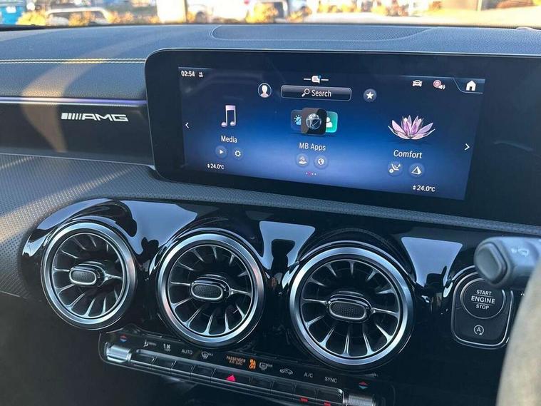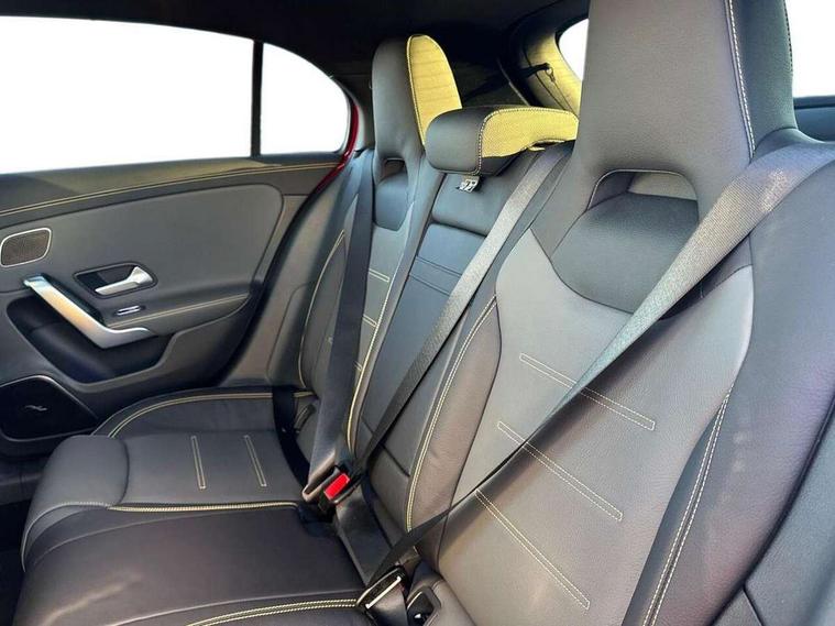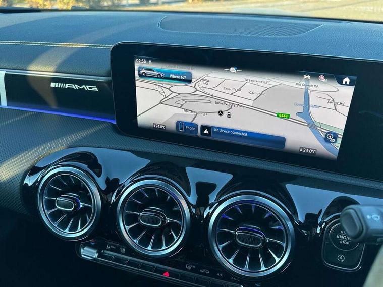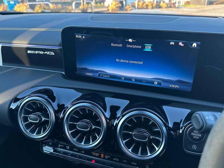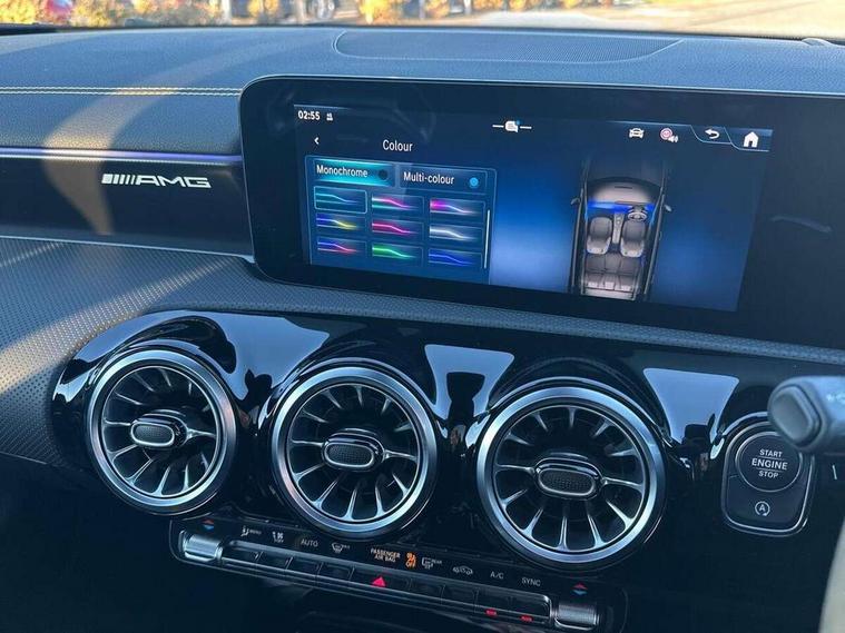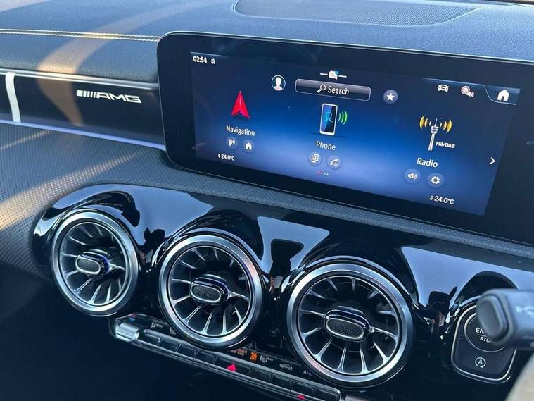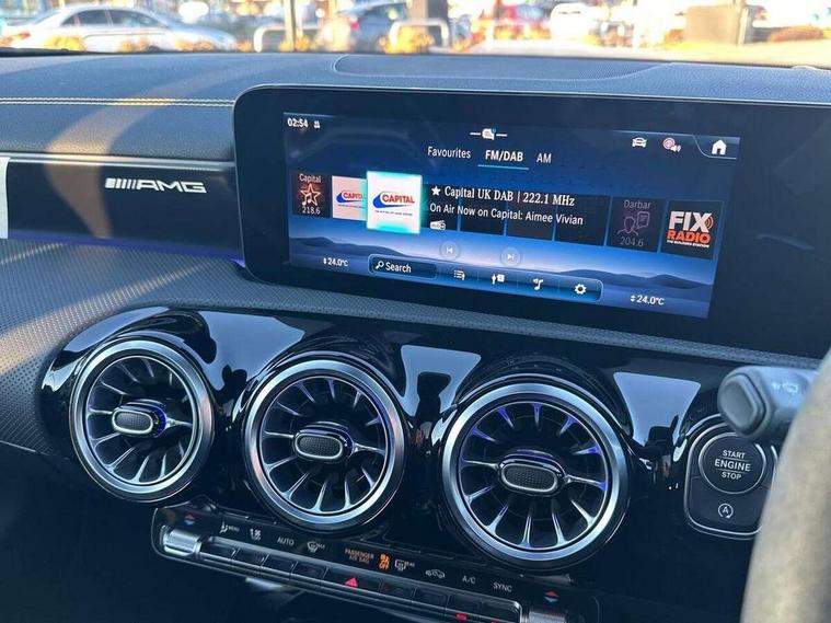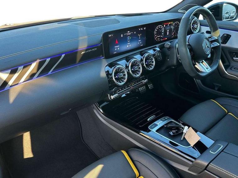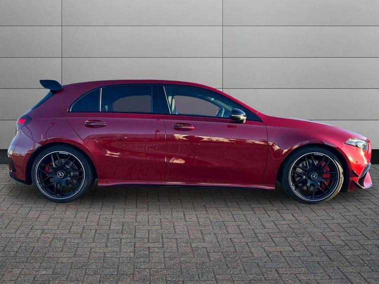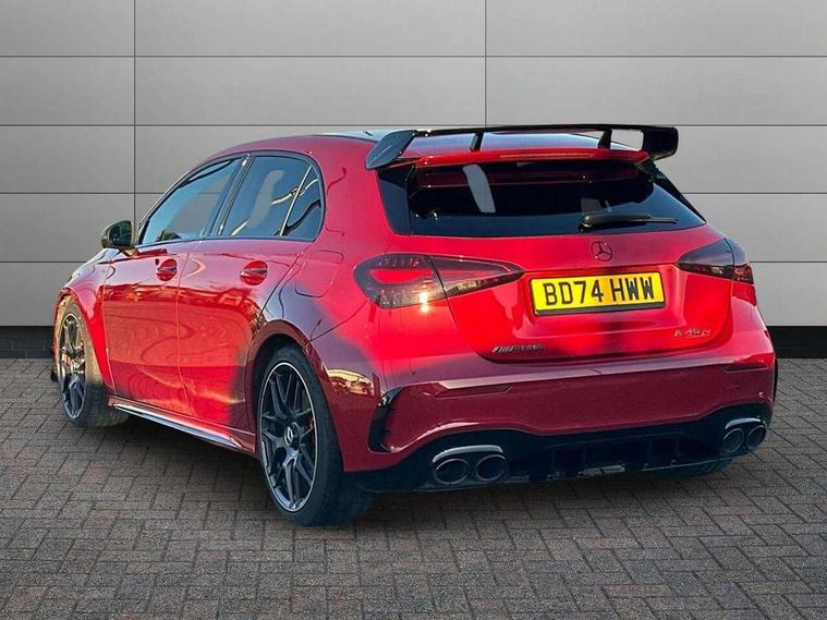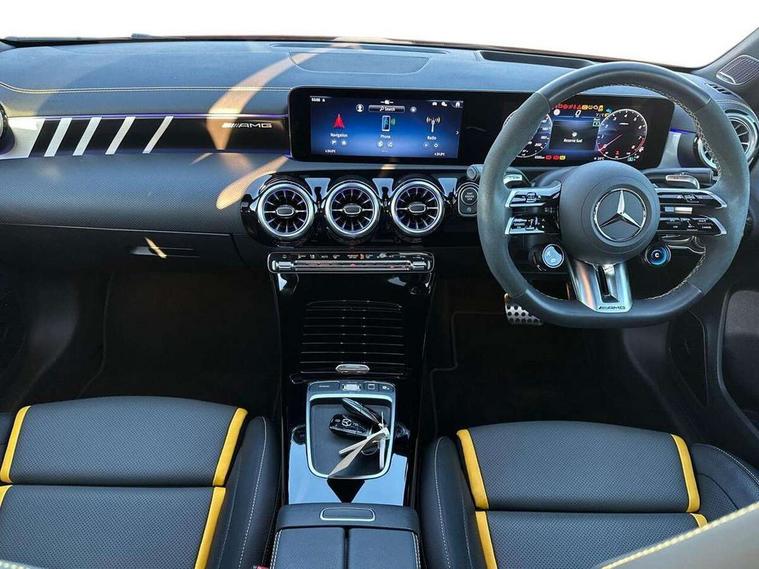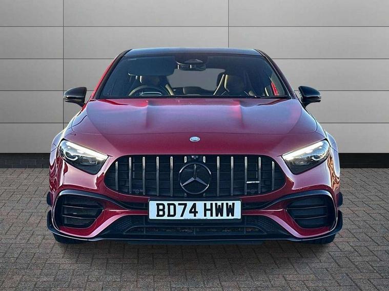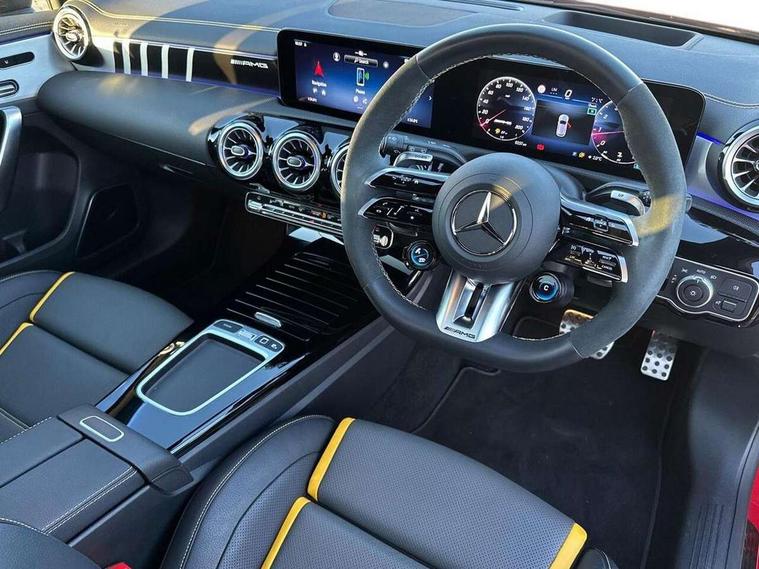 10.25 inch touchscreen central media display with AMG specific, AMG start up logo, visualisation of the AMG drive programs, vehicle and engine data, 10.25" Digital instrument cluster display screen, AMG DYNAMIC SELECT with drive modes(Slippery, Comfort, Sport, Sport+, Individual and Race) incl drift mode via steering wheel shift paddles+Race Start, AMG menu with sporty additional information - Gear indicator with yellow M symbol manual mode, Warm Up menu and Set Up menu, AMG speed sensitive steering with two sets of steering characteristics, Attention assist, Brake pad wear indicator warning light, Car wash mode, Direct steering, Dual bluetooth interfaces, ECO start/stop function, Engine start/stop button, Fingerprint scanner, Fluid level warning indicator for fuel, oil, coolant and washer fluid, Fluorescent jacket for driver, Hard-disk navigation, Head up Display, Hey Mercedes Voice activation, Lamp failure indicator, MBUX augmented reality for navigation, MBUX Interior assistant, Mercedes me connect including emergency call system, accident recovery, breakdown and maintenance management, Mercedes me remote services, Outside temperature gauge, Owners manual in English, Pre-installation of private car share, Preinstallation for Mercedes Benz link, Remote boot closing, Service indicator (ASSYST), Smartphone integration with Apple CarPlay and Android auto, Speed sensitive power steering, Tailgate, Traffic sign assist, Trip computer in multifunction display with current consumption indicator, Wireless charging, AMG performance 4MATIC+ with torque control, AMG suspension including AMG specific axles and sporty spring/damper setup, Suspension with adaptive damping system, Burmester surround sound system (590W) with Dolby atmos, speakers - 1 center+4 doors+2 in C pillars, tweeter, subwoofer, DSP amp, burmester lettering, DAB Digital radio, MBUX multimedia system, 4 Electric Front and Rear windows, Adaptive brake lights, AMG A45 S bodystyling -rear apron, four vertical fins, side sill panels, roof spoiler lip, specific front apron, diffuser look and S label on boot lid, AMG real performance exhaust sound system, AMG specific radiator grille in high gloss chrome with AMG lettering, Beltline strips in High gloss Black, Body colour bumpers, Body colour door handles with chrome inserts, Body colour side skirt, Electric adjustable and heated door mirrors with integrated LED side indicators, Headlamp assist automatic headlamp activation, Heat insulating dark tinted rear and rear side windows, Heated glass rear windscreen + timer control, LED daytime running lights, LED High level third brake light, LED tail lamp, Multibeam LED headlamps with adaptive highbeam assist and cornering function, Panoramic sliding sunroof, Privacy glass, Radio aerial, Rain sensing windscreen wipers with two sensitivity settings, Rear fog lights, Rear side wing doors, Rear windscreen wiper, Surround lighting with logo projection, Two round twin tailpipe trim elements each measuring 90 mm in diameter and AMG lettering plus ribbing on the inside of the pipe, Valve control dependent on drive program, Wider wheel arches for AMG wheels, Window line trim strip in black, 3 seat bench in 2nd row, 3 Spoke flattened lower section sporty design AMG Performance steering wheel in nappa leather/microcut microfibre, 40:20:40 split folding rear seats, Air conditioning - Two zone thermotronic luxury automatic climate control with display, AMG brushed stainless steel sports pedals with rubber studs, AMG centre console finished with trim in silver chrome, AMG floor mats, AMG performance seats, AMG sporty centre console with raised front section and integral control switched for manual transmission mode, AMG steering wheel buttons, Automatic child seat recognition sensor, Black air vents with surround in silver chrome, Black roof lining, Electrically adjustable front memory seats including lumbar support and backrest inclination, Front centre armrest with stowage, Front seat head restraints, Height/reach adjustable steering column, Illuminated AMG front door sills with changeable cover, Interior lighting - 64 colour Ambient lighting, Interior mirror with reading lamps in black and frameless, Rear armrest with 2 cupholders, Rear head restraints, Seat occupancy sensor for front passenger seat, Silver coloured aluminium gear shift paddles on steering wheel, Single front passenger seat, Stowage compartment in centre console with retractable cover, Sunvisors with illuminated vanity mirrors, Twin front cupholders, Aerodynamic pack - A Class, AMG Driver's pack - A Class, AMG night pack - A Class, AMG performance high-end seat pack - A Class, Light and sight package - A Class, Mirror package - A Class, Multi-contour seat pack - A Class, Parking pack with 360 degree camera - A Class, Seat comfort pack - A Class, USB pack plus - A Class, Winter pack - A Class, 3 rear 3 point seatbelts, 3 stage electronic stability programme, ABS with Brake Assist, Active bonnet, Adaptive brake assist with hold function and hill start assist, AMG high performance brake system with red painted brake callipers and black AMG lettering at the front, ventilated and perforated brake discs, Black seatbelts, Bonnet with power domes, Childproof locks manually operated for rear doors and electrically operated for rear power windows, Crash responsive emergency lighting, Driver and passenger head and side airbags, Drivers knee airbag, Dual stage driver/passenger airbags, Electronic parking brake, ESP curve dynamic assist, ESP with ASR, Exit warning, Front and rear seatbelt reminder, ISOFIX and top tether child seat fixing points in two outer rear seats, Tyre pressure monitoring system, Warning triangle and first aid kit, Window airbags, Alarm system/interior protection/immobiliser, Guard 360 degree vehicle protection, Keyless entry lock/unlock, Keyless Go, Remote central locking and crash sensor with emergency opening function, Aluminium AMG design black/silver interior trim, 19" AMG