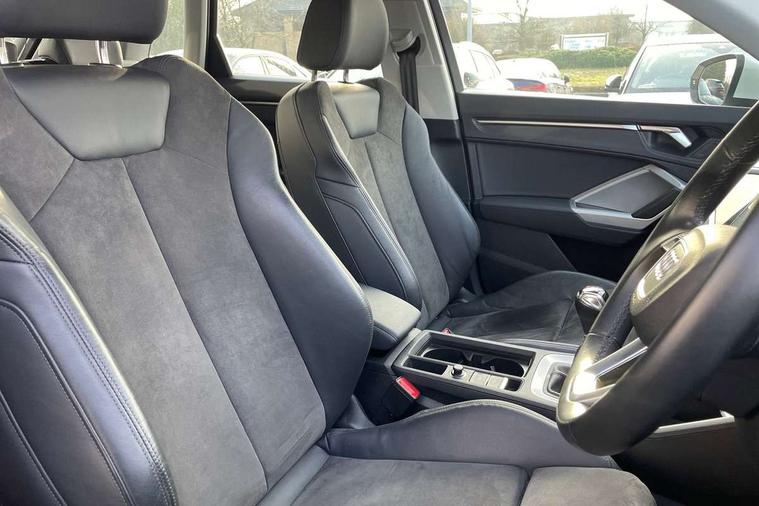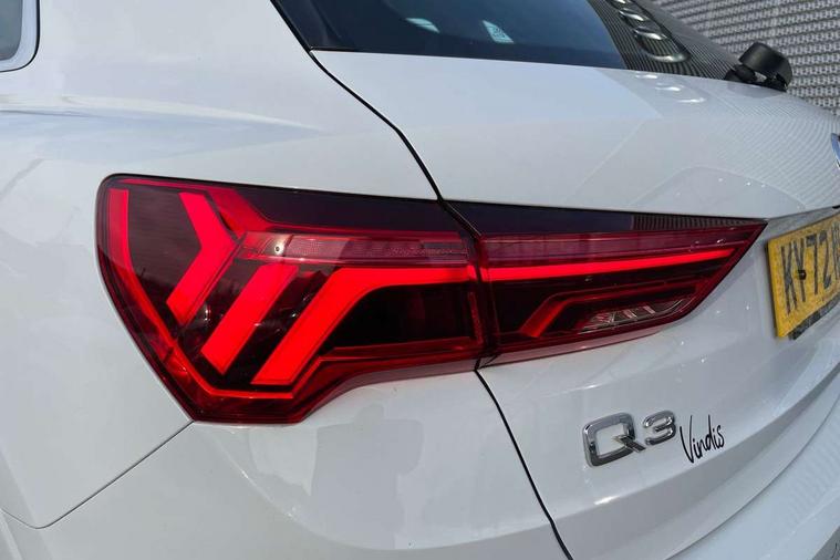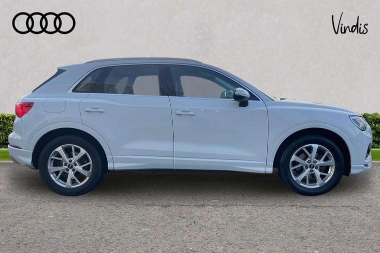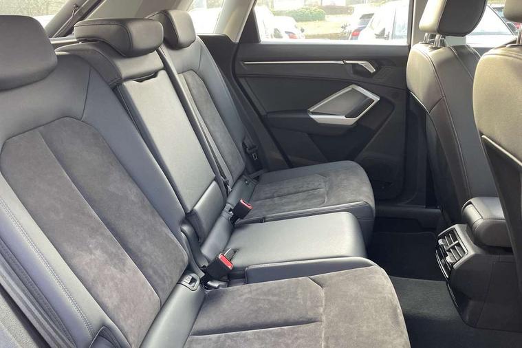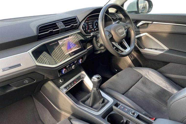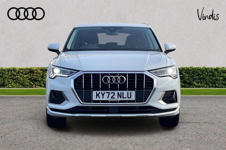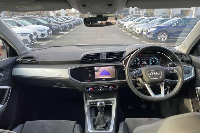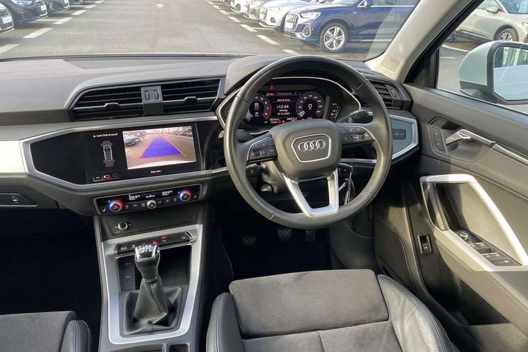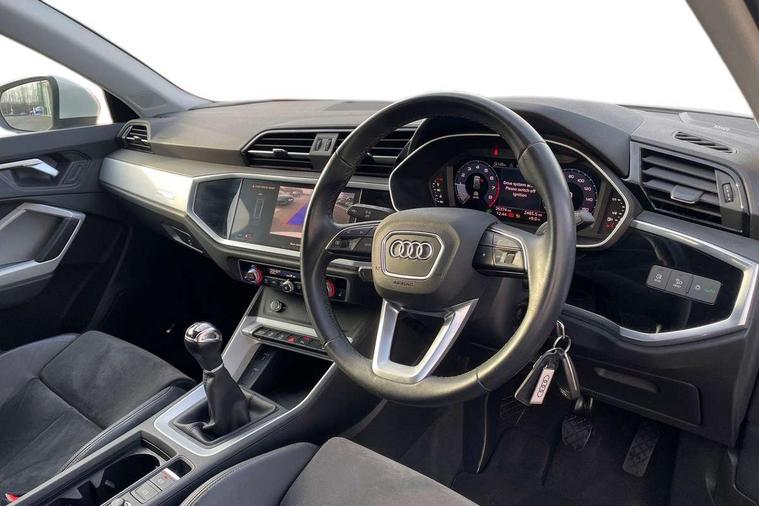 Amazon alexa Integration, Audi drive select, Audi lane departure warning, Audi Virtual Cockpit - 10.25" display, Bluetooth interface, Camera based traffic sign recognition, Cruise control + speed limiter, Legal emergency call, MMI Navigation Plus with high resolution 10.1 inch touchscreen colour display, Power operated tailgate, Progressive steering, Rear parking sensors, Service interval indicator, Smartphone interface includes wireless Apple carplay/Android Auto, Start stop system with recuperation, Voice control system with natural language interaction, Standard suspension, 2 USB-C ports with charge and data functions, 6 passive loudspeakers, DAB digital radio module, Acoustic windscreen, Aluminium roof rails, Aluminium window trim, Auto dimming frameless rear view mirror, Body coloured bumpers, Electrically folding, adjustable and heated door mirrors with integrated LED side indicators and kerb view function for passenger side, Front and rear electric windows, Front fog lights, Front side air inlets in matt selenite silver, Front spoiler in matt selenite silver, Grille vertical bars in aluminium silver/Matt, High gloss black finish B and C pillars, LED headlights with LED daytime running lights, LED rear lights, LED third brake light, Rain and light sensors, Rear diffuser strip in matt selenite silver, Rear side wing doors, Rear wiper, Titanium black radiator grille, Variable front intermittent wipers, 12V socket in rear centre console, 3 seat bench in 2nd row, 3 spoke multi-function leather steering wheel, 40:20:40 folding with manual adjustment for 60:40 forwards/backwards position and backrest angle, Door sill trims with aluminium inlay, Dual zone electronic climate control, Front and rear floor mats, Front and rear headrests, Front and rear roof module including reading lights, Front centre armrest, Glove compartment lighting, Height and reach adjustable steering wheel, ISOFIX child seat mounting for front passenger with airbag deactivation and outer rear seat including top tether attachment point for outer rear seats, Luggage compartment light, Lunar silver cloth headlining, Manual front seats with height adjustment, Single front passenger seat, Stainless steel luggage compartment sill finisher, Non smoking pack - Q3, 3x3 point rear seatbelts, 6 airbags - Driver, front passenger, curtain and side windows, Audi pre-sense front with pedestrain and cyclist recognition, Electromechanical parking brake, Electronic stabilisation control including ABS, ASR and EDL, Front seatbelt reminder, Hill descent control, Hill hold assist, Manual child lock in rear doors, Pre sense basic, Seatbelt monitoring, Tyre pressure warning, Warning triangle and first aid kit, Anti theft alarm, Anti theft wheel bolts, Immobiliser, Remote central locking, Detail dashboard around MMI touch colour display in glass look, black with surround in aluminium look, Micrometallic silver inlay,
