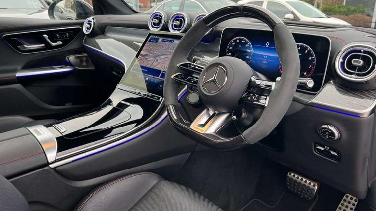 11.9" high resolution multimedia colour display, 12.3" Digital individually configurable instrument display, Acoustic presence indicator, Active lane keeping assist, AMG DYNAMIC SELECT with a choice of driving modes (Slippery, Comfort, Sport, Sport+, Individual), AMG track pace, Attention assist, Bluetooth interface for hands free telephone, Collision prevention assist plus, Dashcam - front camera for video recording, eCall emergency call system, Fingerprint scanner, Fluorescent jacket for driver, Head up Display, Instrument display in miles with English lettering, MBUX augmented reality for navigation, MBUX Interior assistant, MBUX navigation premium, MBUX voice control activated by keywords "Hey Mercedes", Mercedes connect me with remote online services, Multi function trip computer, Outside temperature display, Pre-installation for digital key transfer, Rear axle steering, Remote boot release, Remote services plus, Service indicator (ASSYST), Smartphone integration, Sports direct steer system with speed sensitive steering, Status display for rear seat belts in instrument cluster, Tailgate, Traffic sign assist, Wireless charging system for mobile devices in the front, 4MATIC permanent four wheel drive, 62 litre fuel tank, 9G TRONIC plus automatic transmission, AMG Ride Control suspension, Petrol Particulate Filter (PPF), Burmester 3D surround sound system, DAB digital radio tuner, MBUX extended functions, Sound personalisation, Adaptive brake lights, AMG exhaust system with sporty engine sound, AMG fuel cap, AMG Real Performance Sound, AMG spoiler lip, Auto dimming rear view mirror, Auto headlights, Black roof rails, Digital light LED headlights with projection function, Electric panoramic glass sunroof, Electric windows with one touch opening/closing and obstruction sensors, Electrically adjustable and heated door mirrors, Headlight washers, Heat and noise insulating acoustic glass, Heat insulating dark tinted glass, Heated rear window, High level LED brake light, Integrated LED daytime running lights, LED indicator lights, LED rear fog lights, LED tail lamp, Mercedes AMG exterior, Rain sensor windscreen wipers, Range adjustable headlights, Rear side wing doors, Rear wiper, Transparent Bonnet, Variable front intermittent wipers, Welcome and follow-me home light functionality, Wheel arch liners in the vehicle colour, 3 seat bench in 2nd row, 40:20:40 split folding rear seats, Ambient lighting premium with projection of brand logo, AMG floor mats, AMG Leather upholstery, AMG performance steering wheel in carbon fibre design / MICROCUT microfibre with AMG steering wheel buttons, Artico leather dashboard with contrast stitching, Audio and onboard settings control on multifunction steering wheel, Automatic child seat recognition sensor, Double cup holder in centre console, Electrically height/reach adjustable steering column, Front centre armrest with stowage compartment, Front head restraints, Gearshift paddles on steering wheel, Heated steering wheel, Illuminated door sill panels with AMG lettering and with exchangable cover, Illuminated glove compartment, Load compartment cover, Mercedes AMG interior, Partition net, Rear head restraints, Rear top tether child seat ISOFIX attachment, Single front passenger seat, Sports pedals with stainless steel surfaces and rubber studs, Sun visors with illuminated vanity mirrors, THERMATIC automatic climate control, AMG Driver's package - GLC AMG, AMG dynamic plus pack - GLC Coupe, AMG Exterior Night pack - GLC Coupe AMG 63 Se, AMG Exterior Night pack 2 - GLC AMG, AMG performance high end seat pack - GLC, Boot comfort package - GLC, Easy tailgate pack - GLC, Exterior carbon-fibre package 1 - GLC AMG Edition Midnight, Interior lighting pack - GLC AMG, Keyless-Go comfort package - GLC, Memory pack - GLC, Mirror pack - GLC AMG, Parking package with 360 degree camera - GLC, Stowage space package - GLC, USB Plus Pack - GLC, 3 rear 3 point seatbelts, Active bonnet, Anti-lock braking system (ABS), Automatic front passenger airbag deactivation, Child proof door locks, Dual-stage airbags - driver and front passenger, driver knee bag and window bags for driver, front passenger and rear passengers, Electronic key chrome surround, Electronic parking brake, Electronic stability programme (ESP) with curve dynamic assist and cross wind assist, Front and rear seatbelt reminder, Front passenger seat occupancy sensor, Front seatbelt pretensioners, Hill start assist, Tyre pressure monitoring system, Warning triangle and first aid kit, Anti theft alarm system with preinstallation for collision detection, Central locking with interior switch, automatic locking and crash sensor with emergency opening function, Guard 360 degree vehicle protection plus, Immobiliser, Increased anti-theft protection, AMG Carbon fibre with centre console in high gloss black, 21" AMG Y spoke light alloy wheels painted in matt black with high sheen rim flange, TIREFIT with tyre inflation compressor,